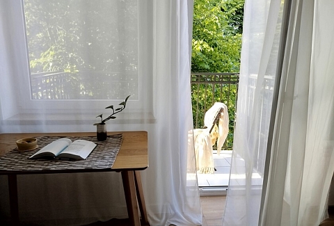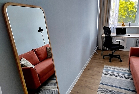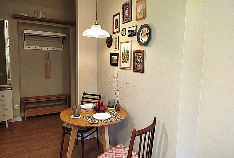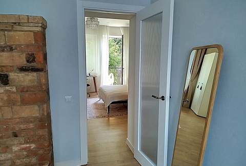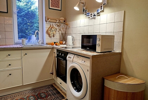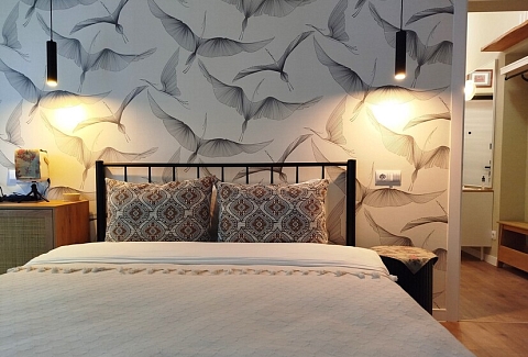 В номере: диван, зеркало, кровать двуспальная, стол, стулья, шкаф, гладильная доска, духовой шкаф, кондиционер, микроволновая печь, мини-холодильник, набор посуды, плита электрическая, стиральная машина, сушилка для белья, телевизор ЖК, утюг, чайный набор посуды, электрочайник