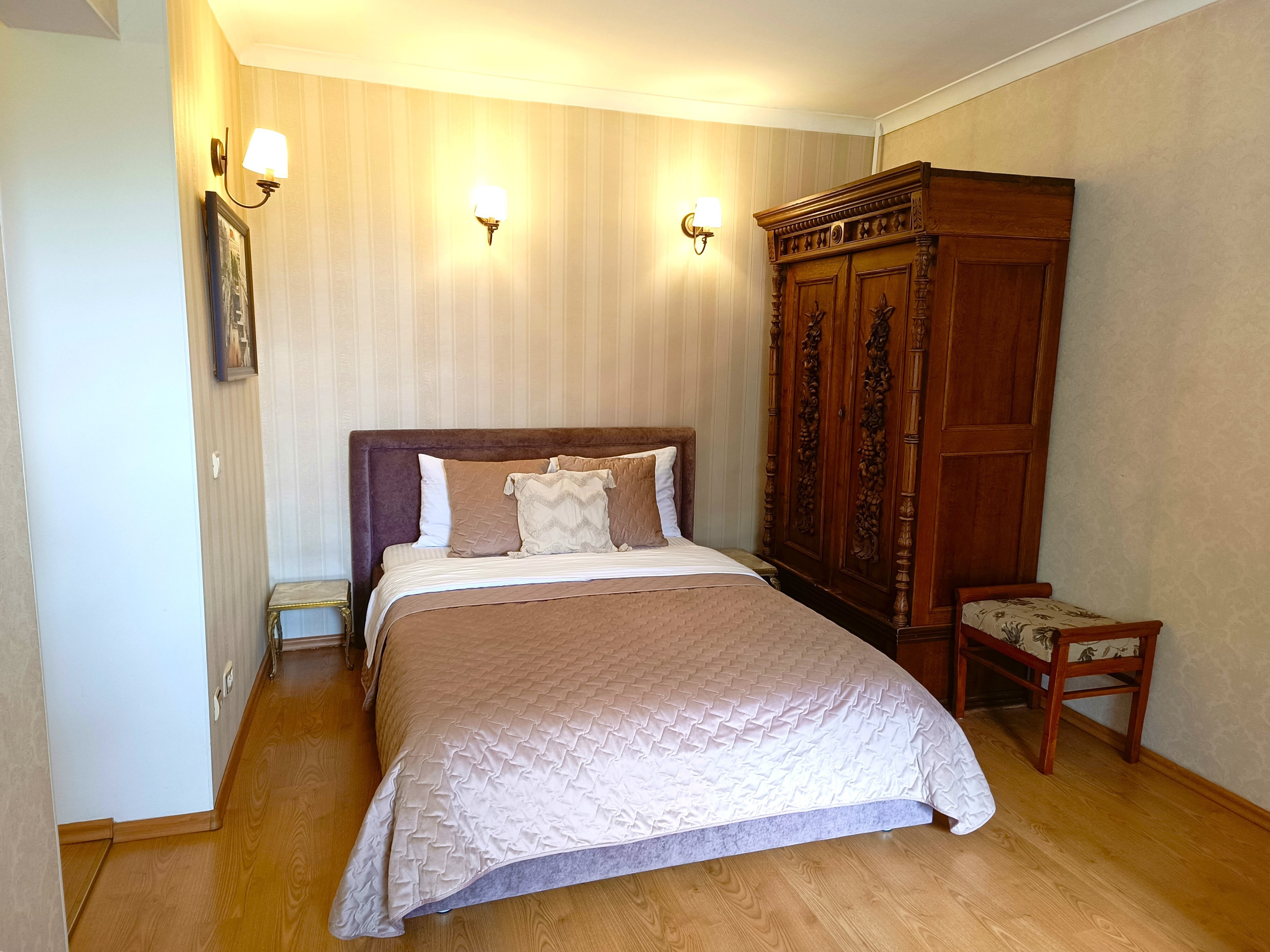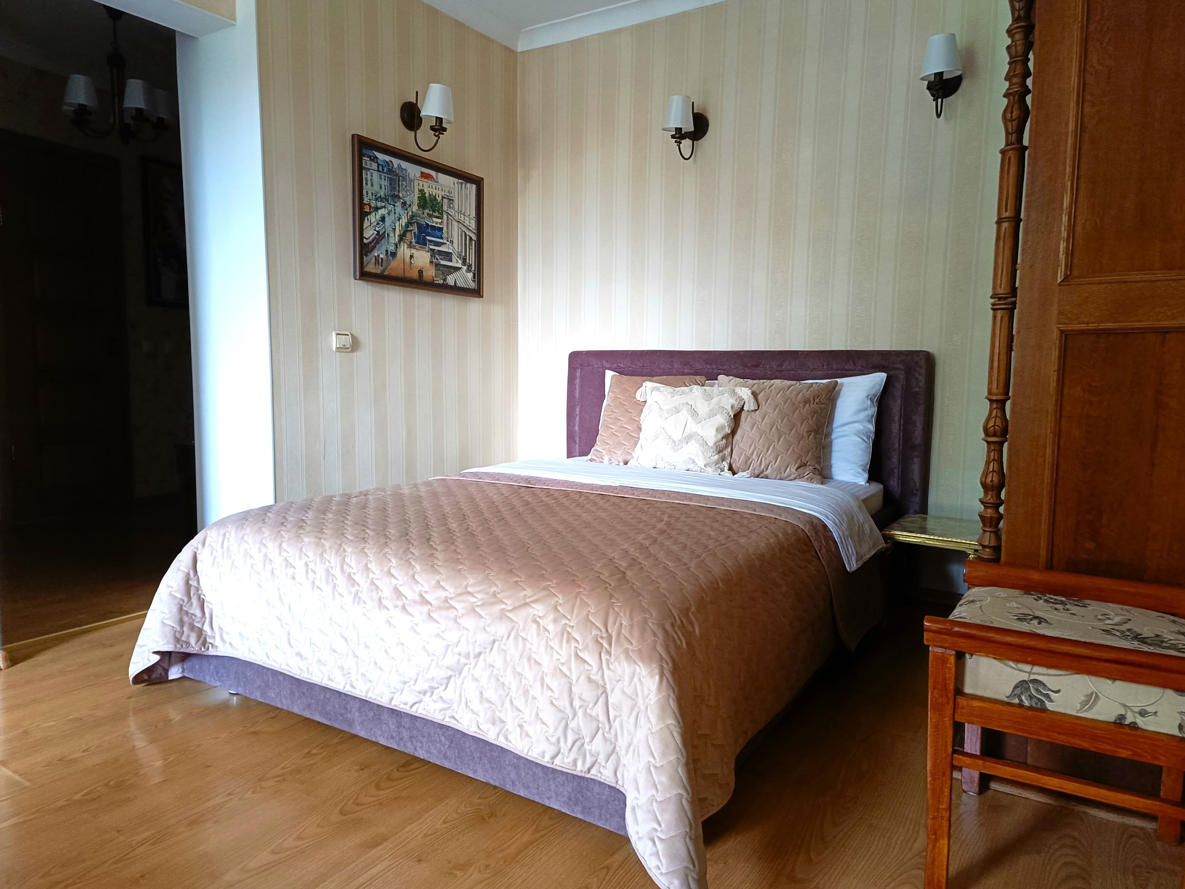 Для отдыха здесь есть двуспальная кровать с очень комфортным ортопедическим матрасом и телевизор с доступом к стриминговым сервисам. Кухня полностью готова к приготовлению еды: имеется вся необходимая техника и посуда. В ванной комнате гостей ждут свежие белоснежные полотенца, фен и базовые гигиенические принадлежности. Для работы или общения всегда доступен высокоскоростной Wi-Fi.Это пространство, продуманное до мелочей, чтобы путешественник чувствовал себя свободно и спокойно в любое время суток. А если поездка планируется с ребёнком, достаточно лишь предупредить об этом заранее, и организаторы позаботятся о том, чтобы в апартаментах появилось всё необходимое для маленького гостя.