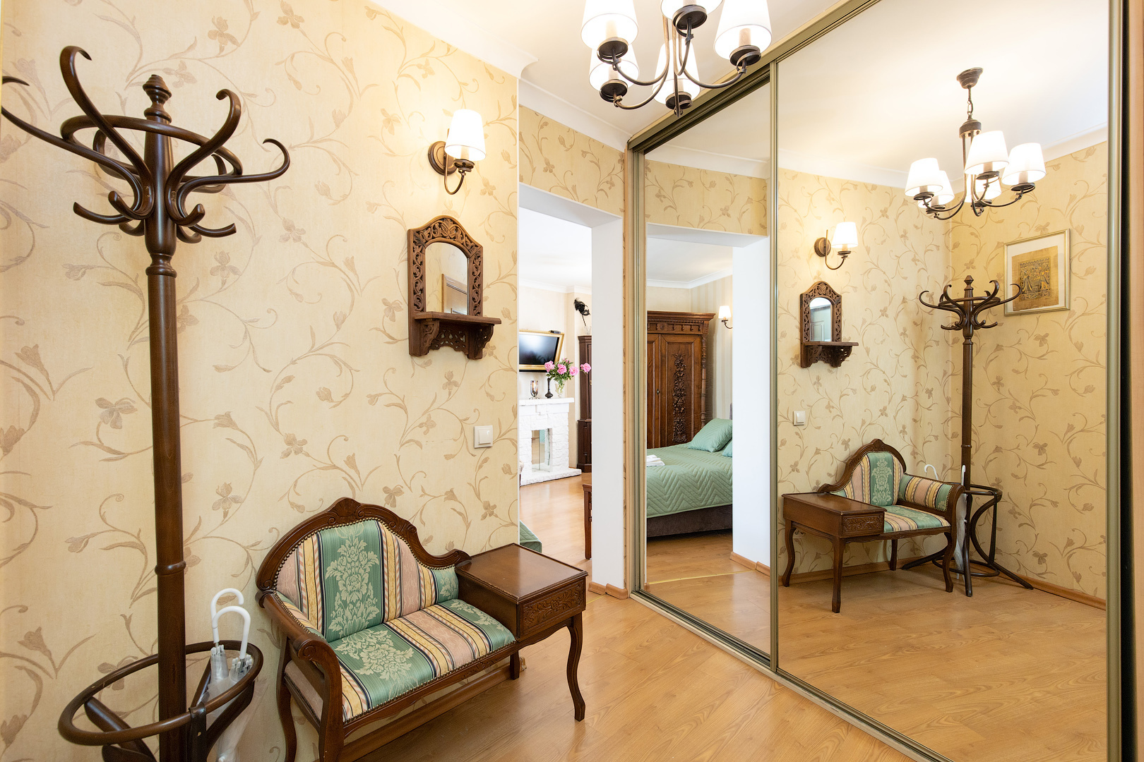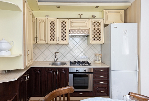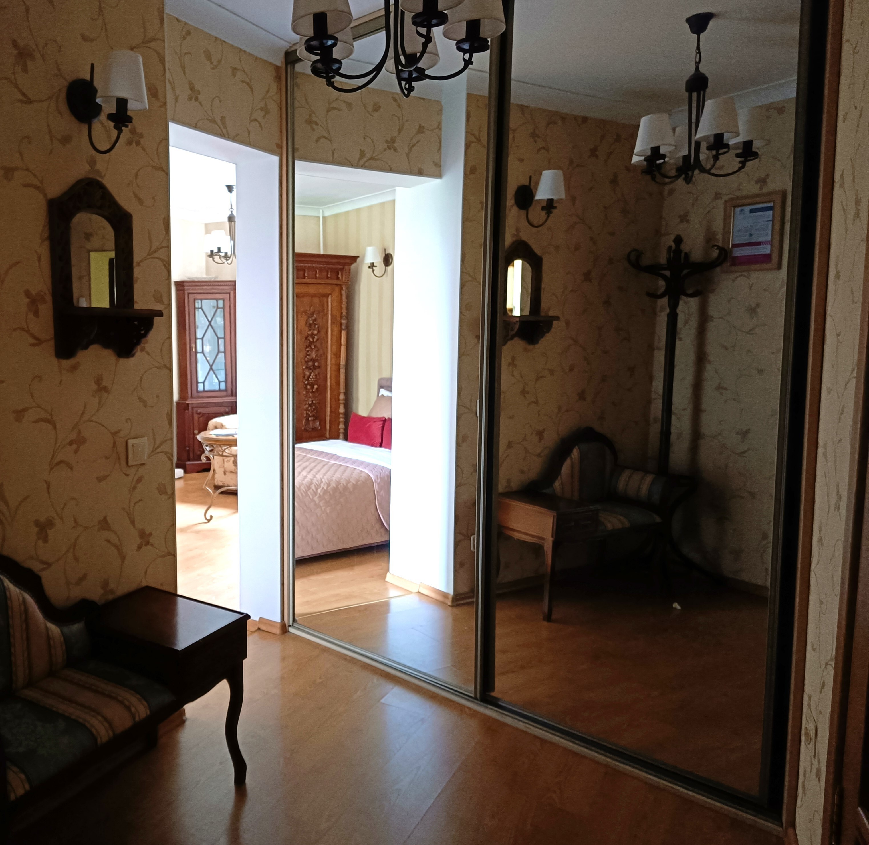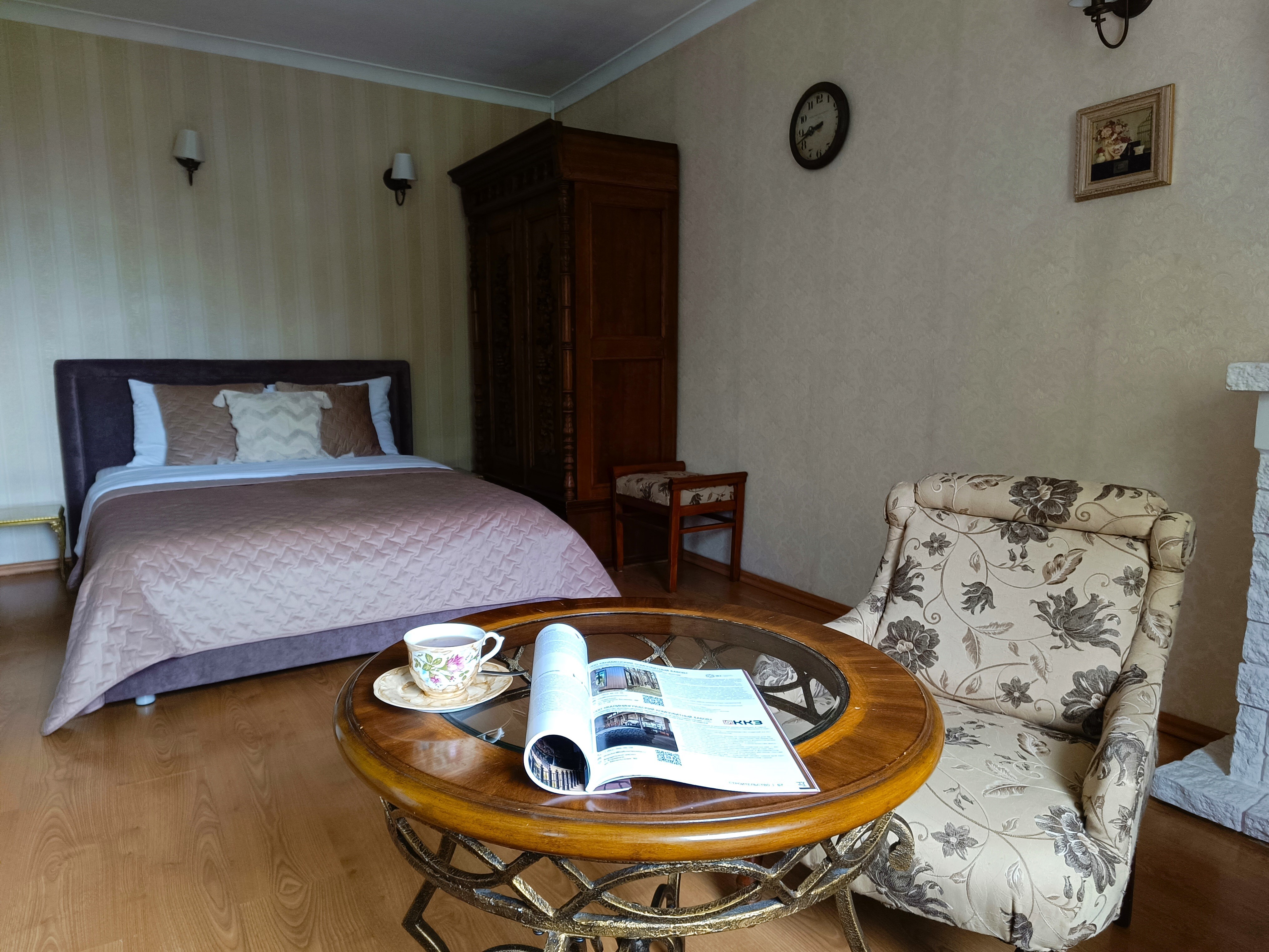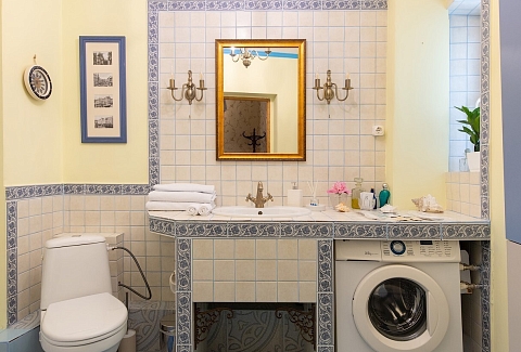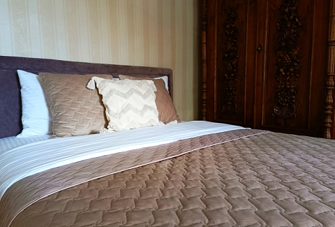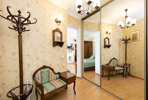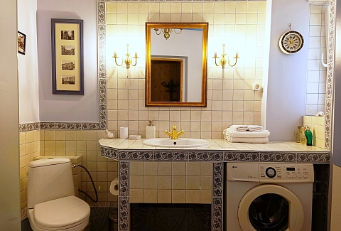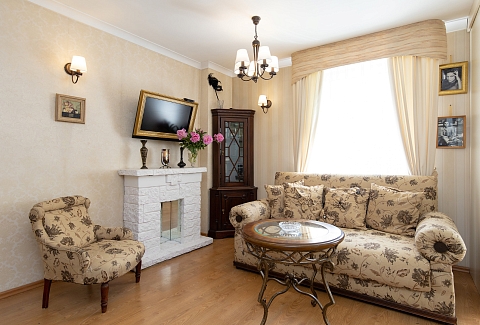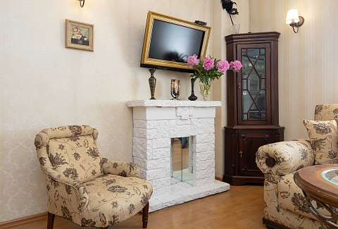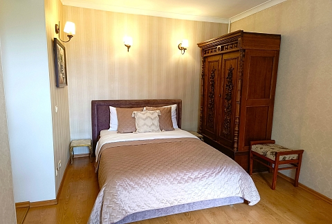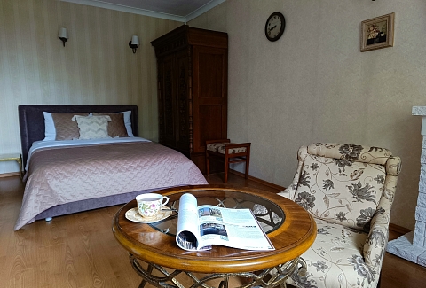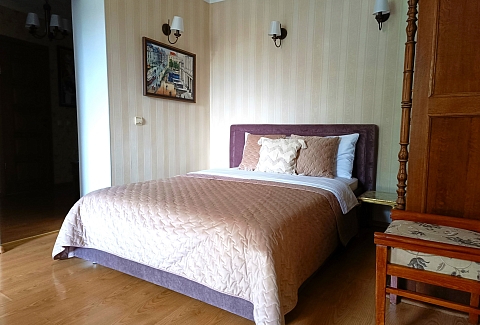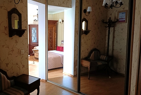 В номере: диван, зеркало, комод, кровать двуспальная, стол, стулья, шкаф, микроволновая печь, набор посуды, плита газовая, стиральная машина, сушилка для белья, телевизор ЖК, утюг, холодильник, чайный набор посуды, электрочайник