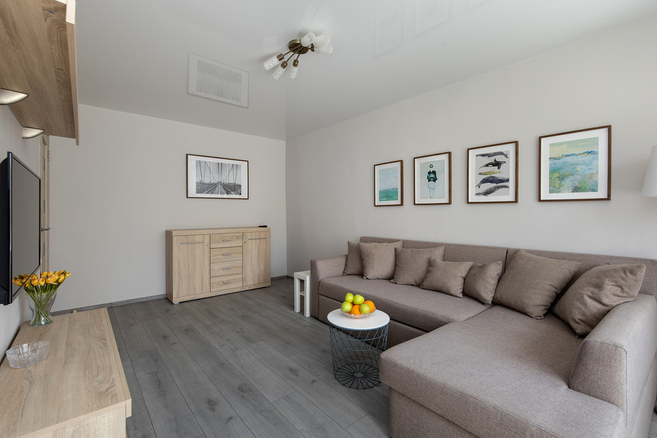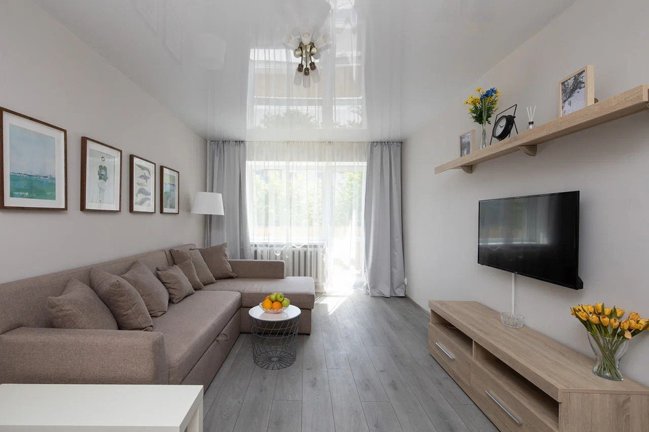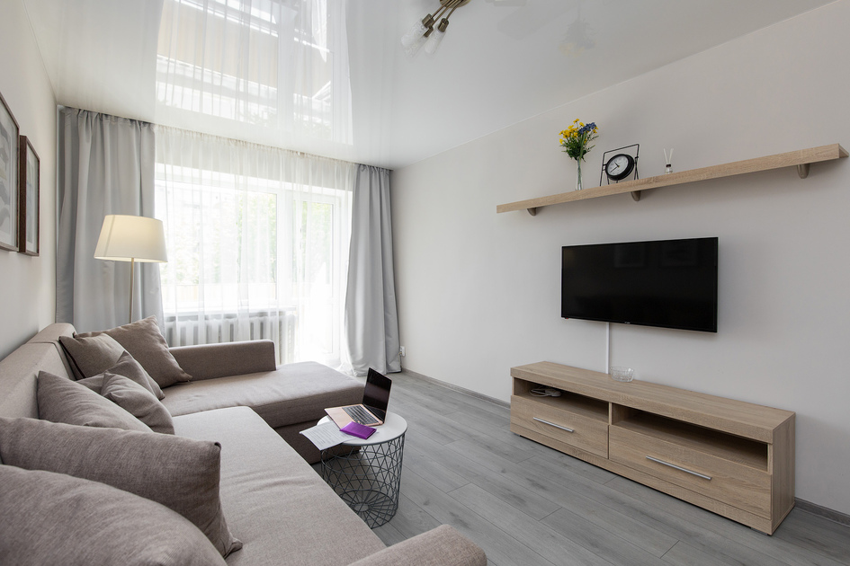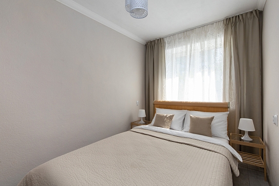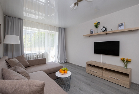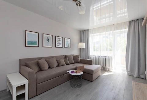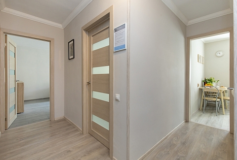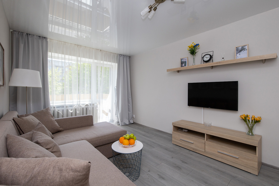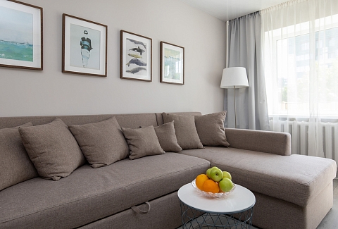 Апартаменты предоставляют гостям функциональное пространство для проживания. В соответствии со стандартами обслуживания, после каждого отъезда проводится влажная уборка, а для гостей предоставляется свежее постельное белье из профессиональной прачечной. В помещении оборудовано всё необходимое для быта, включая базовые средства гигиены, комплект посуды и бытовую технику.Интерьер выполнен в современном стиле, обеспечивая практичность и комфорт.