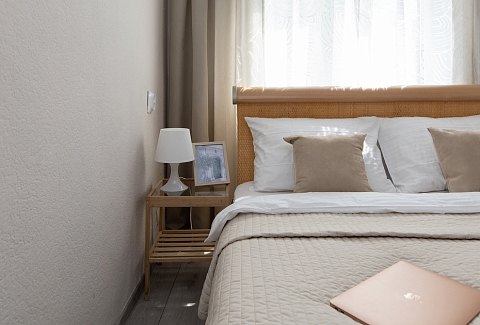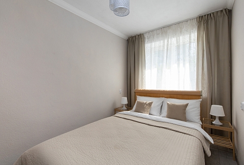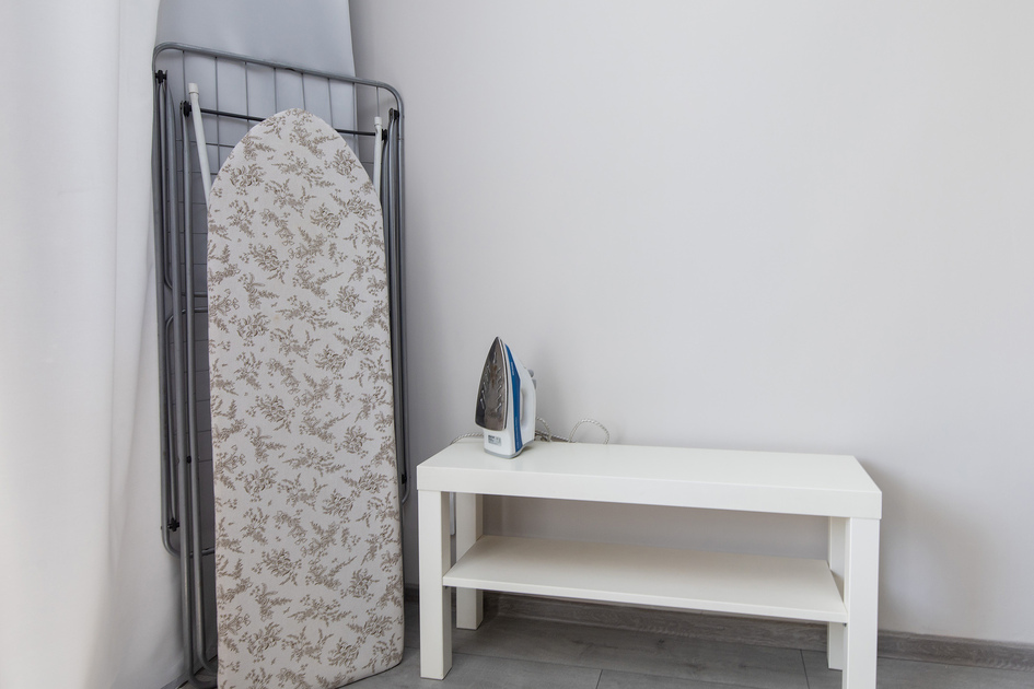 В номере: диван, зеркало, кровать двуспальная, стол, стулья, шкаф, гладильная доска, духовой шкаф, кондиционер, микроволновая печь, плита электрическая, стиральная машина, сушилка для белья, телевизор ЖК, утюг, холодильник, чайный набор посуды, электрочайник