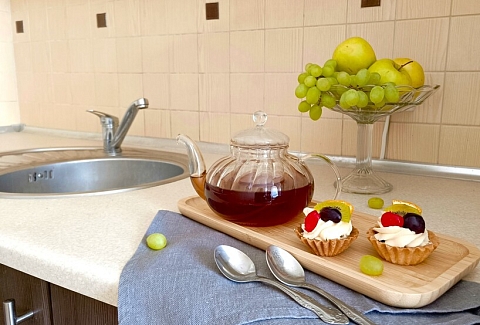 В номере: диван, зеркало, кровать двуспальная, стол, стулья, шкаф, гладильная доска, духовой шкаф, микроволновая печь, набор посуды, плита электрическая, стиральная машина, сушилка для белья, телевизор ЖК, чайный набор посуды, электрочайник