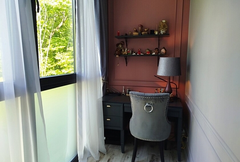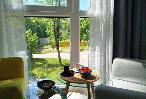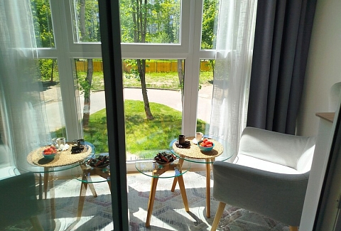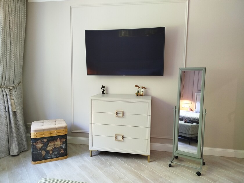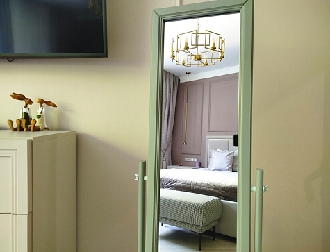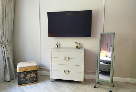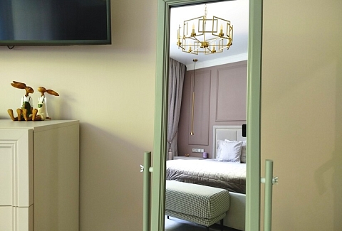 В номере: диван, зеркало, кровать двуспальная, стол, стулья, шкаф, гладильная доска, духовой шкаф, кондиционер, кофемашина, микроволновая печь, набор посуды, стиральная машина, сушилка для белья, телевизор ЖК, утюг, холодильник, чайный набор посуды, электрочайник