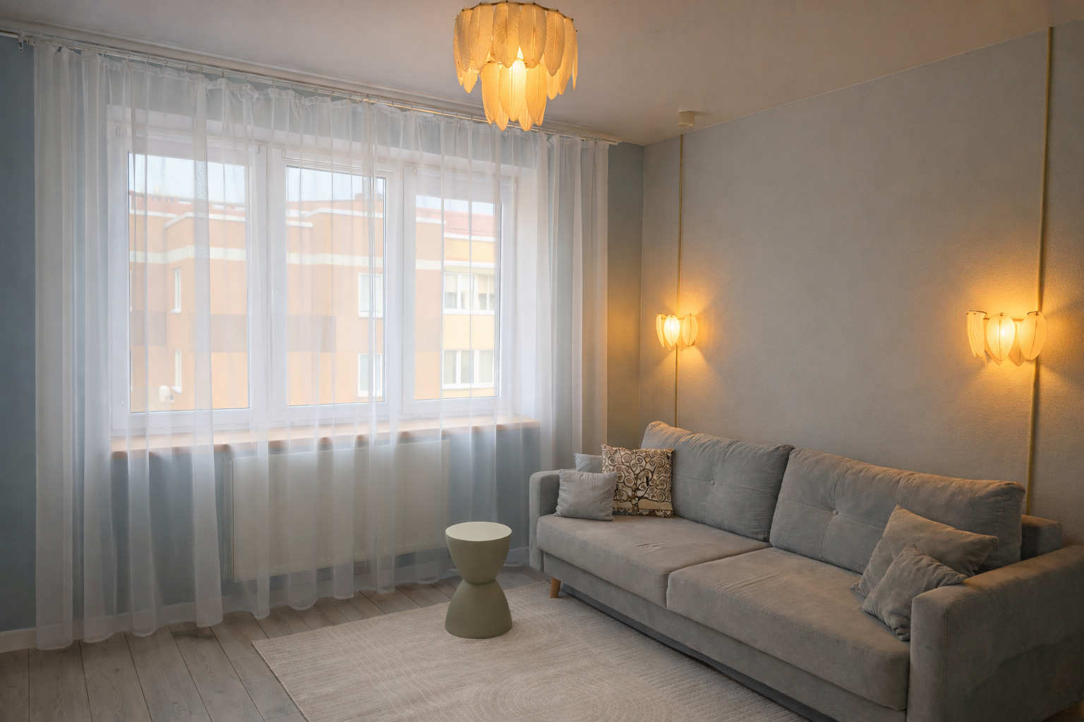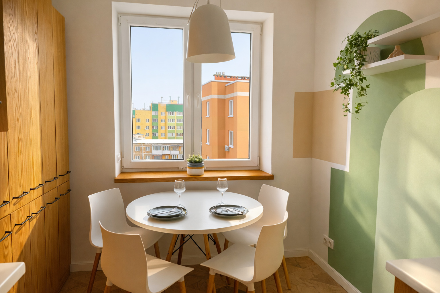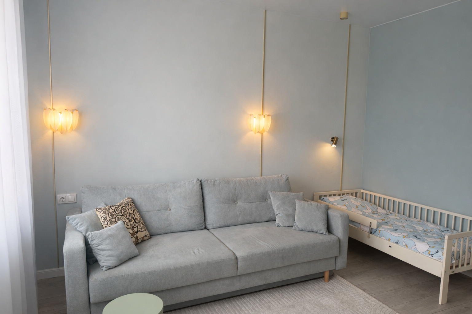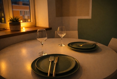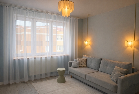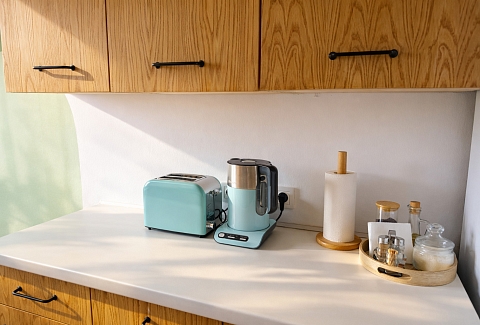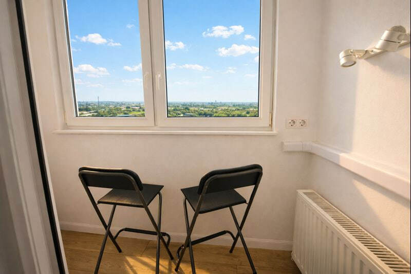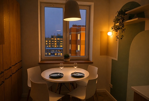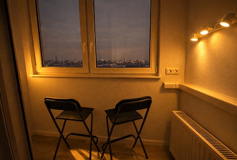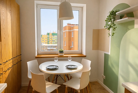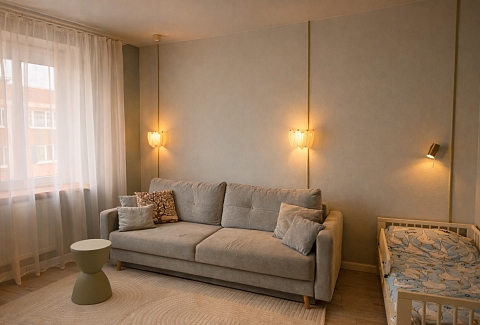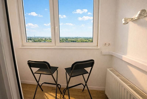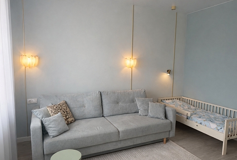 Для ребёнка предусмотрена отдельная кроватка 80×190. Есть два телевизора, Wi-Fi и кондиционер в спальне. Кухня полностью оборудована посудой и техникой. В ванной с душевой кабиной — стиральная машина, фен, гигиенические принадлежности и свежие полотенца. На балконе стоят два барных стула, в коридоре и спальне — вместительные шкафы. Также есть сушилка, гладильная доска и утюг.Здесь всё продумано для комфортного отдыха в городе.