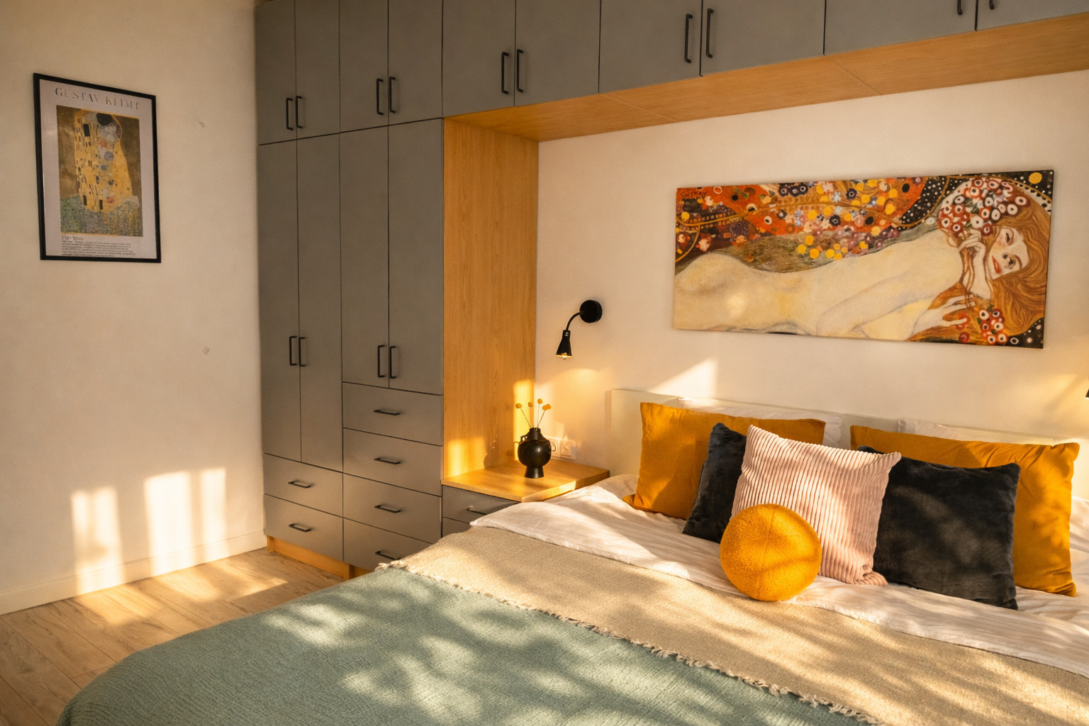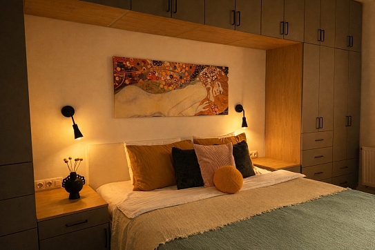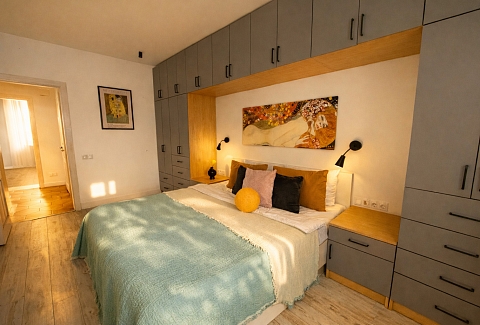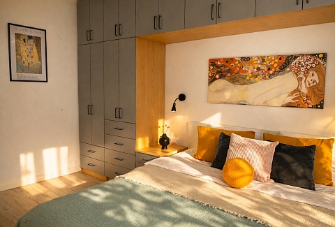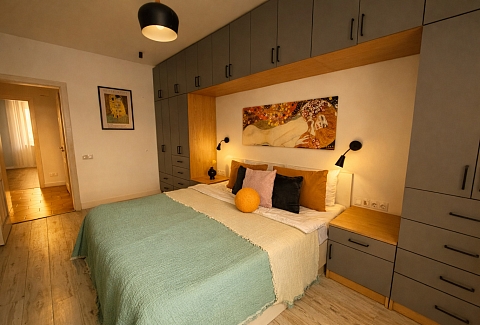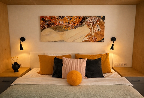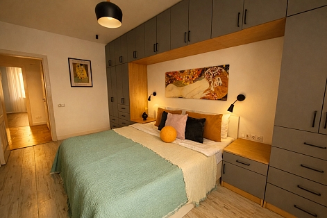 Апартаменты «Густав Климт» находятся в Калининграде на улице Зои Космодемьянской. До Фридландских ворот идти десять минут, до острова Канта и Рыбной деревни — около двадцати пяти. Рядом супермаркеты «Spar» и «Победа», продуктовый рынок и кафе.В спальне стоит кровать 180×200, в гостиной раскладывается диван 140×200.