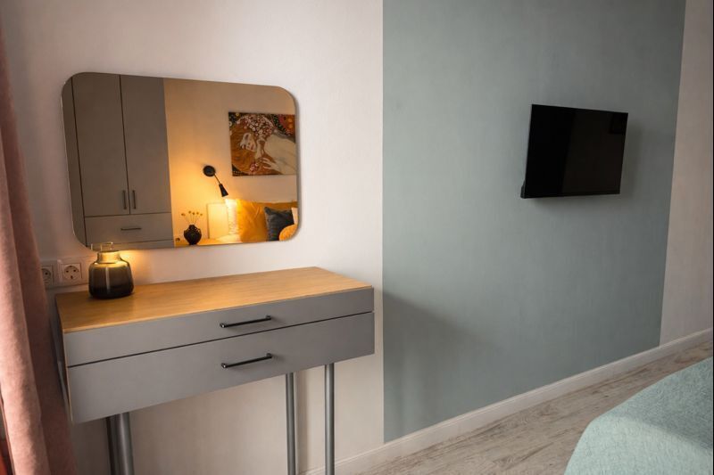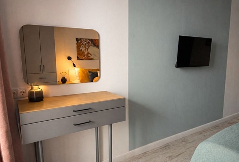 В номере: диван, зеркало, кровать двуспальная, стол, стулья, шкаф, гладильная доска, кондиционер, микроволновая печь, набор посуды, плита электрическая, посудомоечная машина, стиральная машина, телевизор, утюг, холодильник, электрочайник