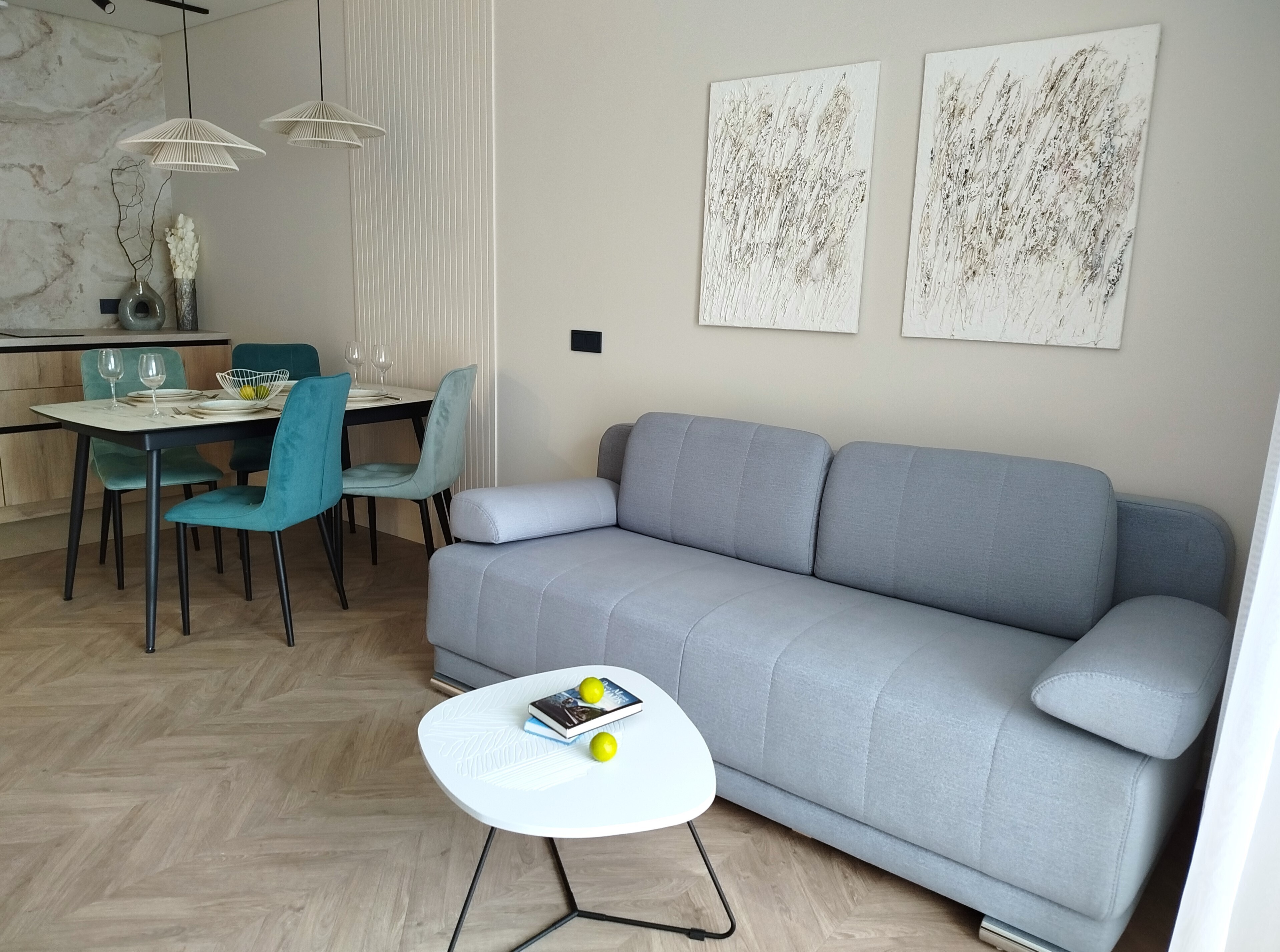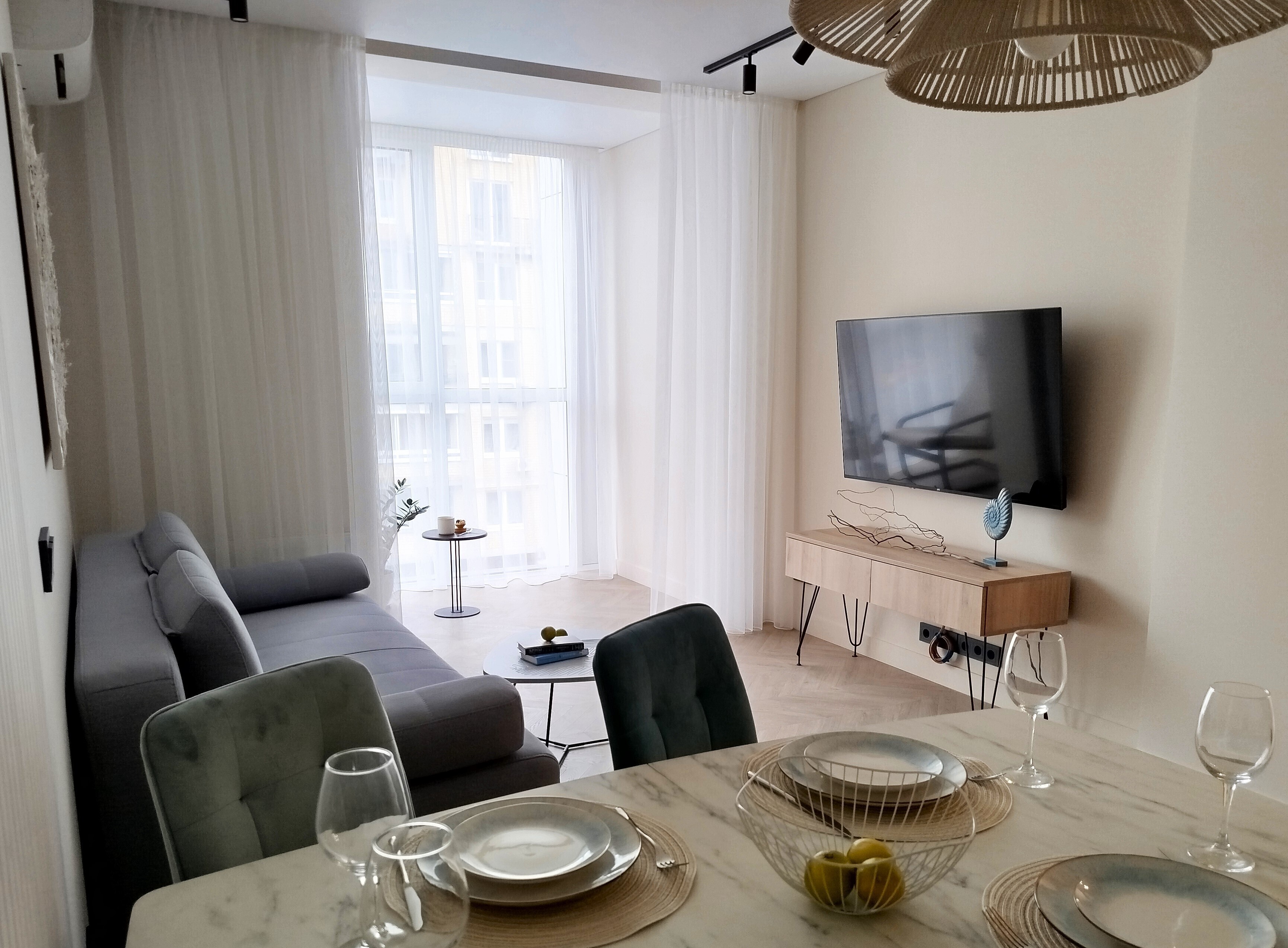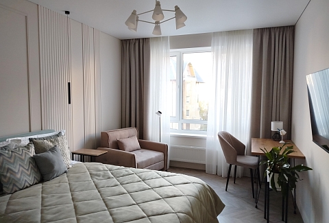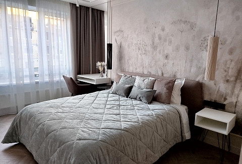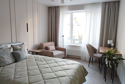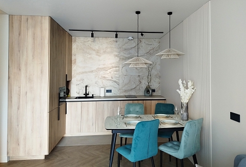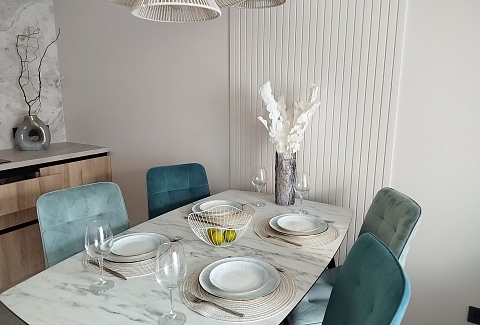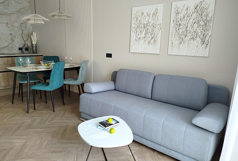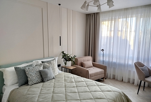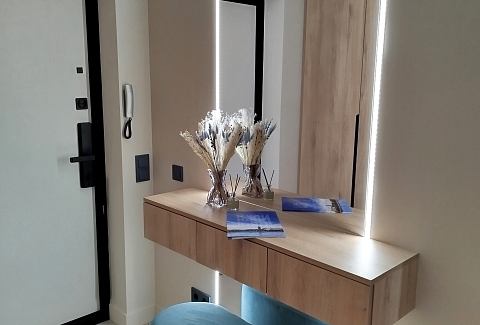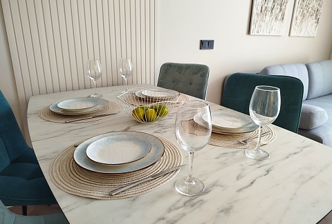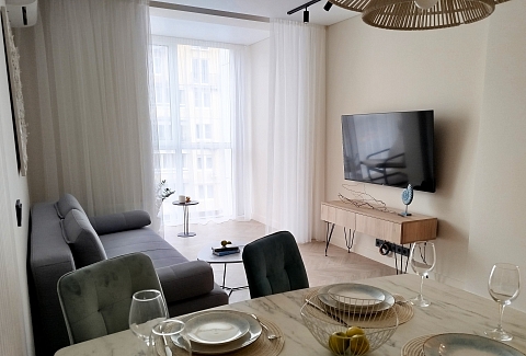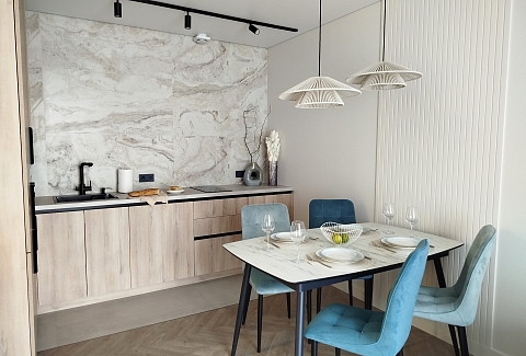 Рядом с домом — супермаркет Spar, уютная кофейня, аптека и остановки общественного транспорта, что делает пребывание максимально удобным. Внутри — продуманное пространство для большой семьи или компании. В двух отдельных спальнях установлены удобные кровати, а просторная кухня-гостиная дополнена раскладным диваном, так что здесь с комфортом разместятся до восьми человек. Кухня полностью готова к приготовлению домашних блюд: есть вся необходимая техника, посуда и даже стартовый набор чая и кофе. В апартаментах предусмотрено три санузла — с ванной и душевой кабиной, что исключает утренние очереди. Для гостей приготовлены свежие полотенца, средства гигиены, фен и стиральная машина. В каждой комнате работает кондиционер, а по всему периметру — высокоскоростной Wi-Fi и телевизоры. Продуманы и мелочи для семей с детьми: по запросу предоставляется кроватка, горшок и игрушки. Это место, где хочется останавливаться снова: спокойная цветовая гамма, бесконтактное заселение в любое время суток и забота о каждой детали создают ощущение домашнего уюта вдали от дома.