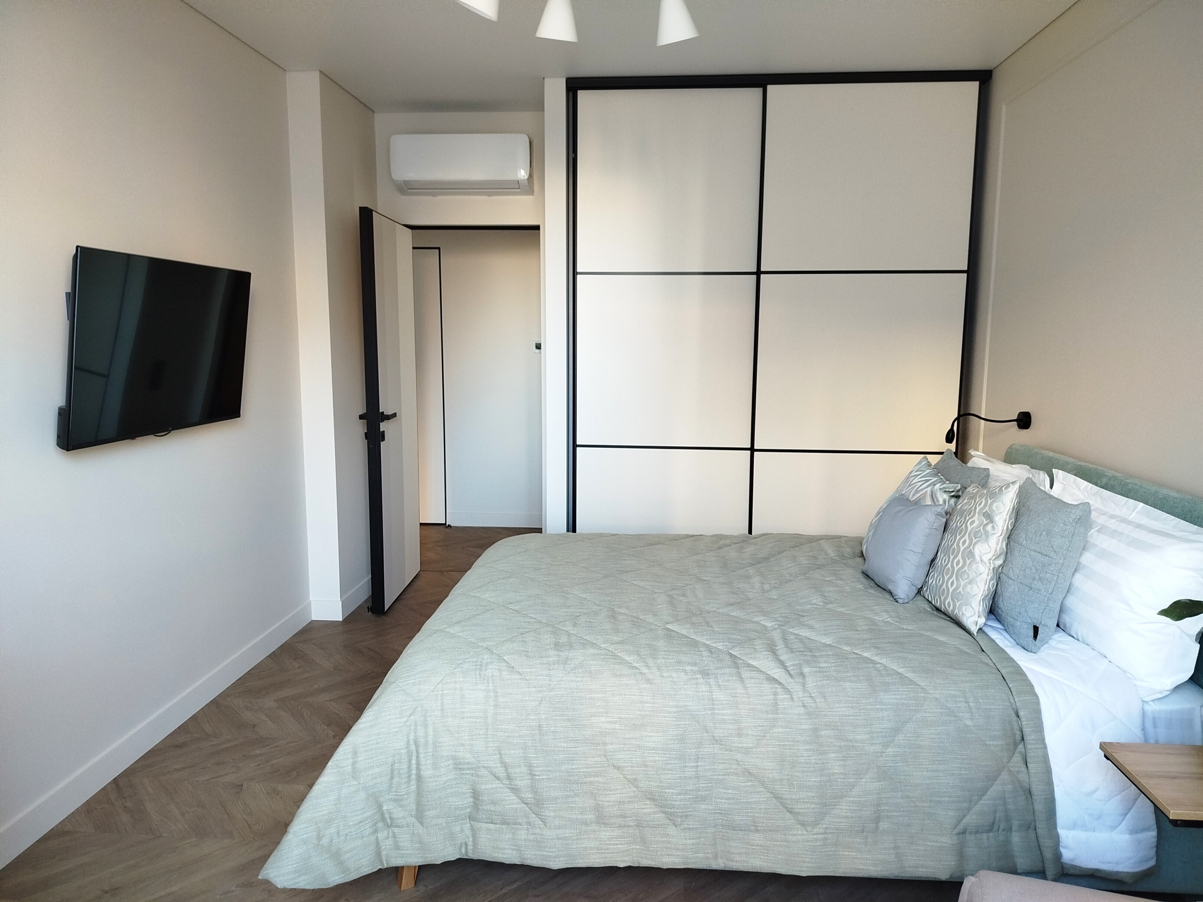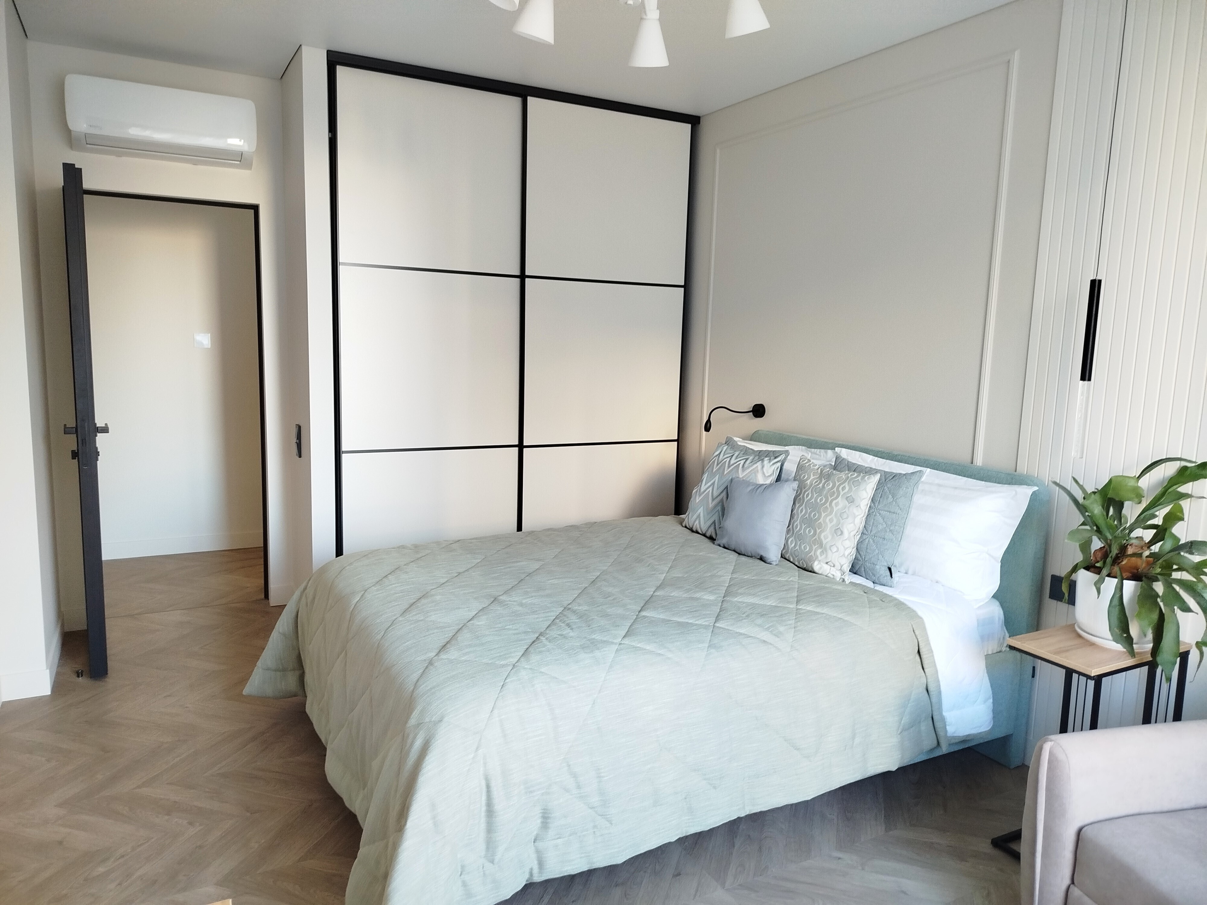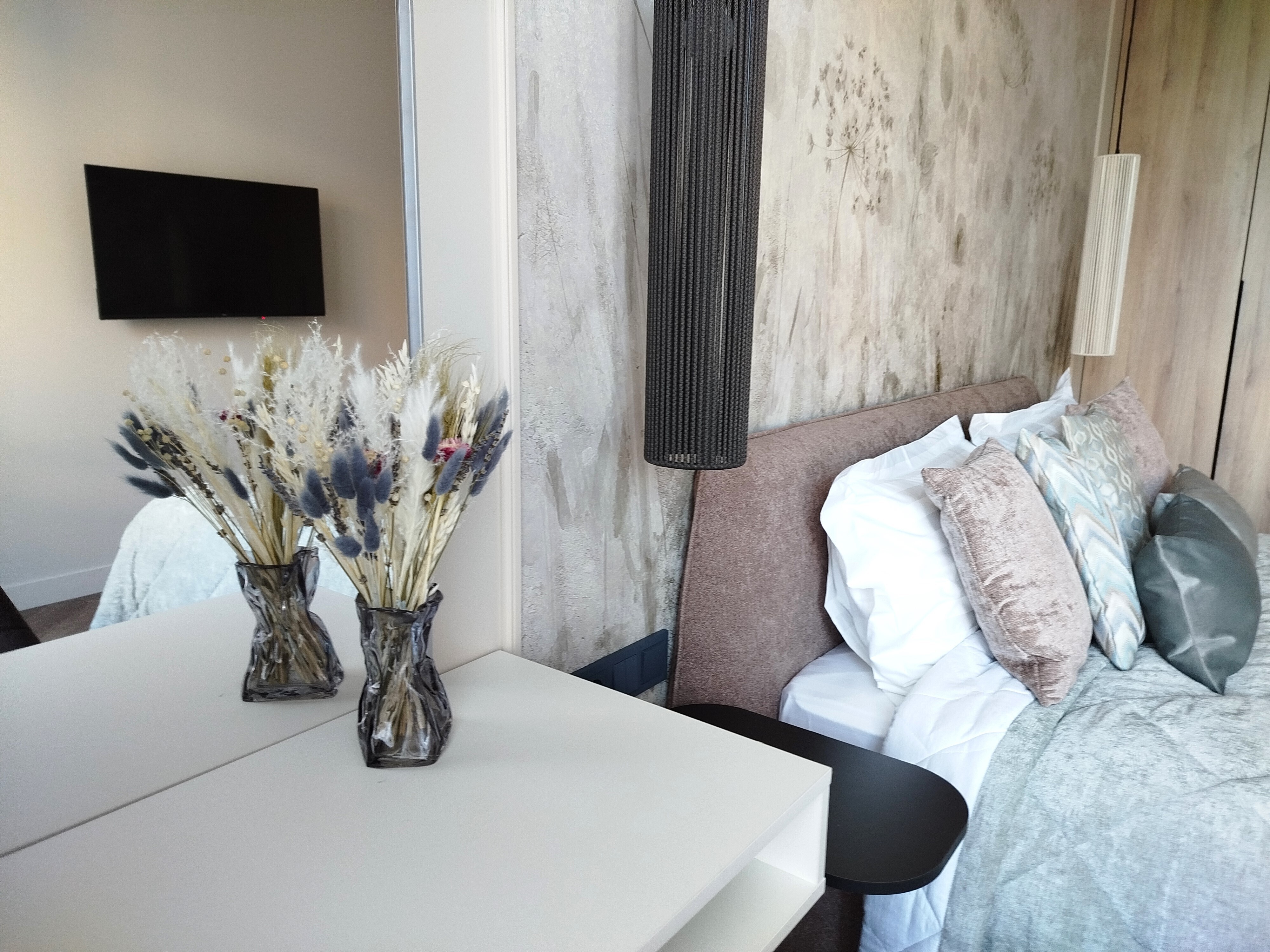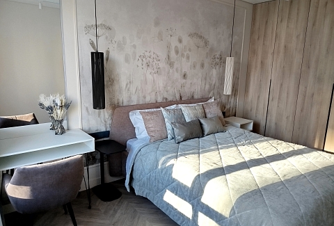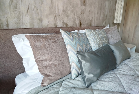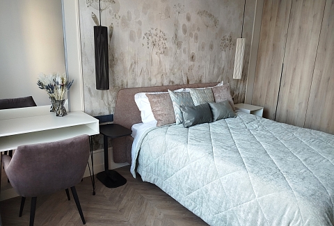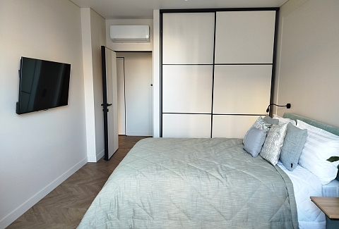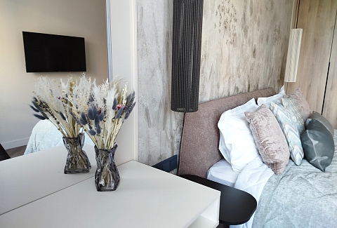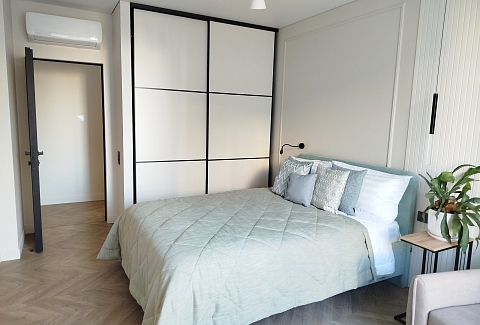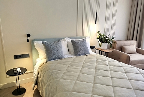 В номере: зеркало, кровать двуспальная, прикроватные тумбочки, стол, стулья, шкаф, кондиционер, микроволновая печь, набор посуды, плита электрическая, посудомоечная машина, стиральная машина, телевизор, утюг, холодильник, чайный набор посуды, электрочайник