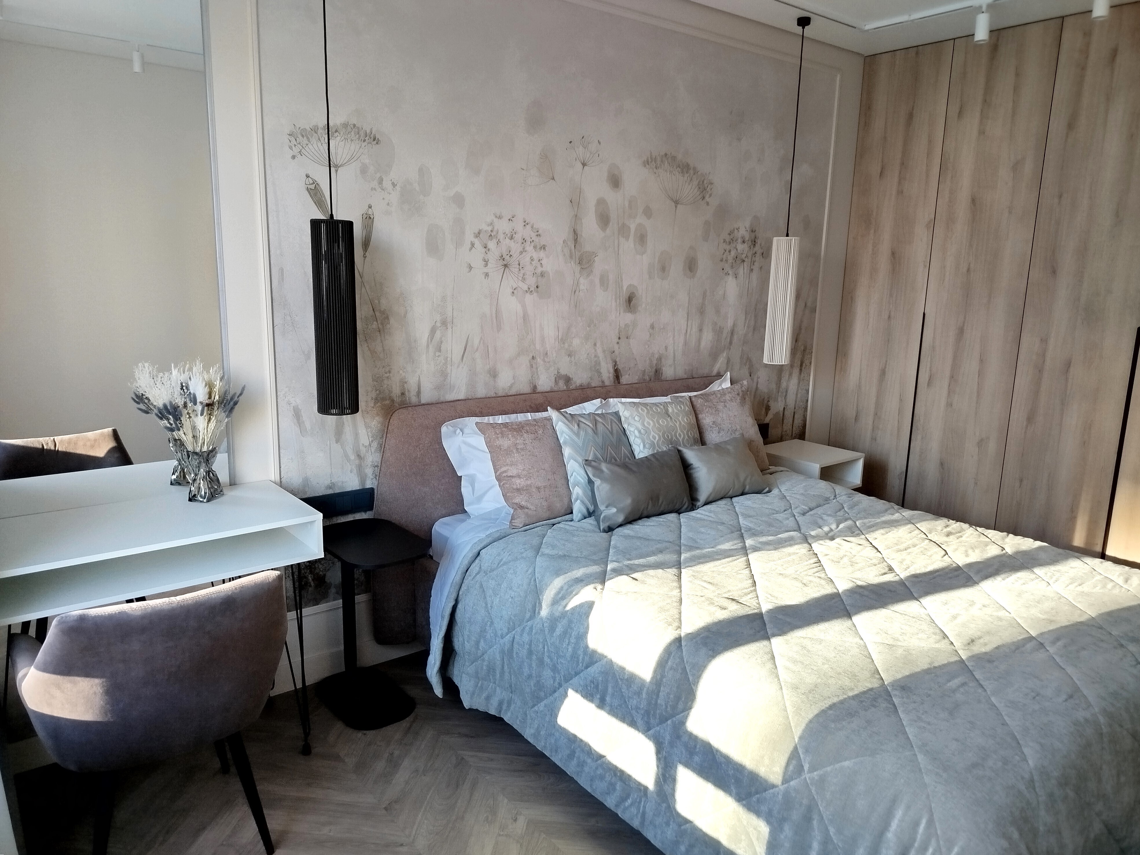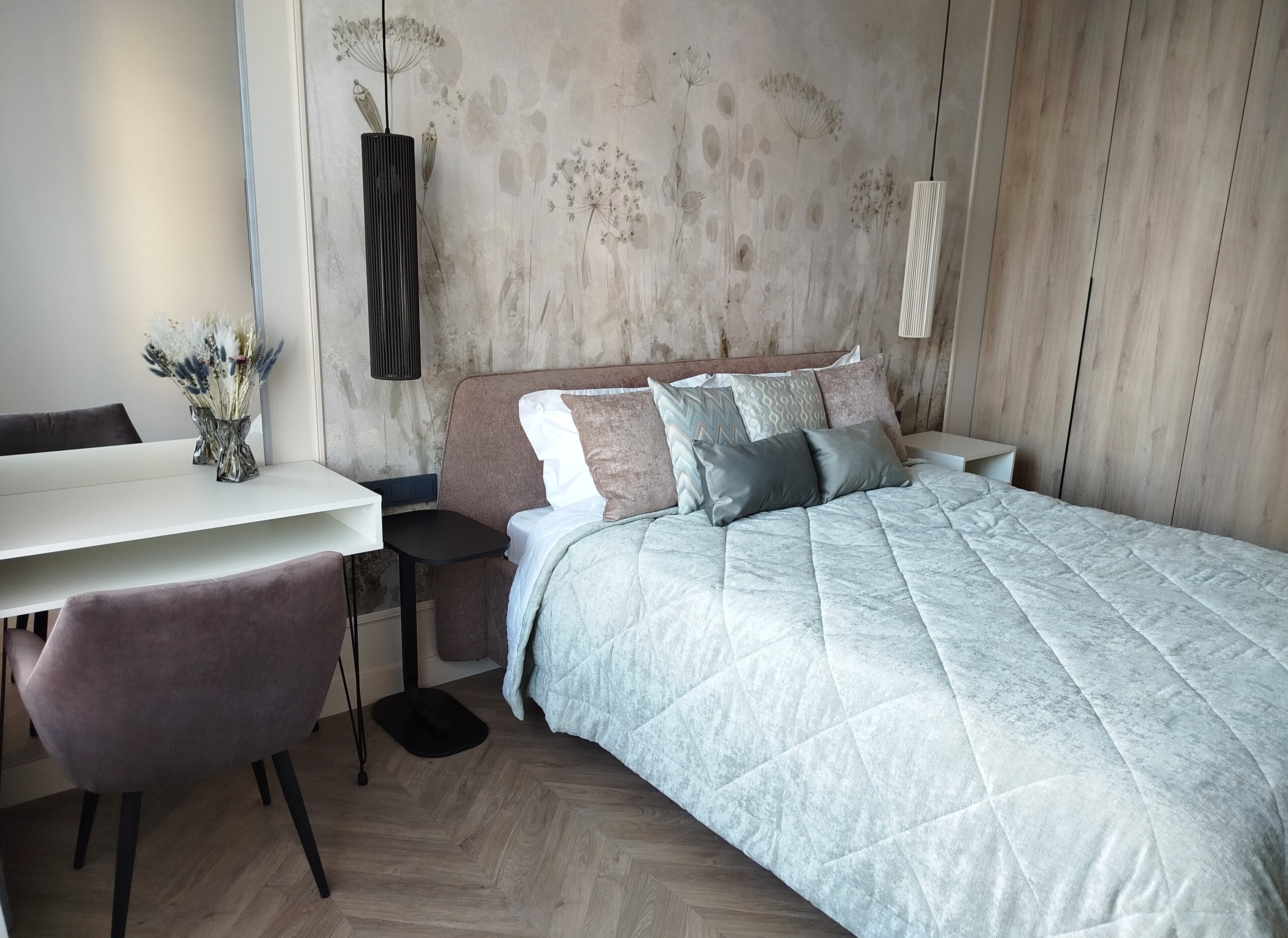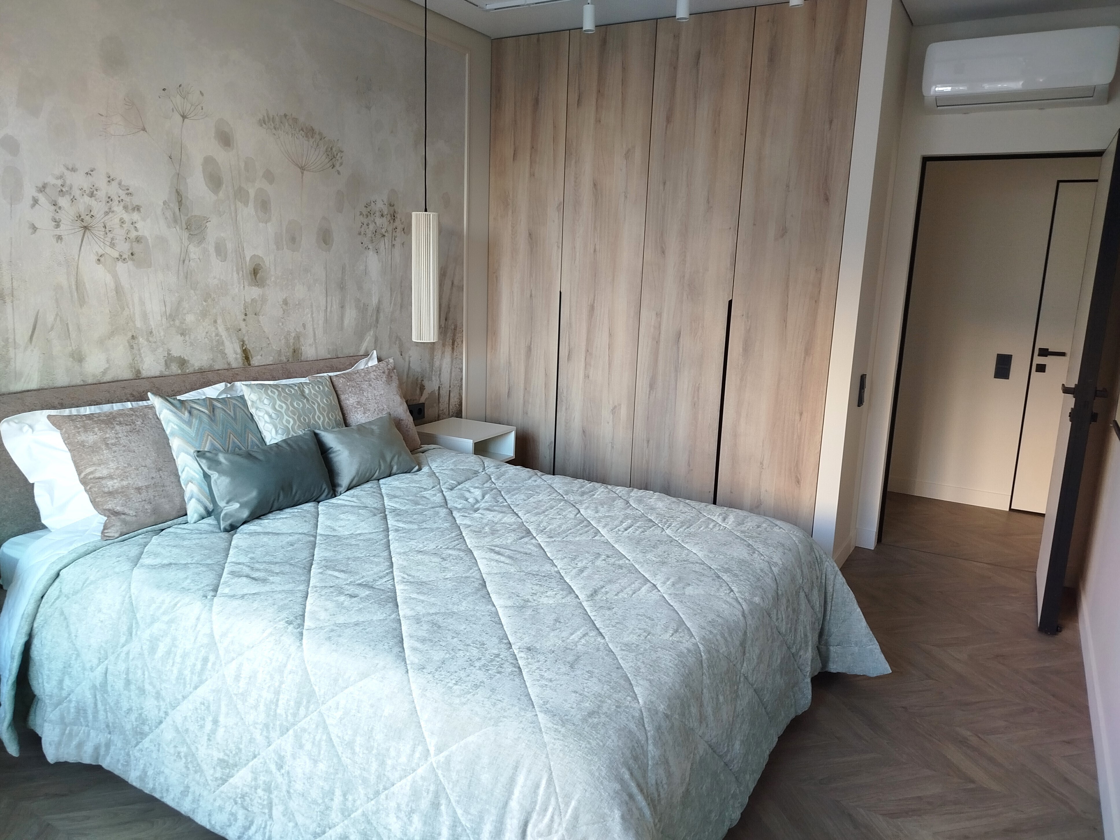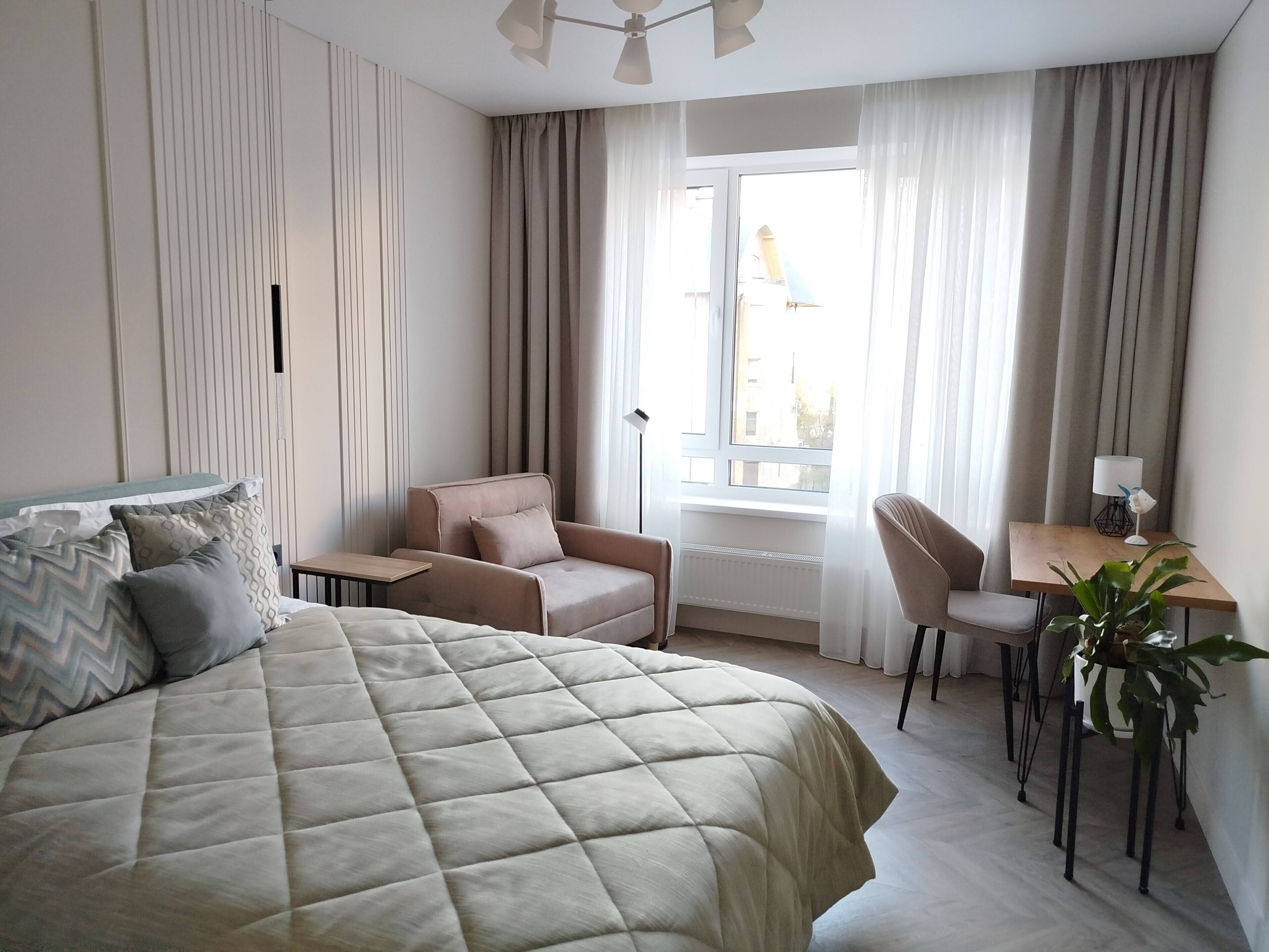 В номере: зеркало, кровать двуспальная, прикроватные тумбочки, стол, стулья, шкаф, кондиционер, микроволновая печь, набор посуды, плита электрическая, посудомоечная машина, стиральная машина, телевизор, утюг, холодильник, чайный набор посуды, электрочайник
