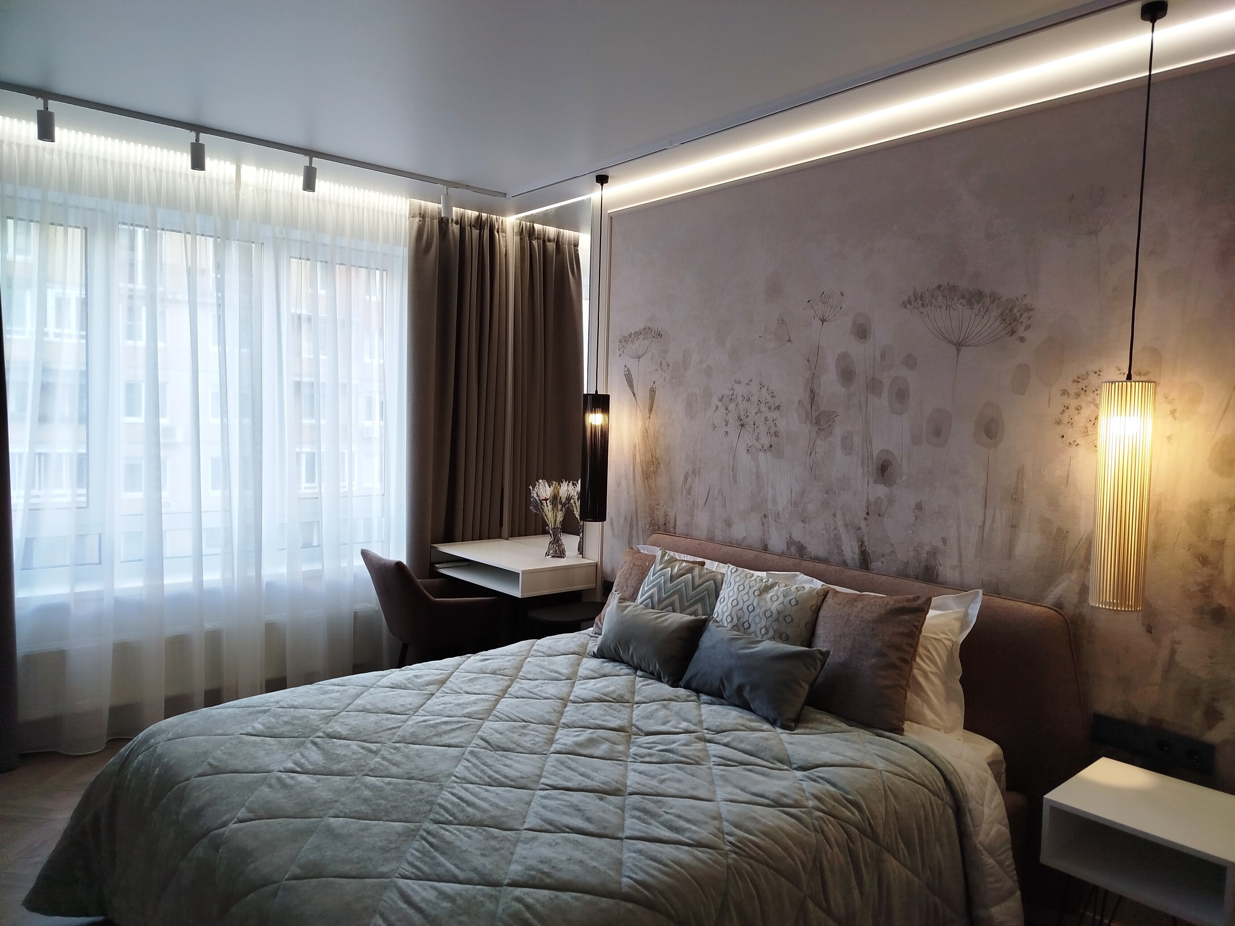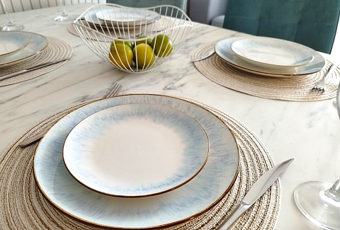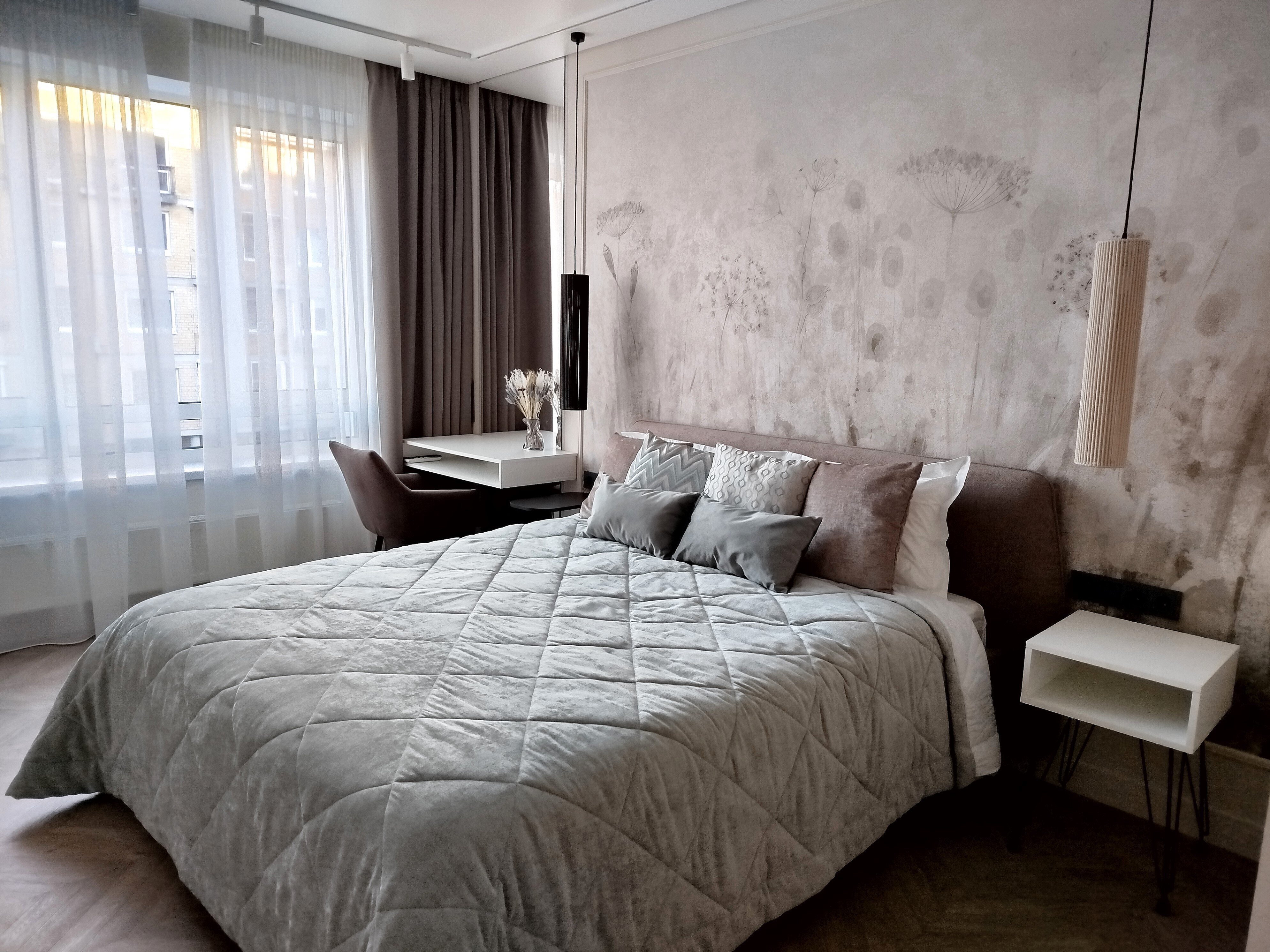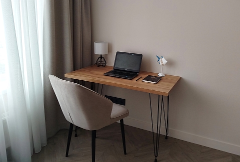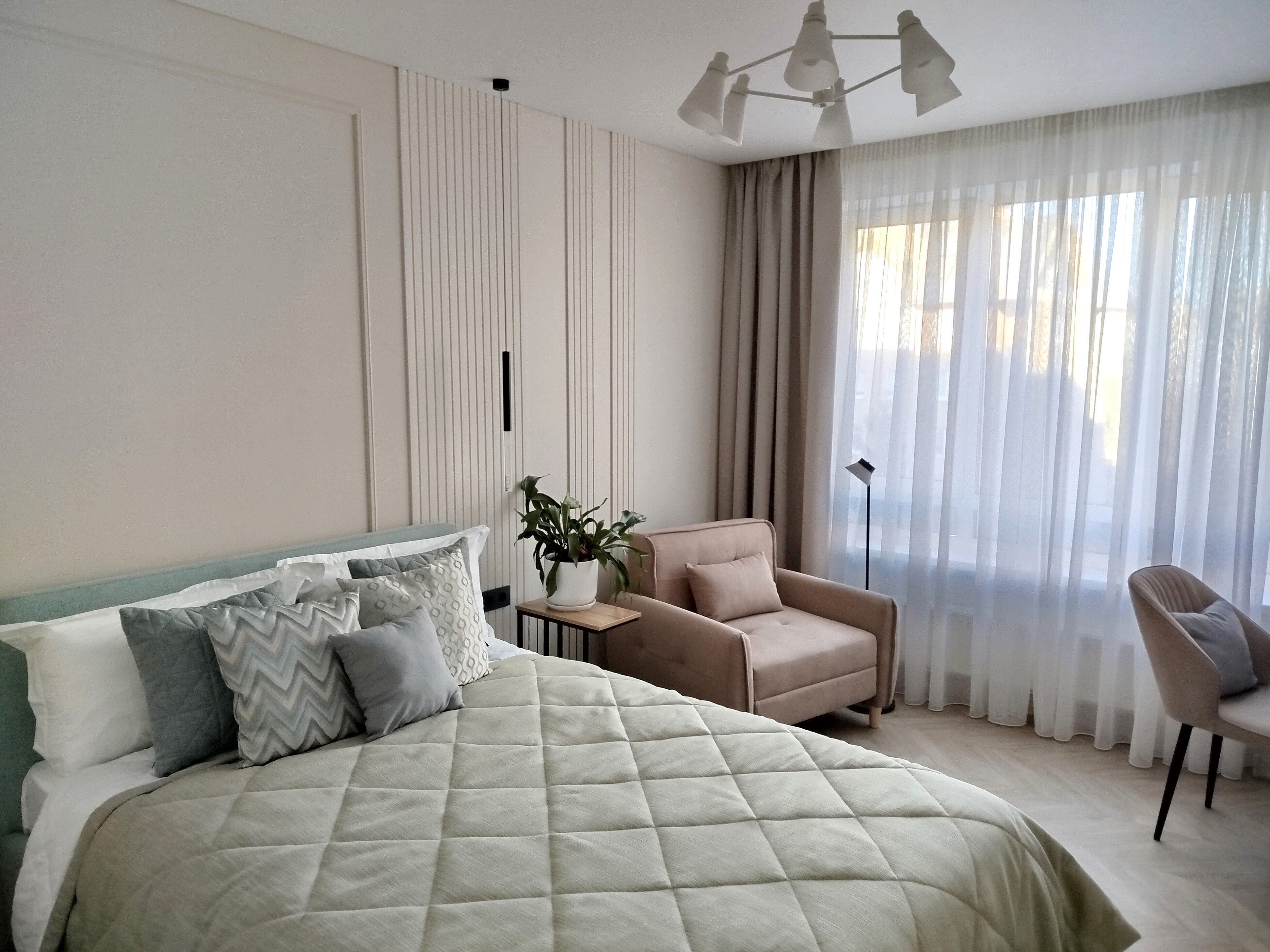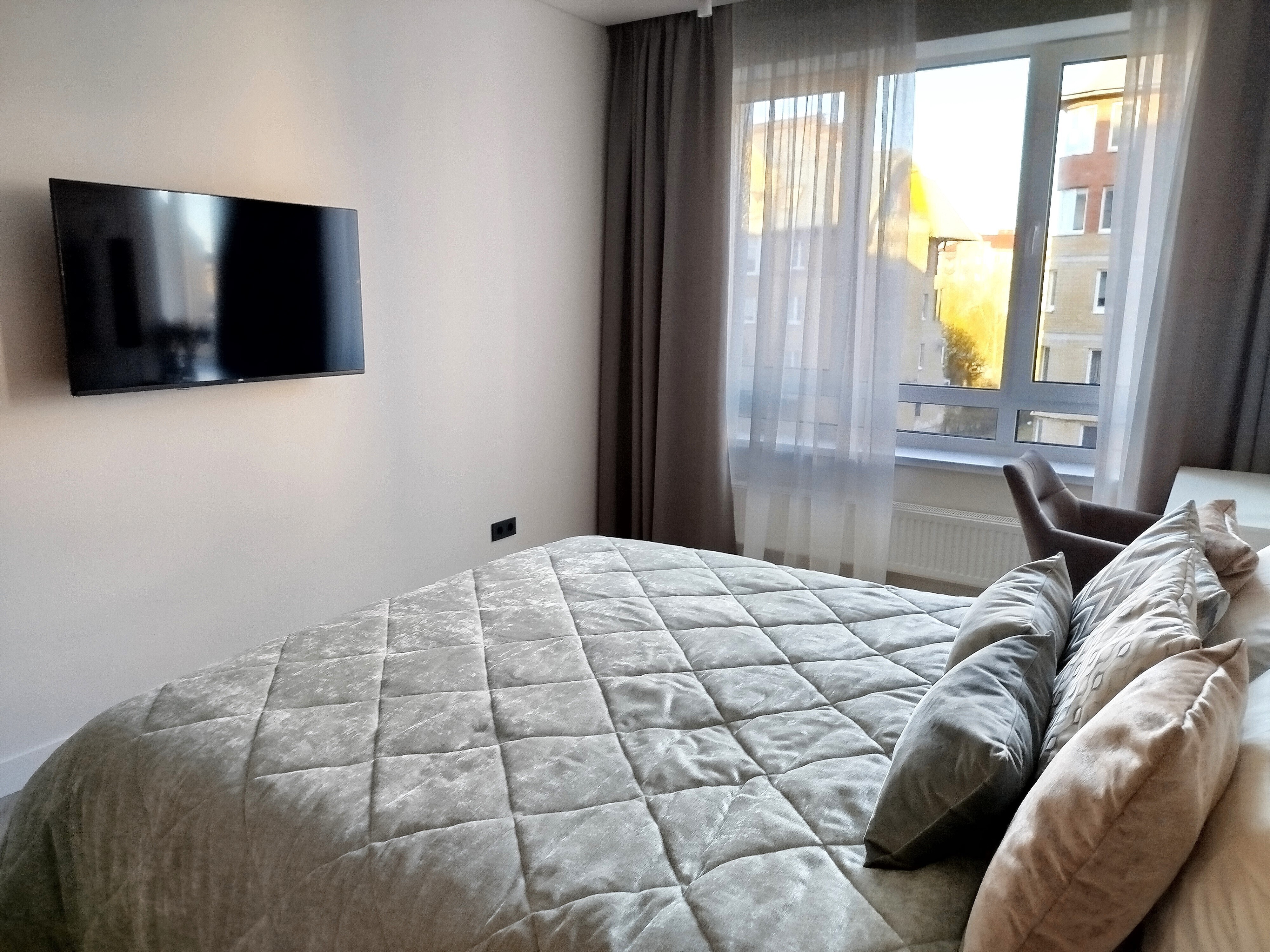 В номере: зеркало, кровать двуспальная, прикроватные тумбочки, стол, стулья, шкаф, кондиционер, микроволновая печь, набор посуды, плита электрическая, посудомоечная машина, стиральная машина, телевизор, утюг, холодильник, чайный набор посуды, электрочайник