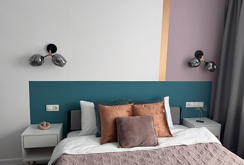 В номере: диван, зеркало, кровать двуспальная, стол, стулья, шкаф, гладильная доска, кондиционер, микроволновая печь, набор посуды, плита электрическая, стиральная машина, телевизор ЖК, утюг, холодильник, чайный набор посуды, электрочайник