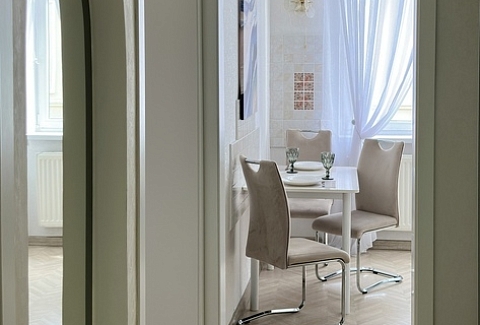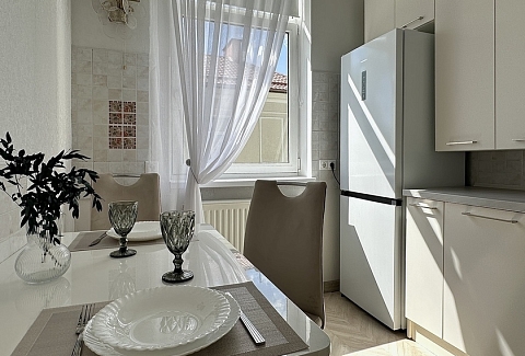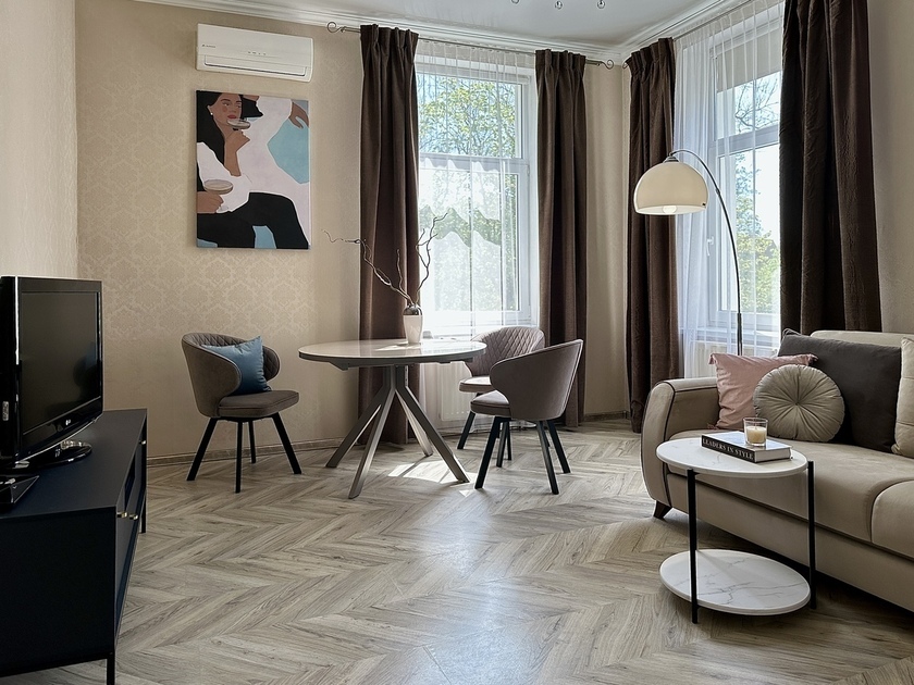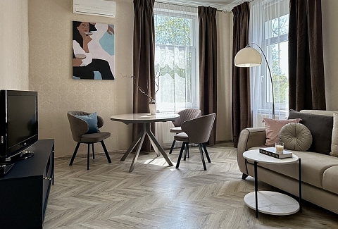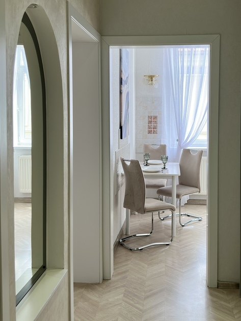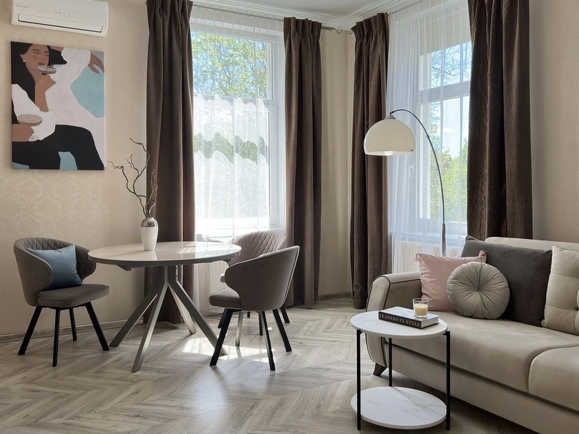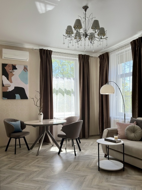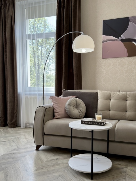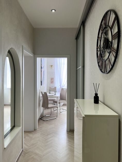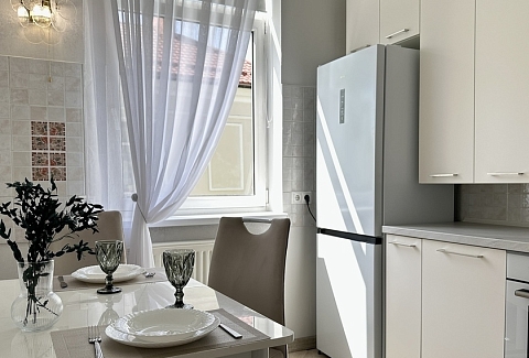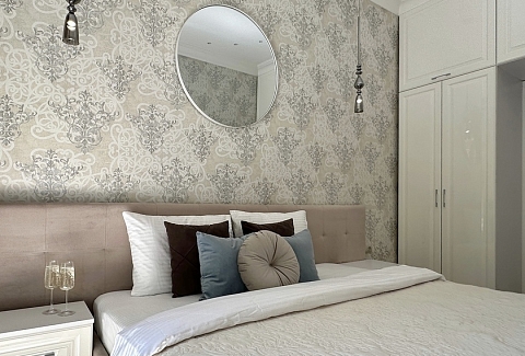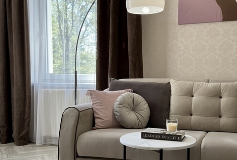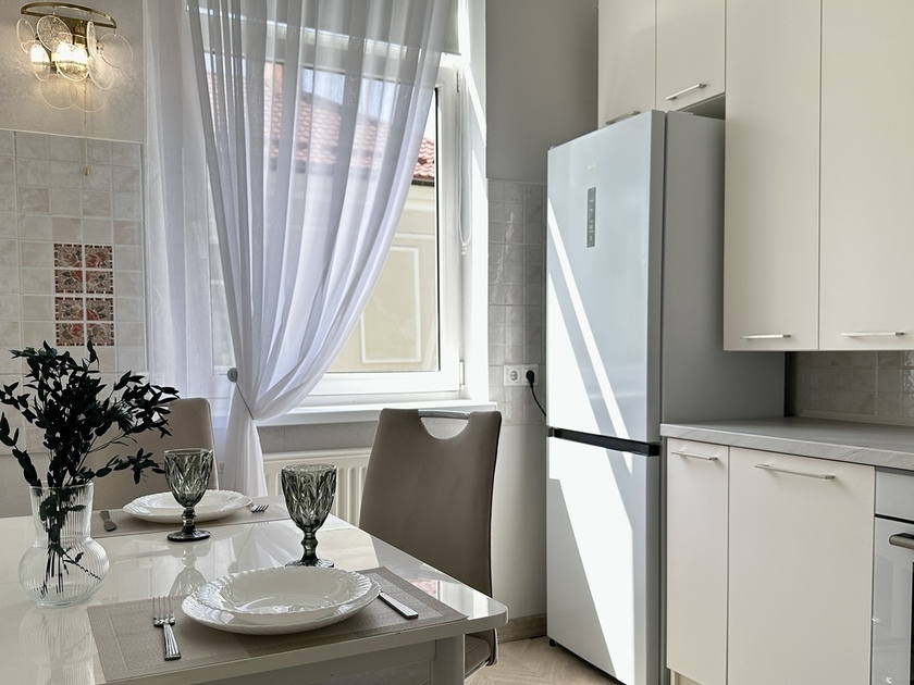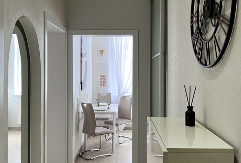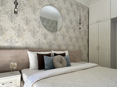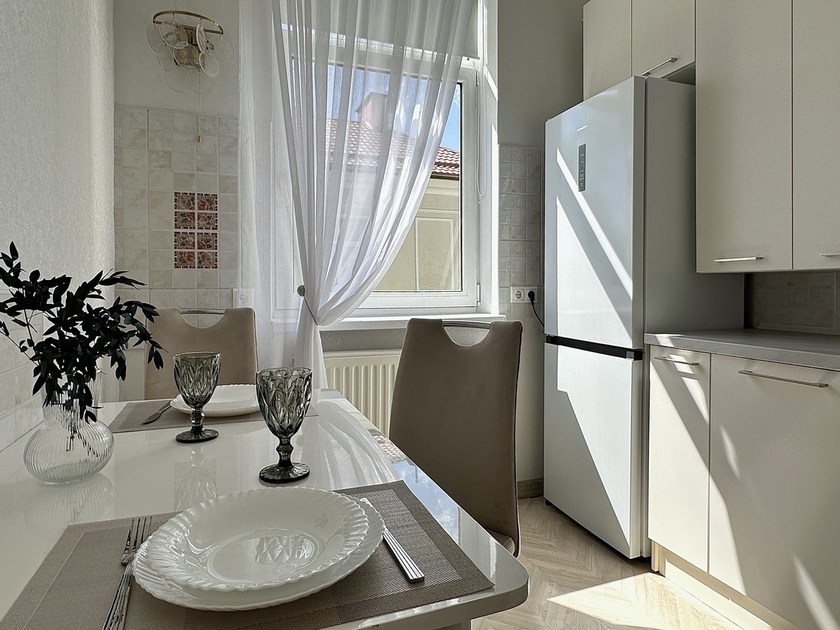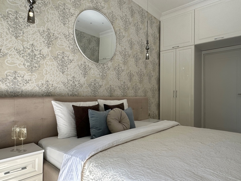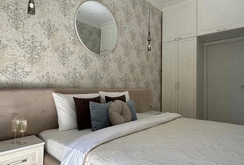 Апартаменты предоставляют гостям функциональное пространство для проживания. В соответствии со стандартами обслуживания, после каждого отъезда проводится влажная уборка, а для гостей предоставляется свежее постельное белье из профессиональной прачечной. В помещении оборудовано всё необходимое для быта, включая базовые средства гигиены, комплект посуды и бытовую технику.Интерьер выполнен в современном стиле, обеспечивая практичность и комфорт.