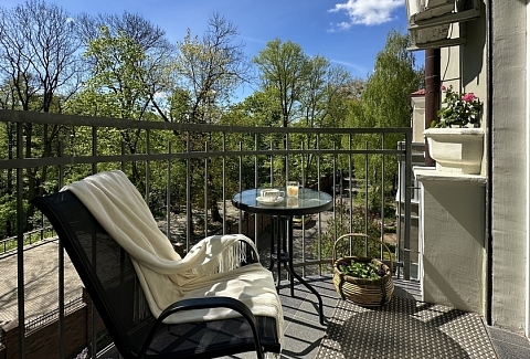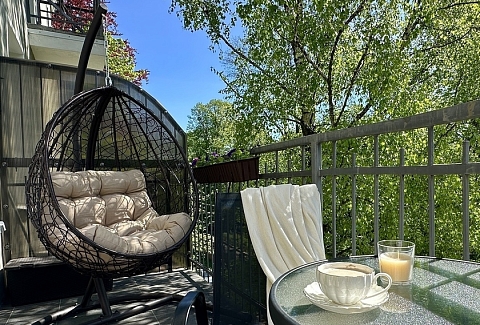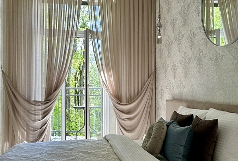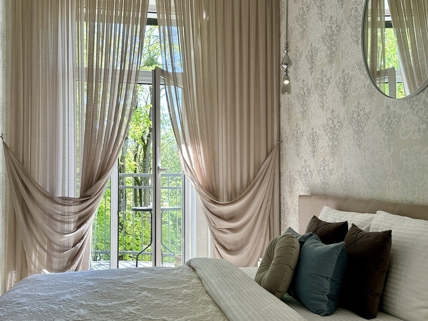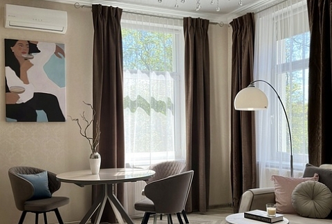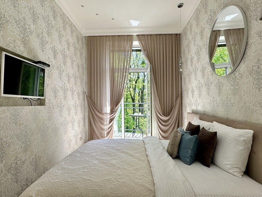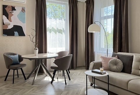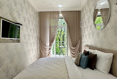В номере: диван, зеркало, кровать двуспальная, стол, стулья, шкаф, гладильная доска, духовой шкаф, кондиционер, микроволновая печь, набор посуды, плита электрическая, стиральная машина, сушилка для белья, телевизор ЖК, утюг, холодильник, чайный набор посуды, электрочайник
