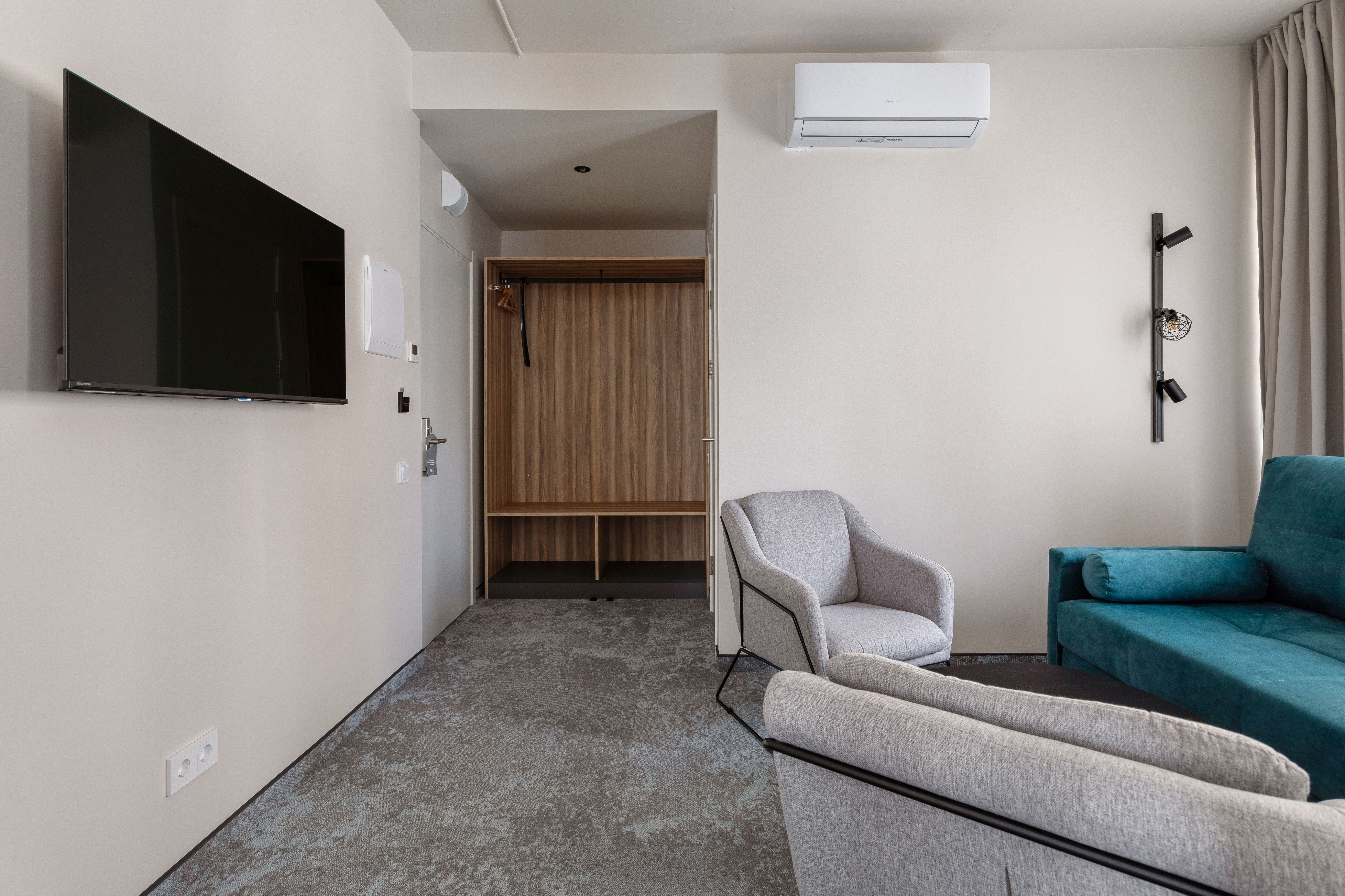 В номере: диван, зеркало, кровати односпальные /одна двуспальная кровать, прикроватные тумбочки, стол, стулья, шкаф, кондиционер, сейф, телевизор ЖК, телефон, чайный набор посуды, электрочайник