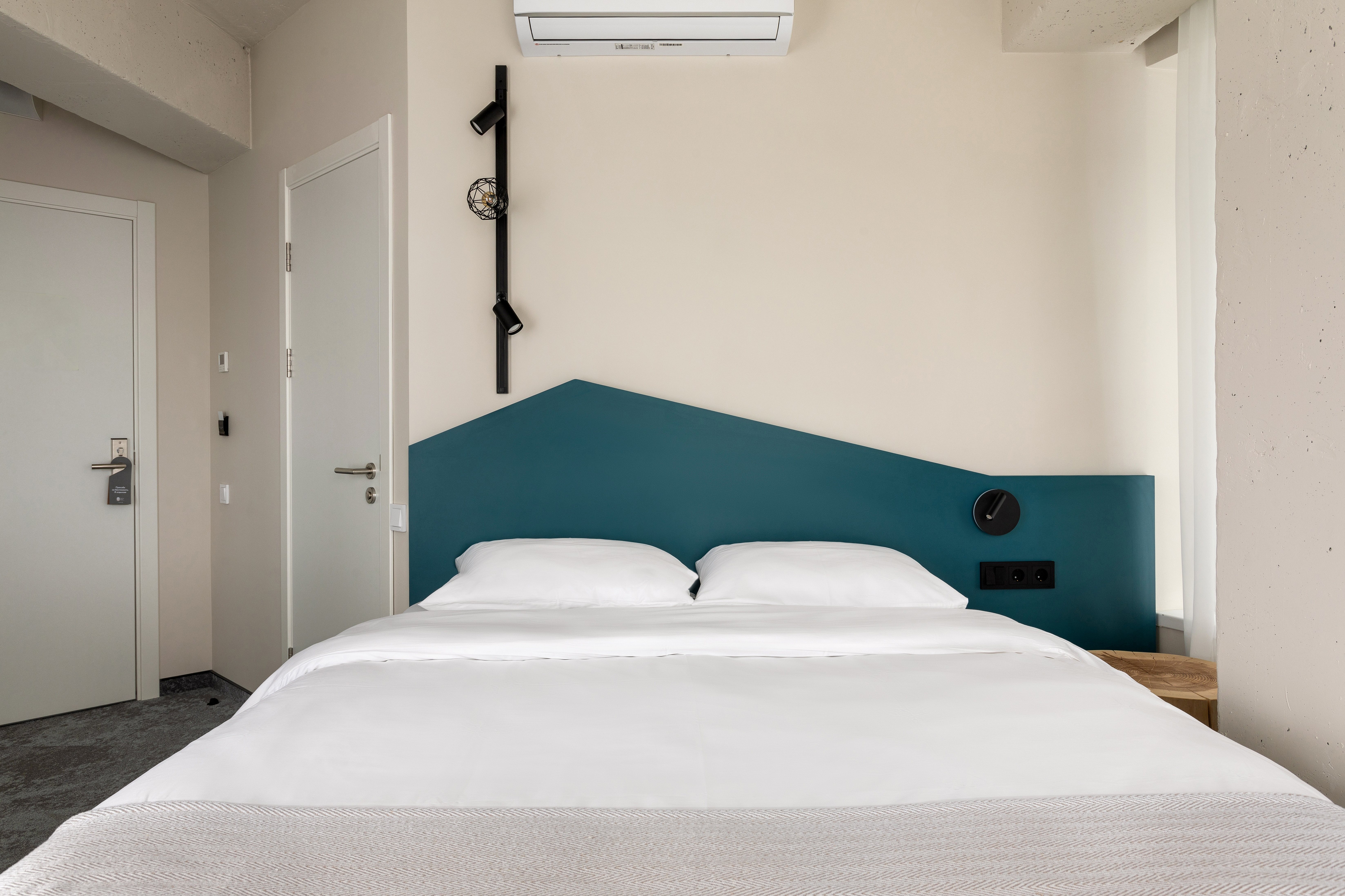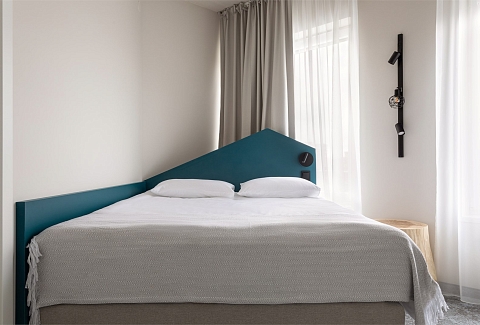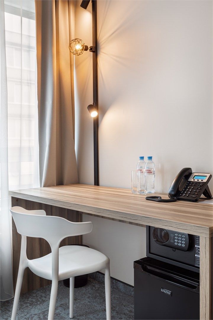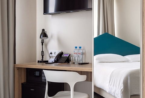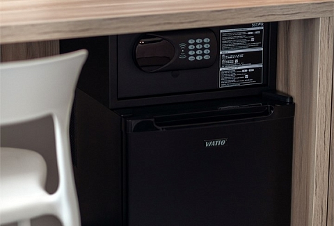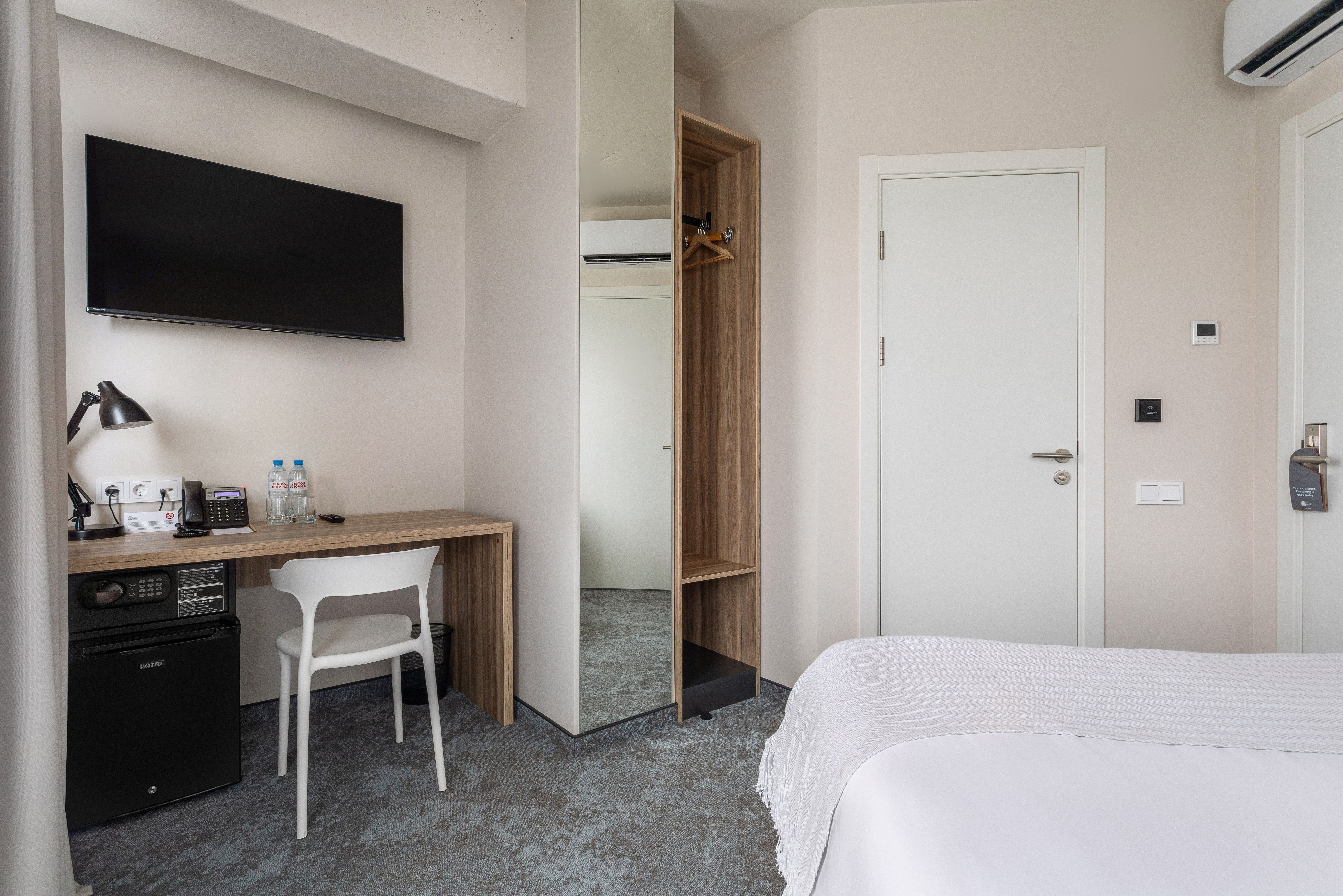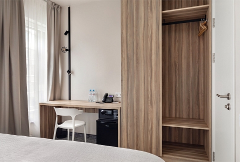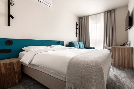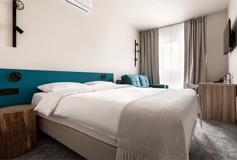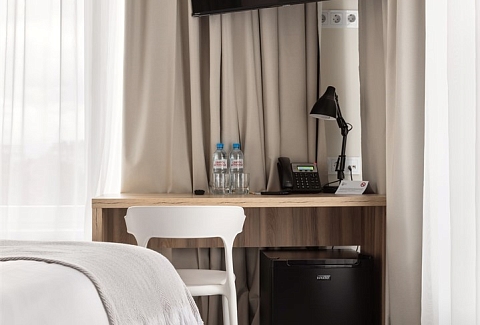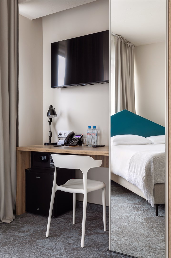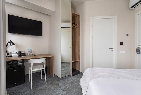 В номере: зеркало, кровать двуспальная, прикроватные тумбочки, стол, стул, шкаф, кондиционер, сейф, телевизор ЖК, телефон, чайный набор посуды, электрочайник