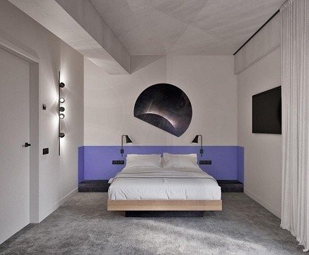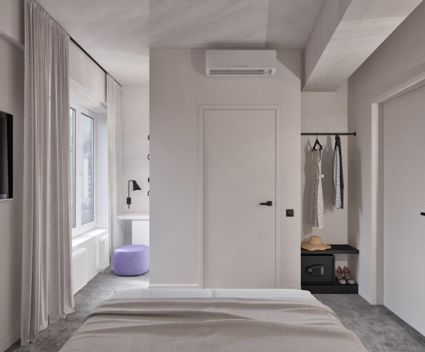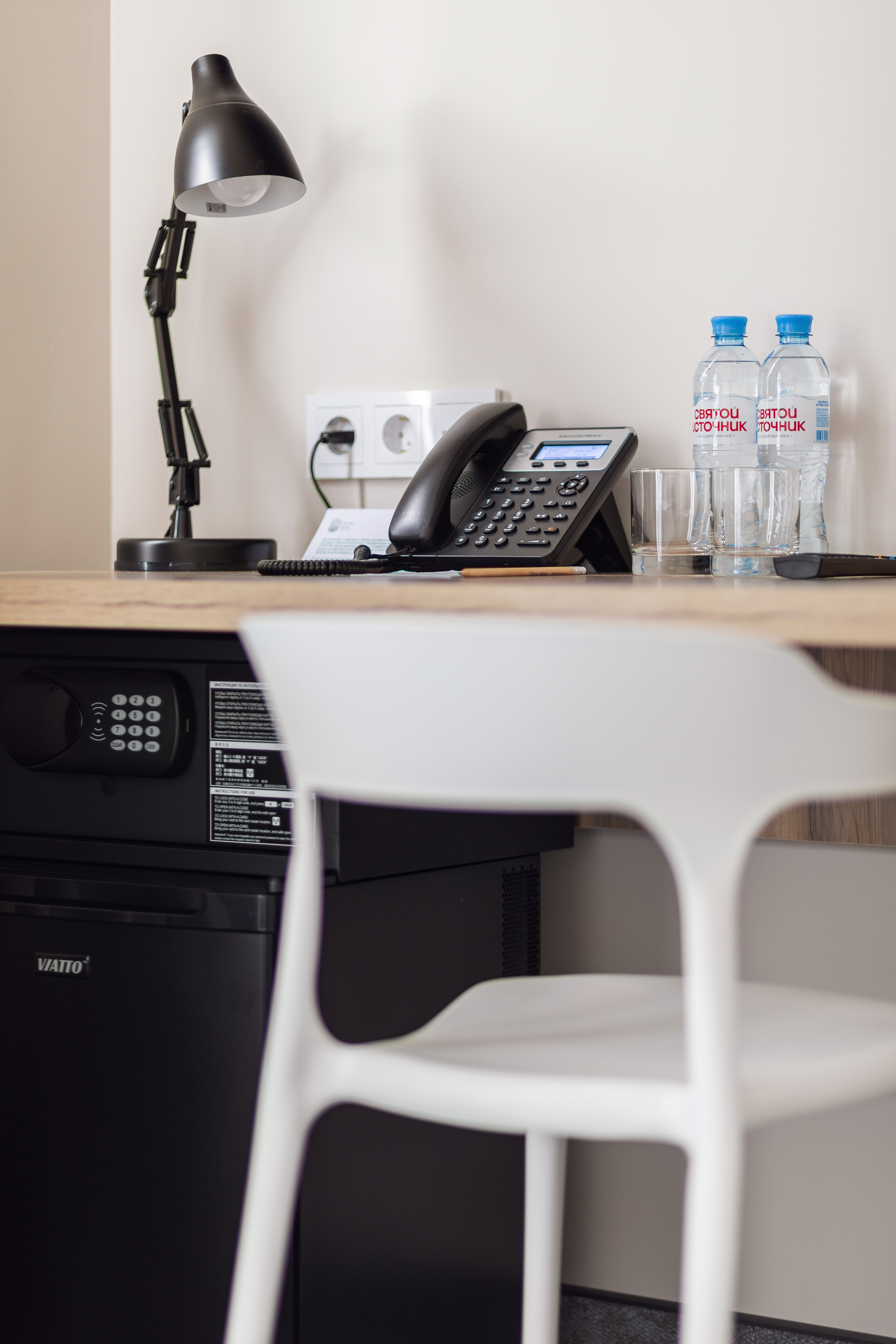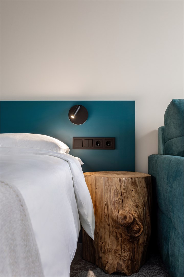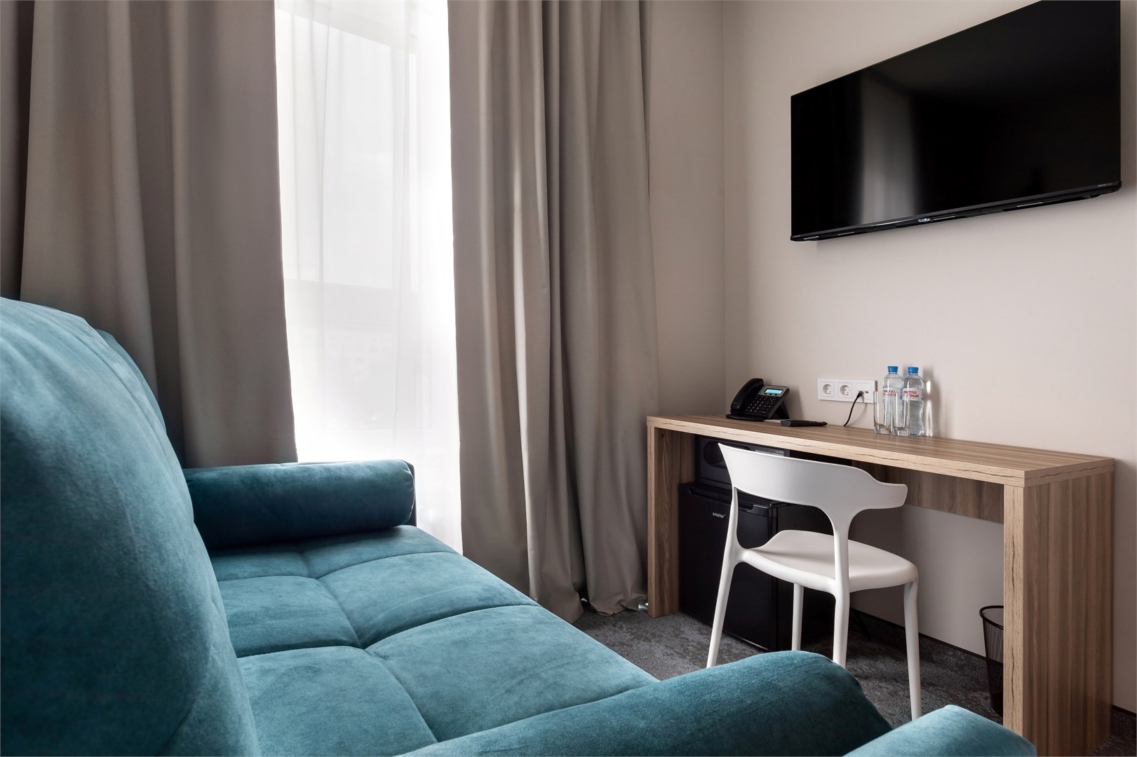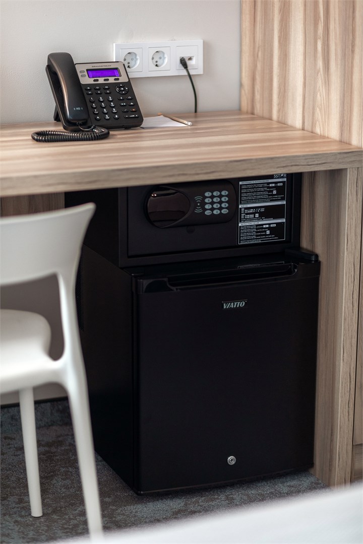 В номере: зеркало, кровать двуспальная, прикроватные тумбочки, стол, стул, шкаф, кондиционер, сейф, телевизор ЖК, телефон, чайный набор посуды, электрочайник