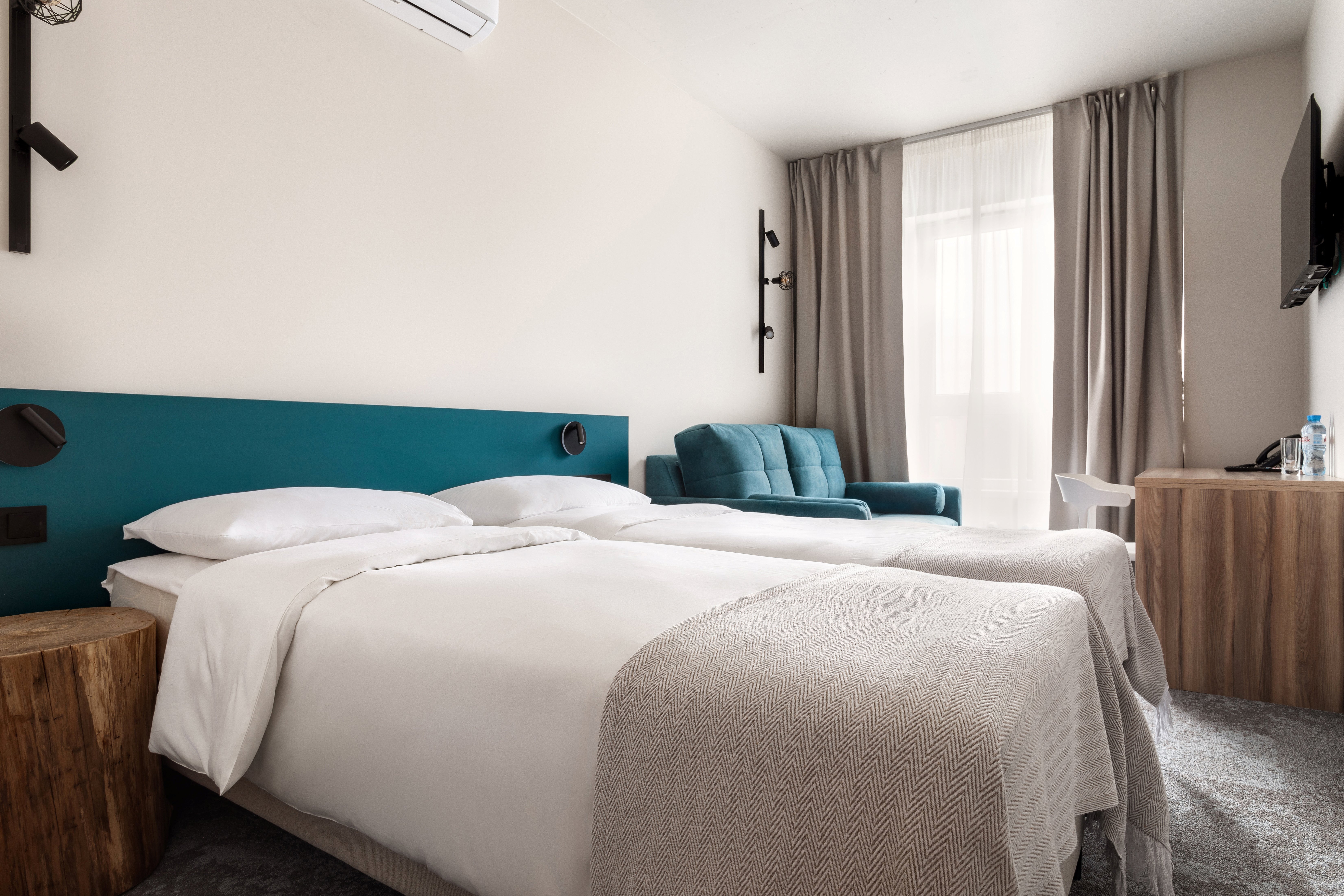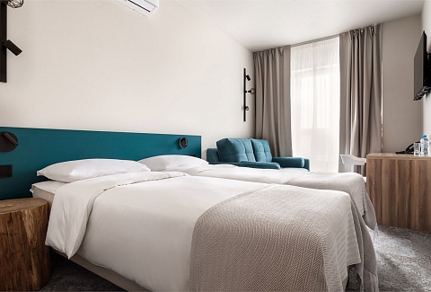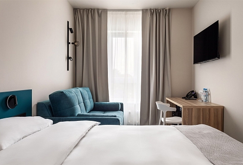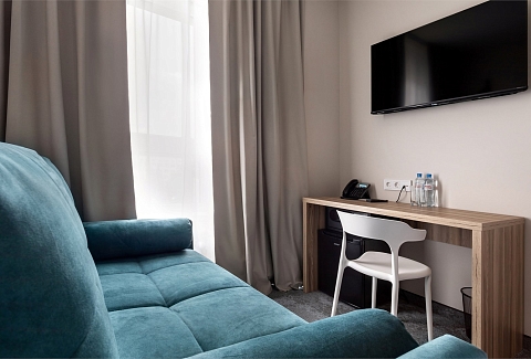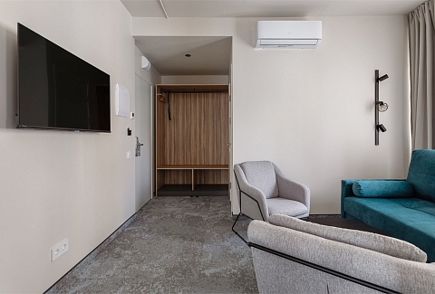 В номере: диван, зеркало, кровати односпальные /одна двуспальная кровать, прикроватные тумбочки, стол, стул, шкаф, кондиционер, сейф, телевизор ЖК, телефон, чайный набор посуды, электрочайник