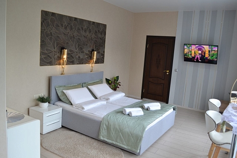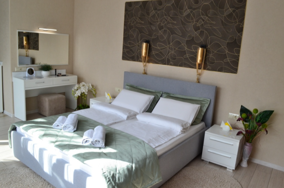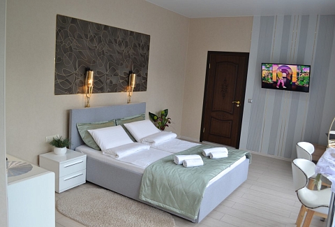В номере: зеркало, кровать двуспальная, прикроватные тумбочки, стол, стул, шкаф, кондиционер, телевизор ЖК