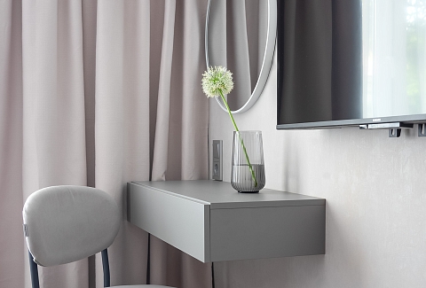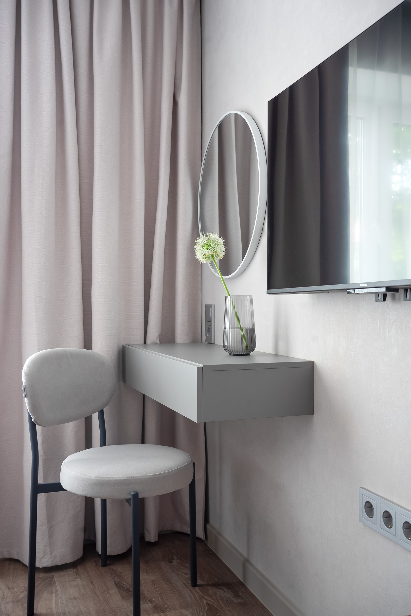 В номере: зеркало, кресло-кровать, кровать двуспальная, прикроватные столики, стол, стулья, шкаф, гладильная доска, микроволновая печь, набор посуды, плита газовая, стиральная машина, сушилка для белья, телевизор ЖК, утюг, холодильник, чайный набор посуды, электрочайник