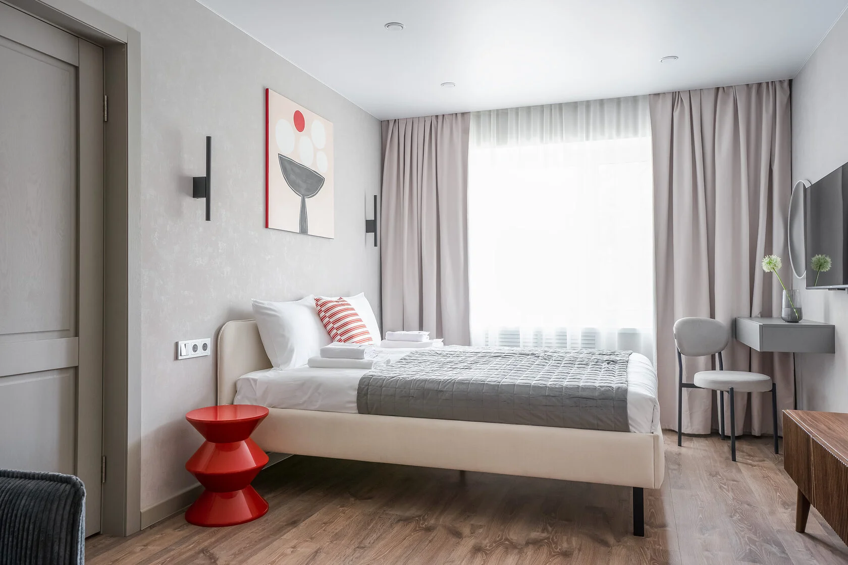 Единый стандарт качества: белоснежное постельное белье из прачечной. Влажная уборка после каждого выезда. Наличие необходимых в быту вещей: личные средства гигиены, посуда, техника.Современные апартаменты сочетает в себе стиль и функциональность, создавая атмосферу, где каждый гость сможет расслабиться и насладиться временем вдали от дома.
