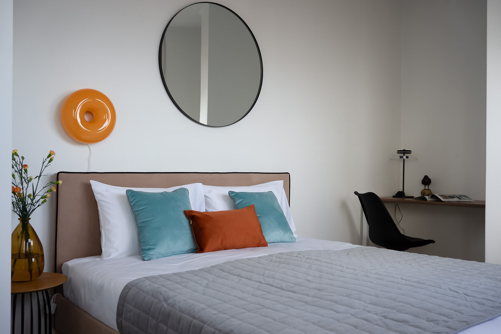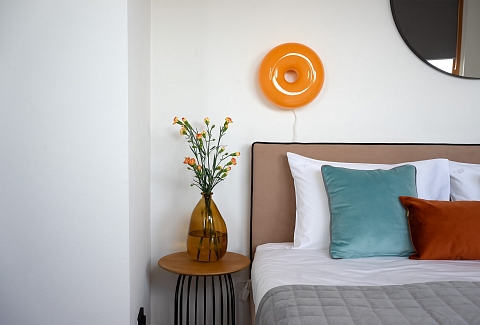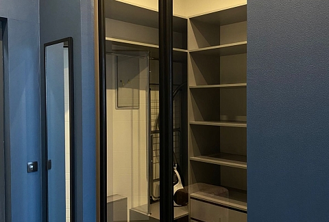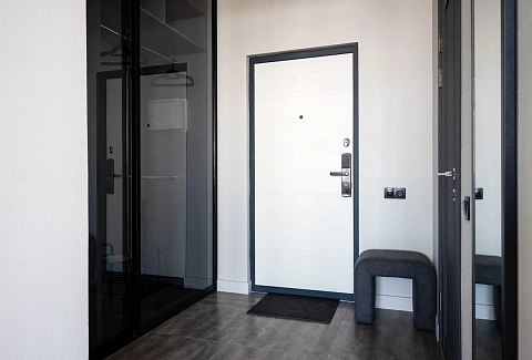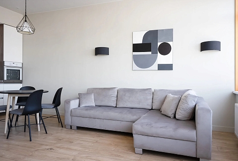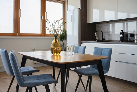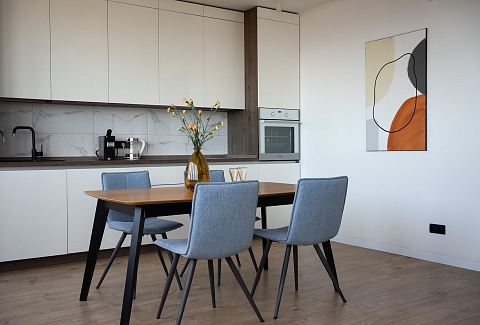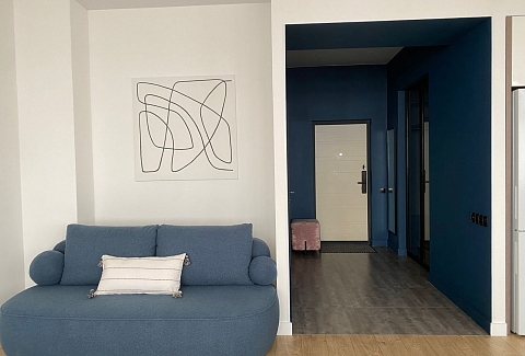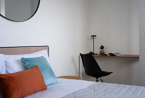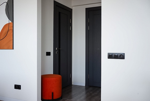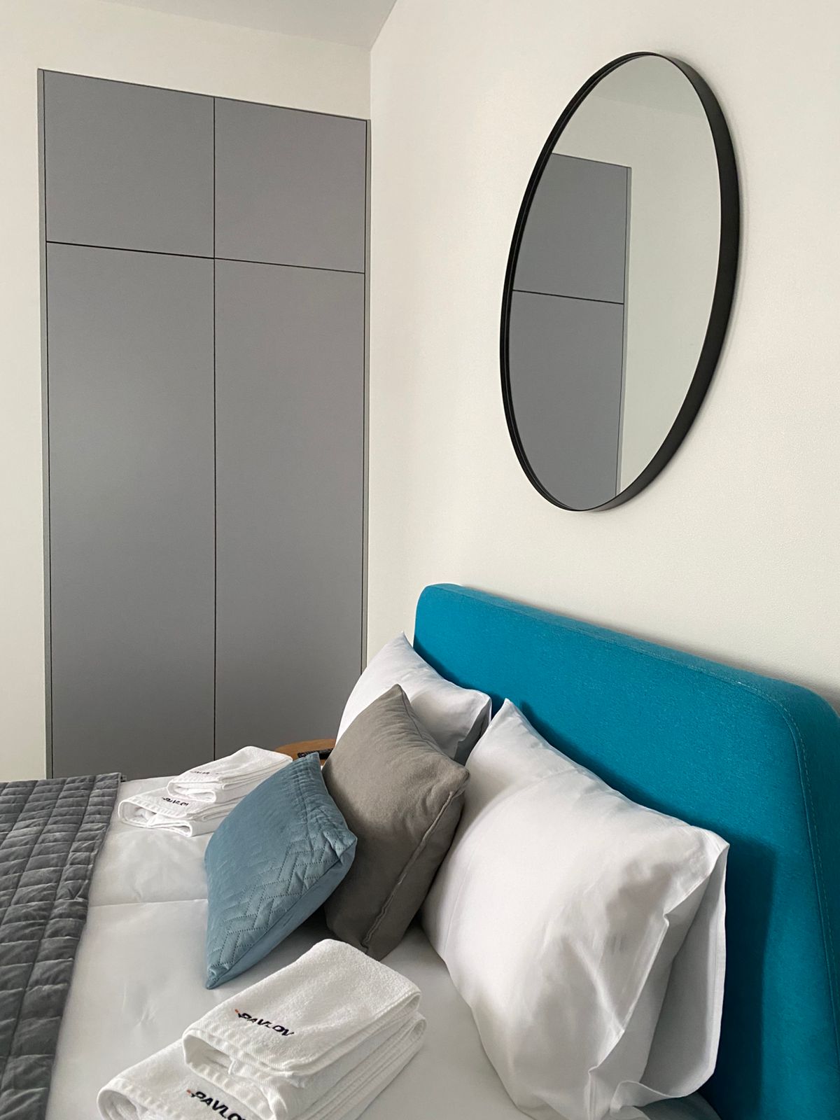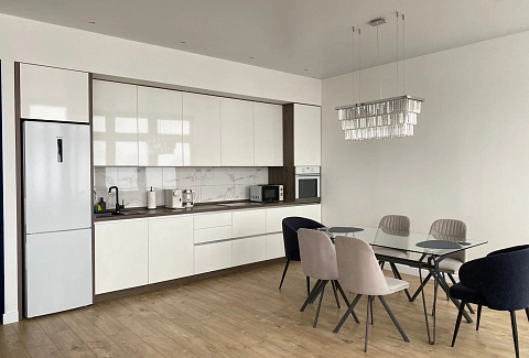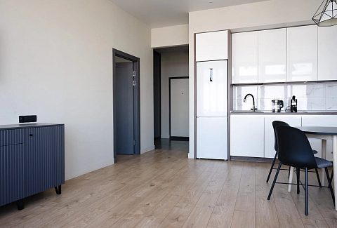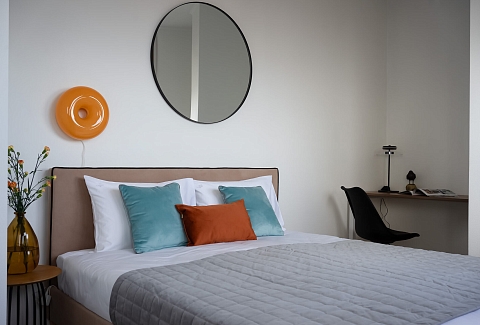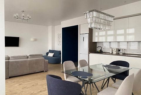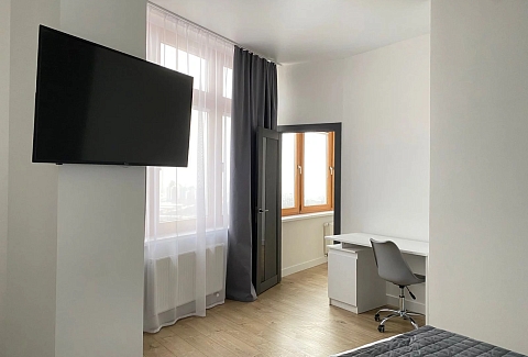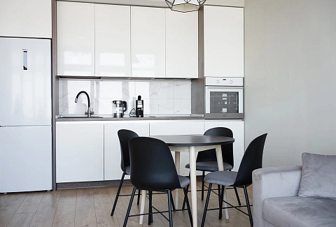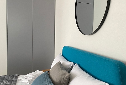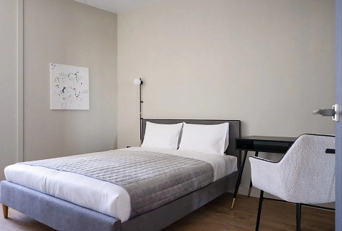В номере: вешалка, диван раскладной, зеркало, кровать двуспальная, прикроватная тумбочка, стол, стулья, шкаф, гладильная доска, духовой шкаф, кондиционер, кофемашина, микроволновая печь, набор посуды, плита электрическая, стиральная машина, сушилка для белья, телевизор ЖК, утюг, холодильник, чайный набор посуды, электрочайник