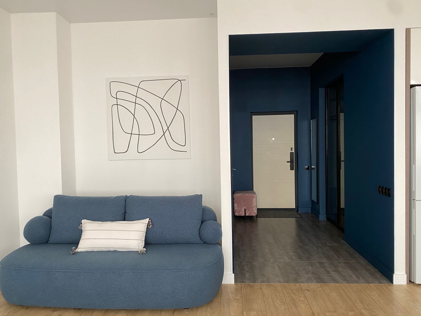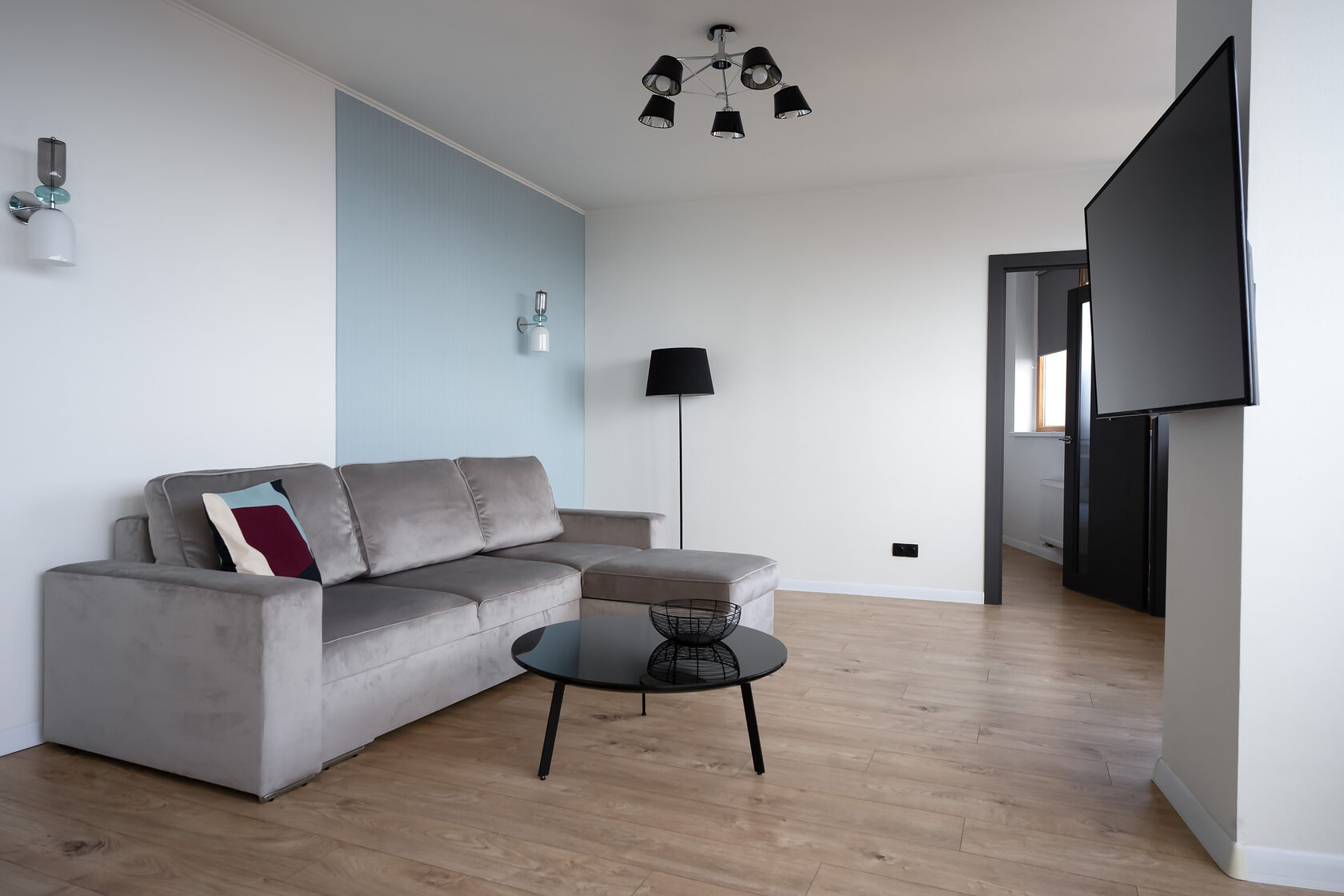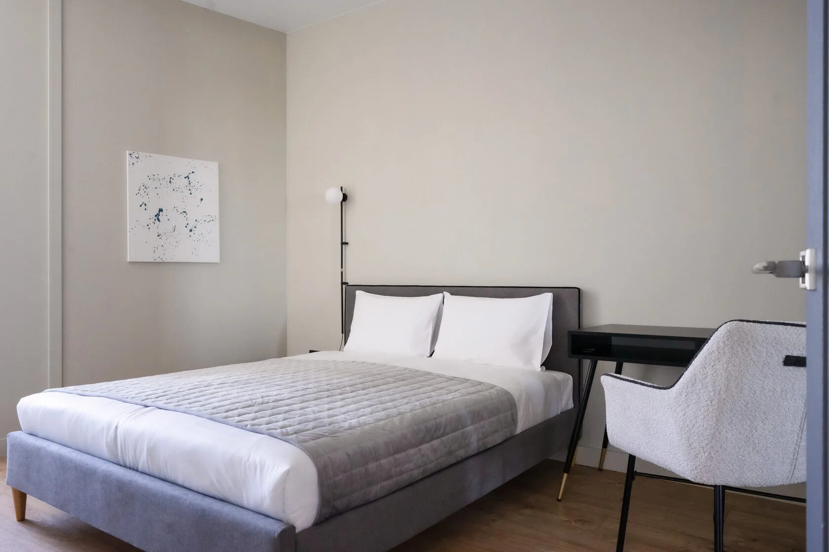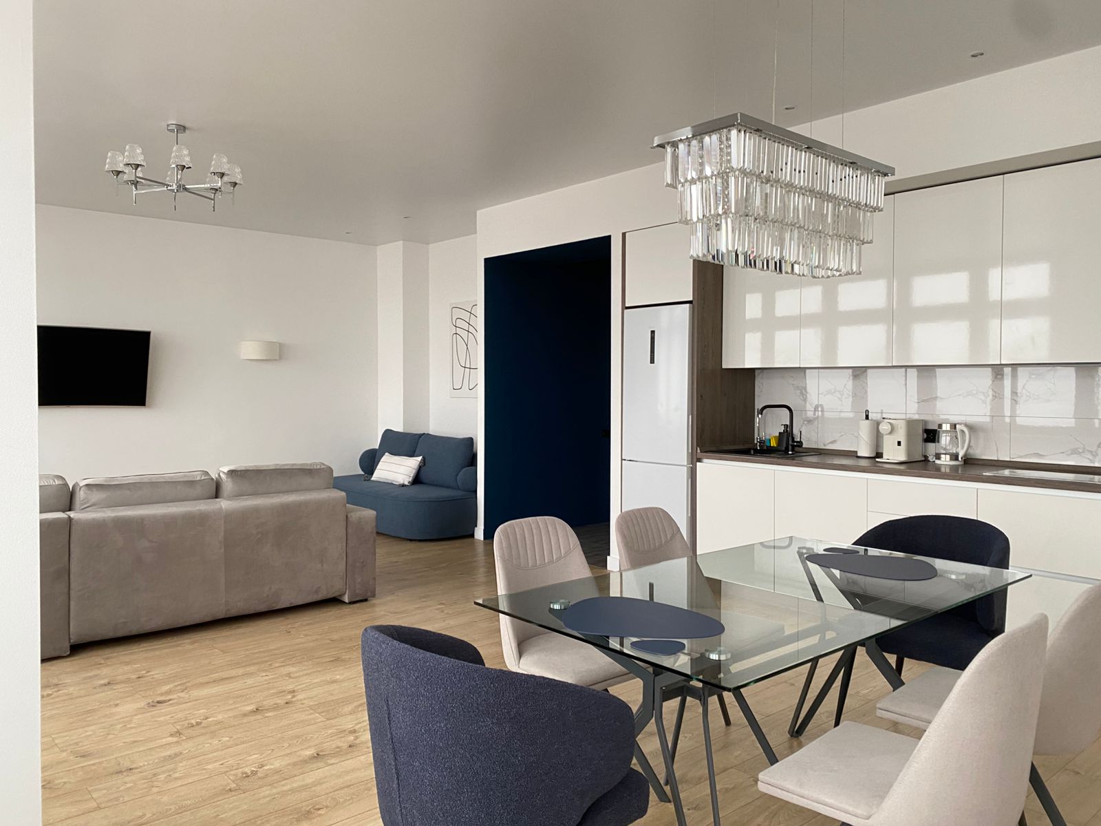 В номере: вешалка, диван раскладной, зеркало, кровать двуспальная, прикроватная тумбочка, стол, стулья, шкаф, гладильная доска, духовой шкаф, кондиционер, кофемашина, микроволновая печь, набор посуды, плита электрическая, стиральная машина, сушилка для белья, телевизор ЖК, утюг, холодильник, чайный набор посуды, электрочайник