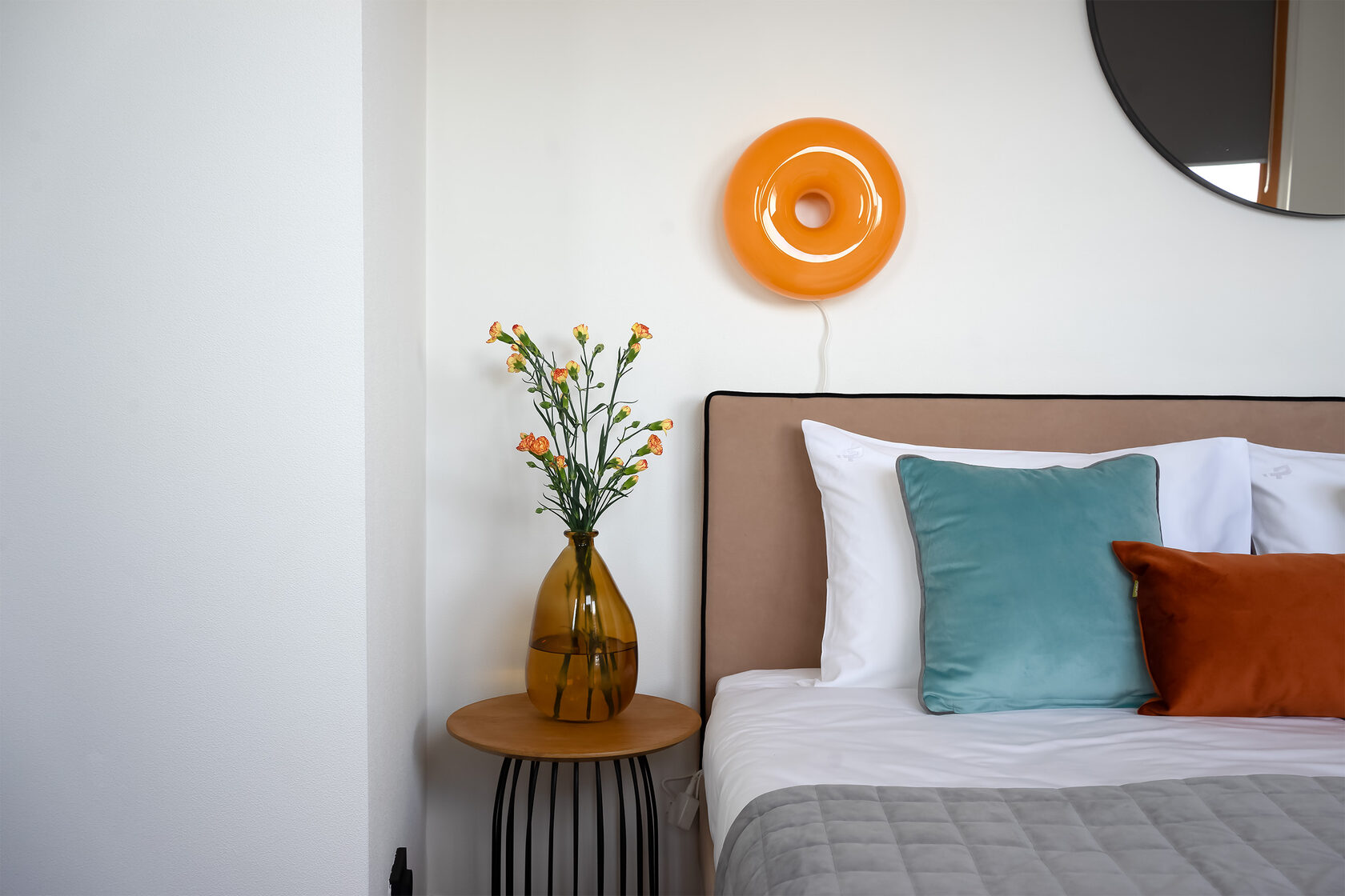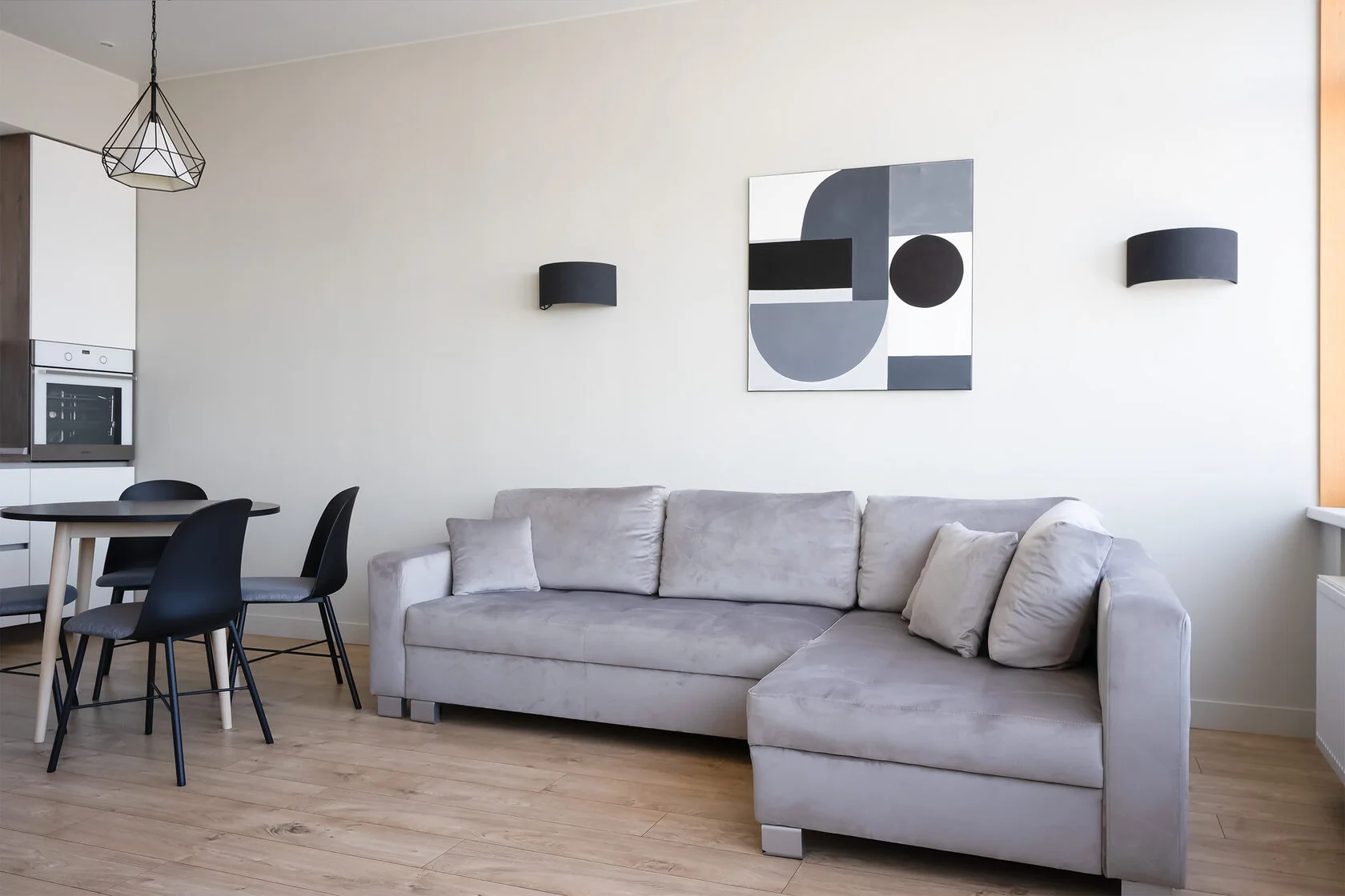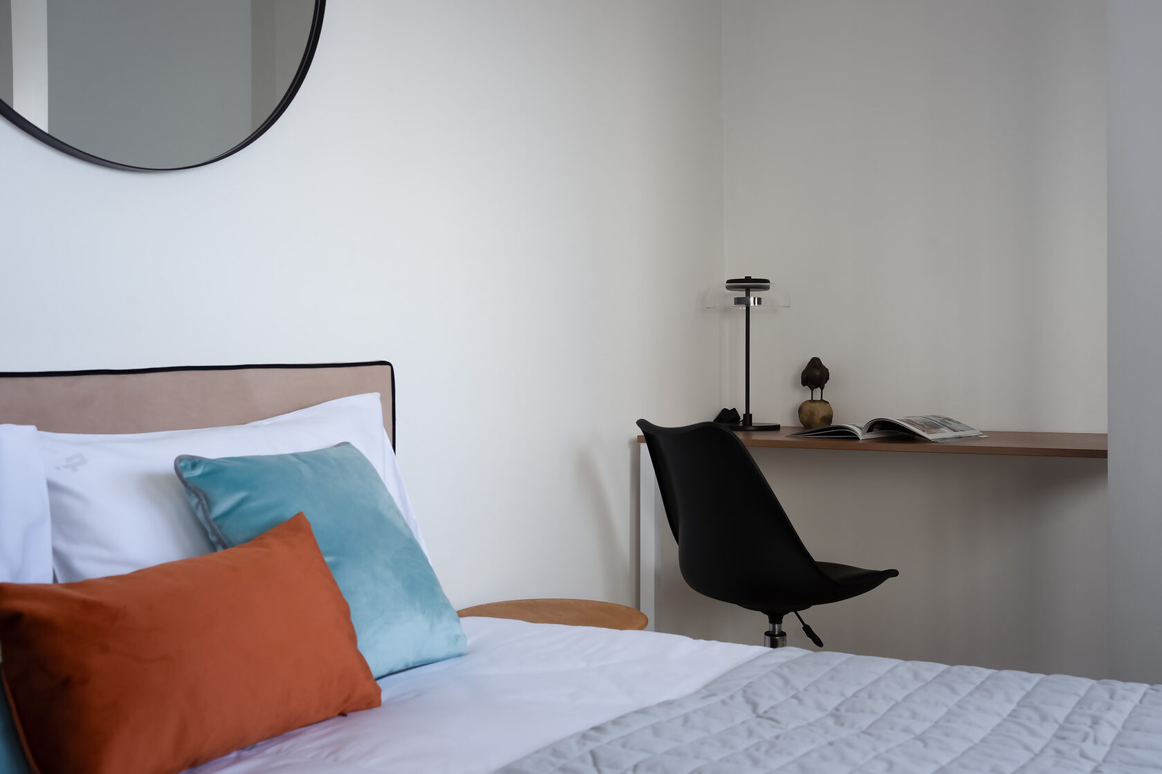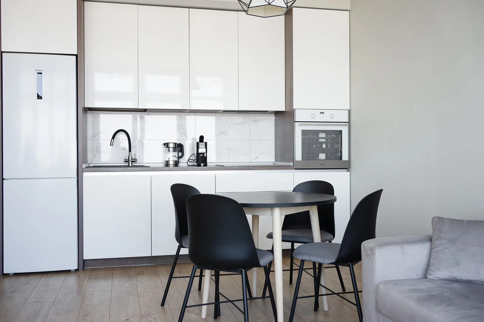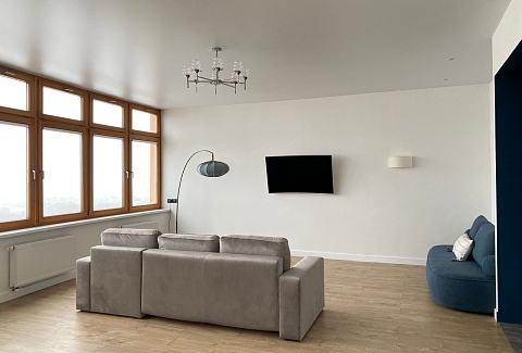В номере: вешалка, диван раскладной, зеркало, кровать двуспальная, прикроватная тумбочка, стол, стулья, шкаф, гладильная доска, духовой шкаф, кондиционер, кофемашина, микроволновая печь, набор посуды, плита электрическая, стиральная машина, сушилка для белья, телевизор ЖК, утюг, холодильник, чайный набор посуды, электрочайник