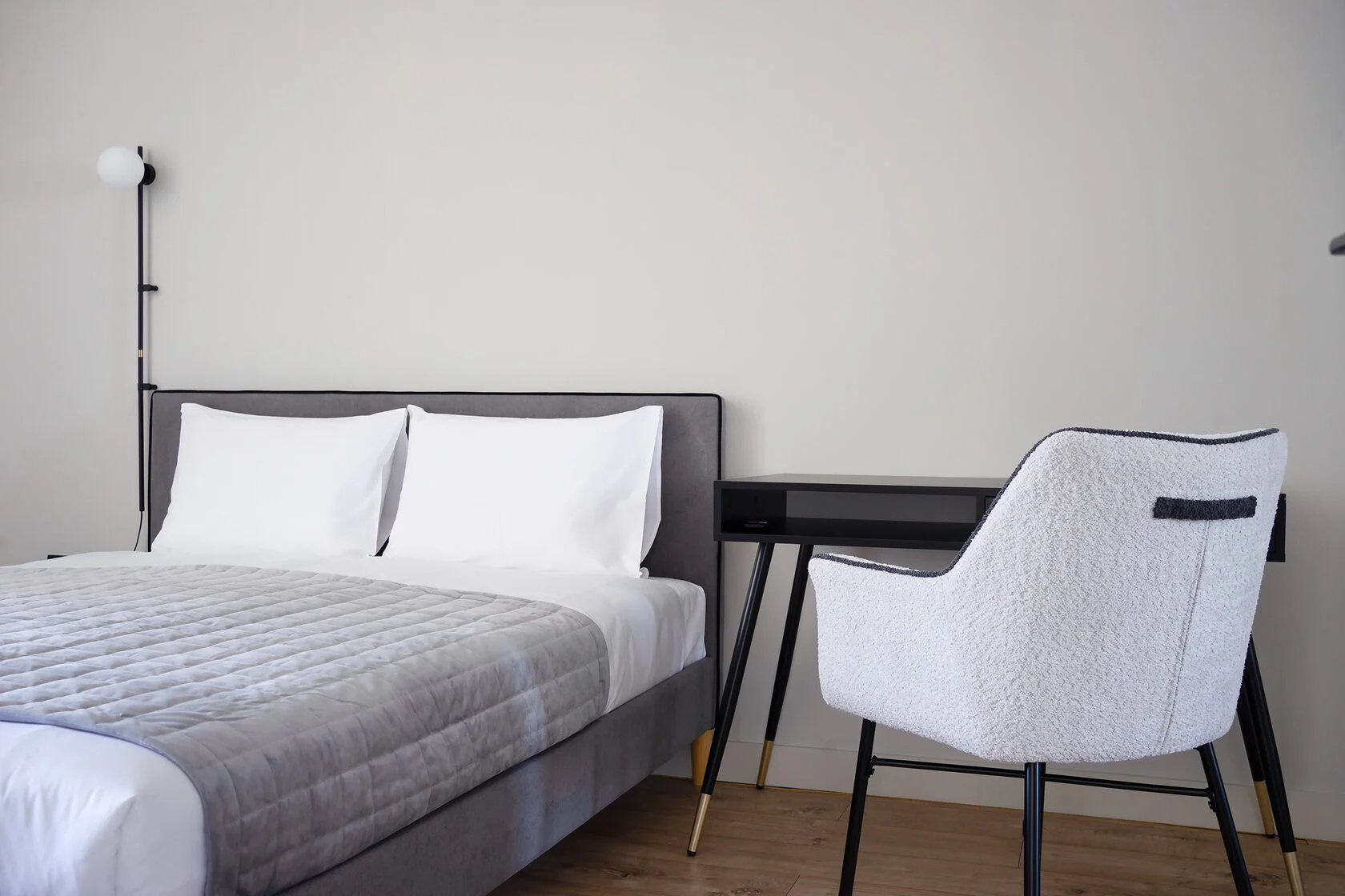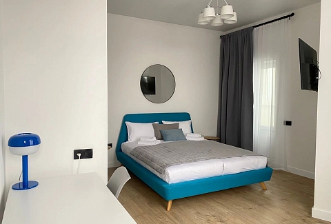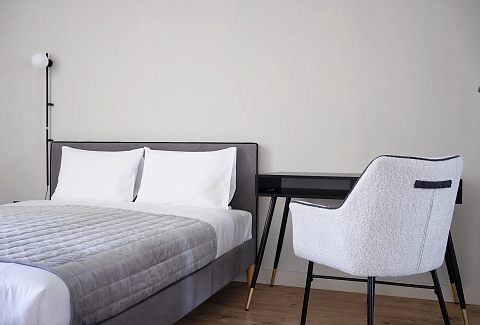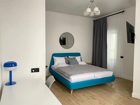 В номере: вешалка, диван раскладной, зеркало, кровать двуспальная, прикроватные тумбочки, стол, стулья, шкаф, гладильная доска, духовой шкаф, кондиционер, микроволновая печь, набор посуды, плита электрическая, стиральная машина, сушилка для белья, телевизор ЖК, утюг, холодильник, чайный набор посуды, электрочайник