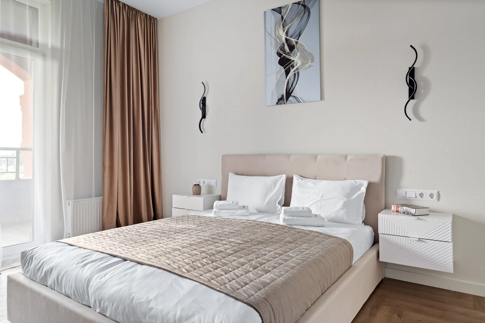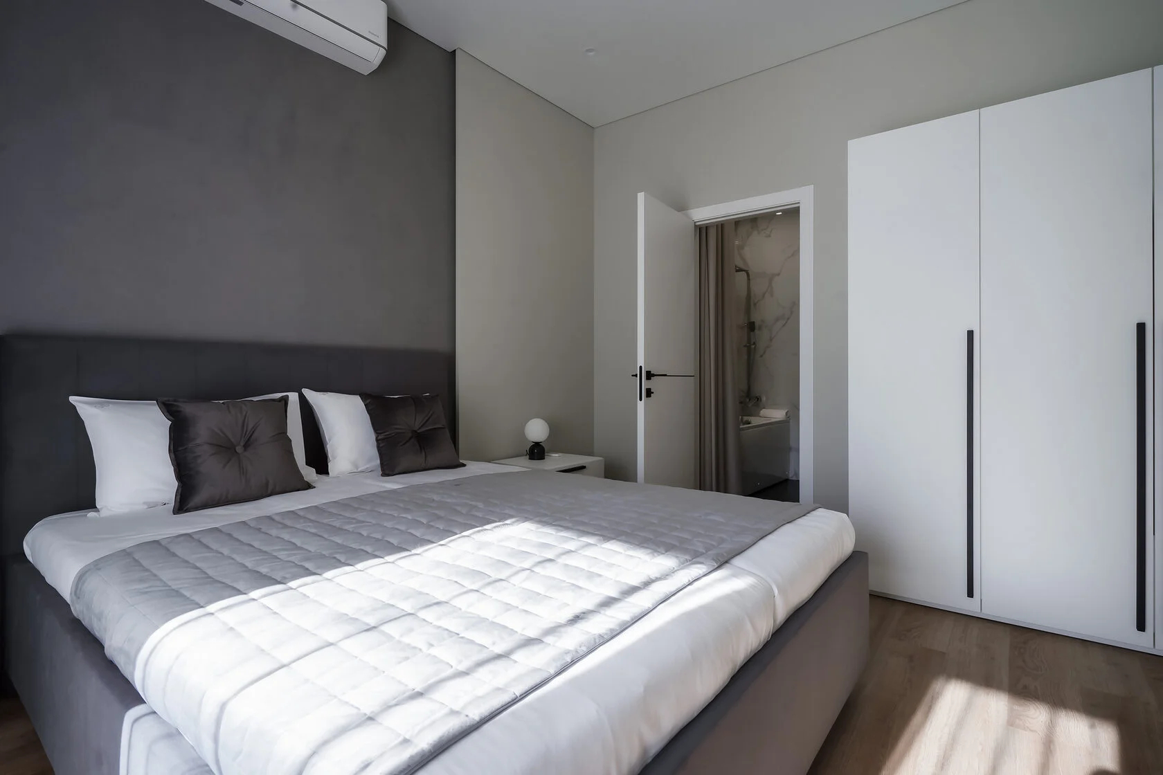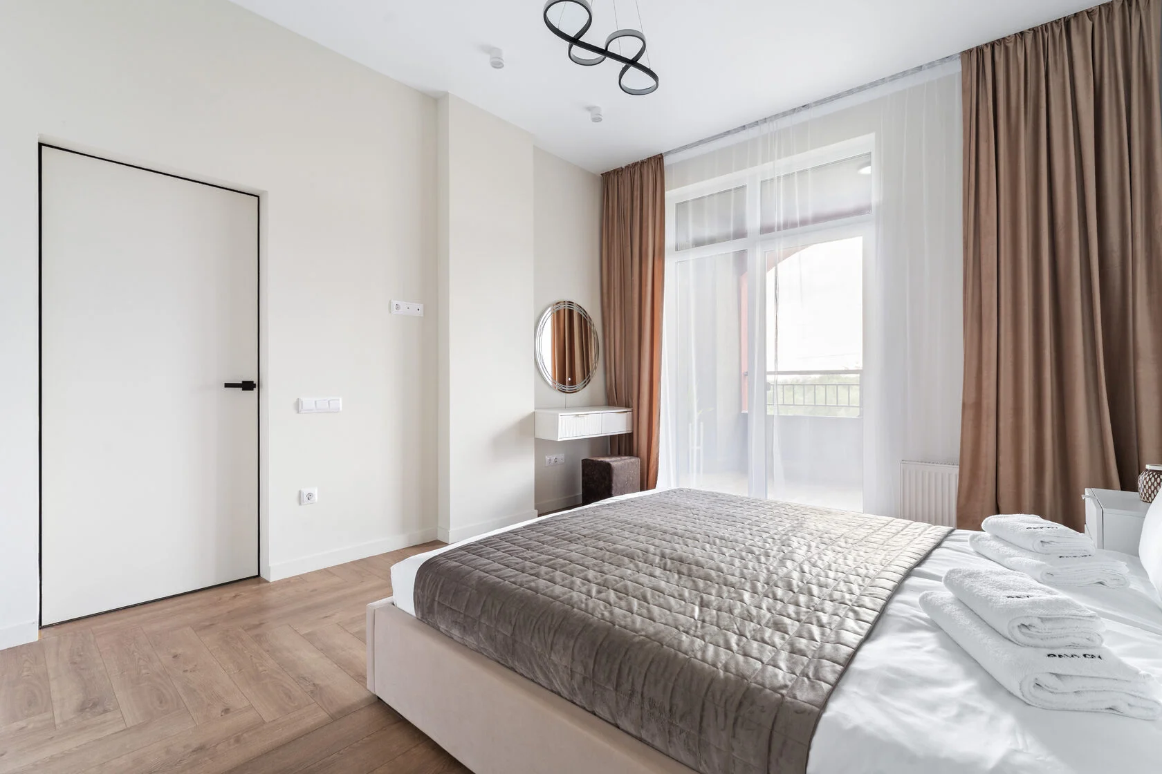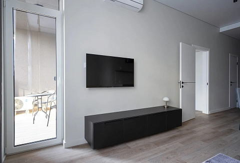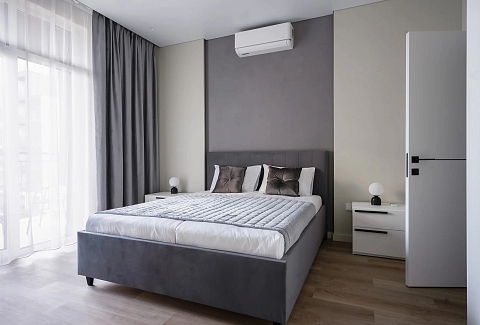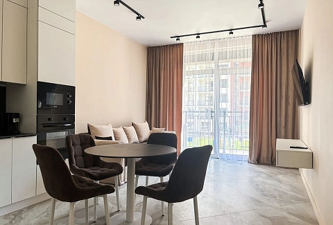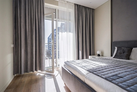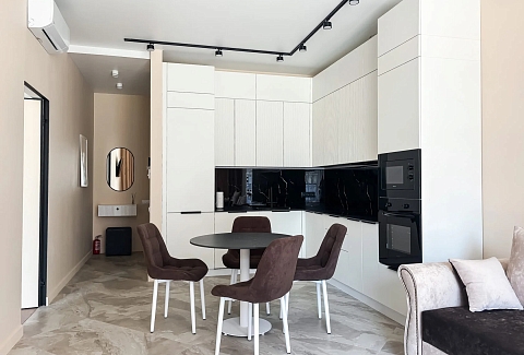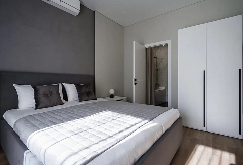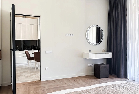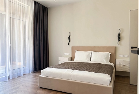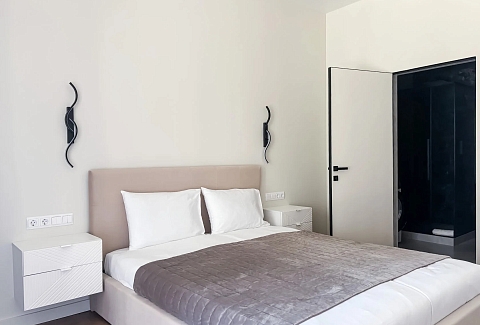 В номере: вешалка, диван, зеркало, кровать двуспальная, прикроватные тумбочки, стол, стулья, шкаф, кондиционер, микроволновая печь, набор посуды, плита электрическая, стиральная машина, телевизор ЖК, утюг, холодильник, чайный набор посуды, электрочайник