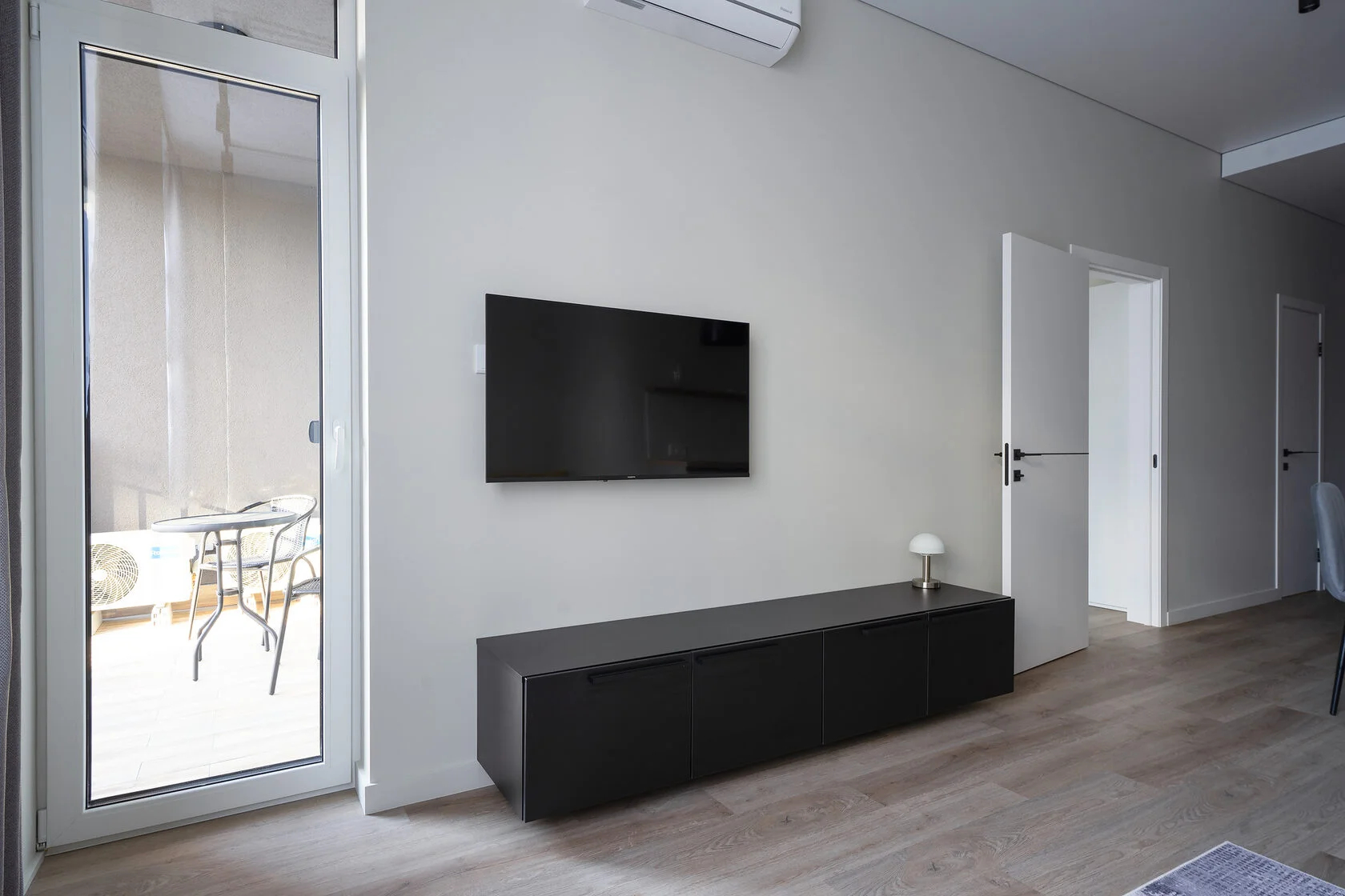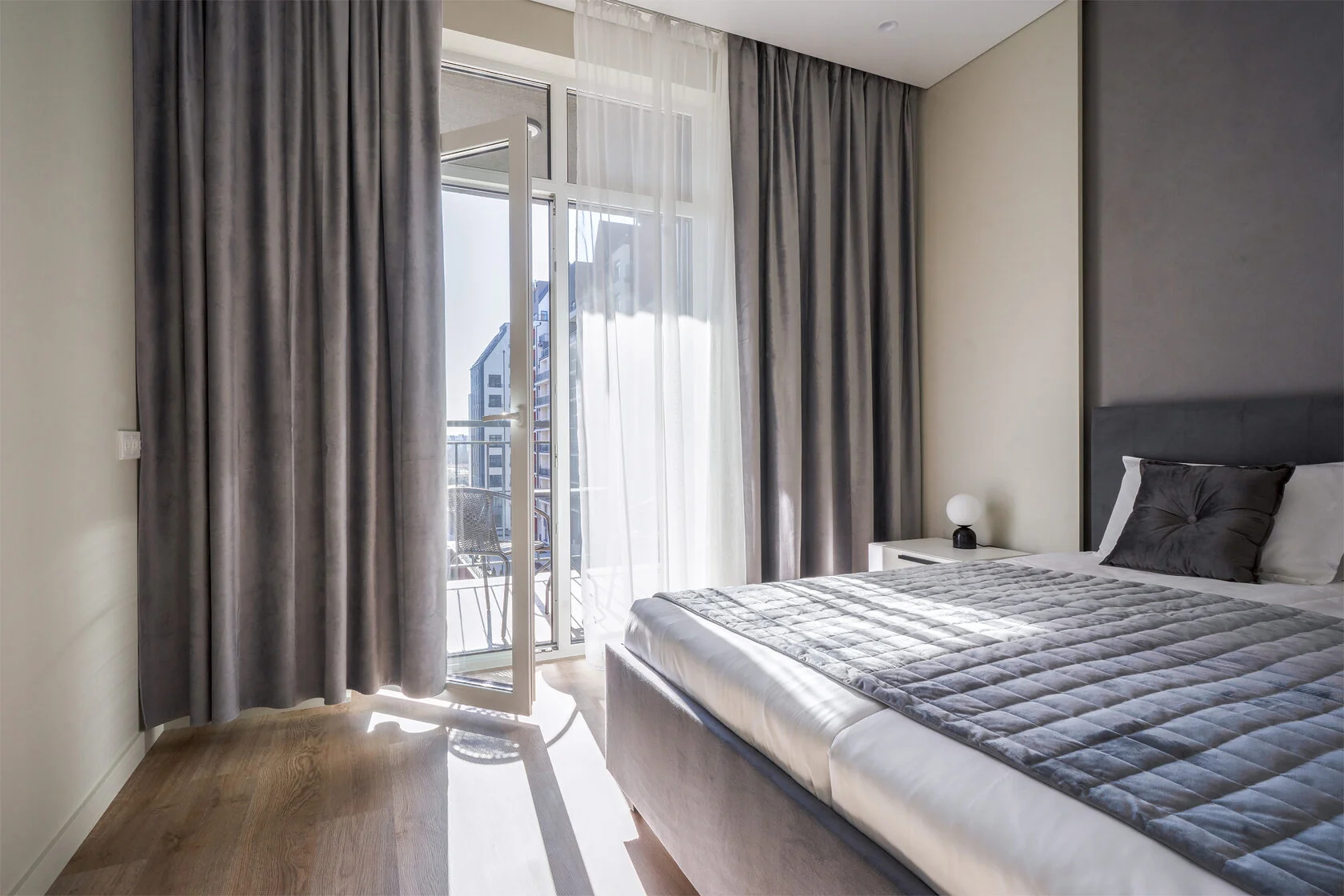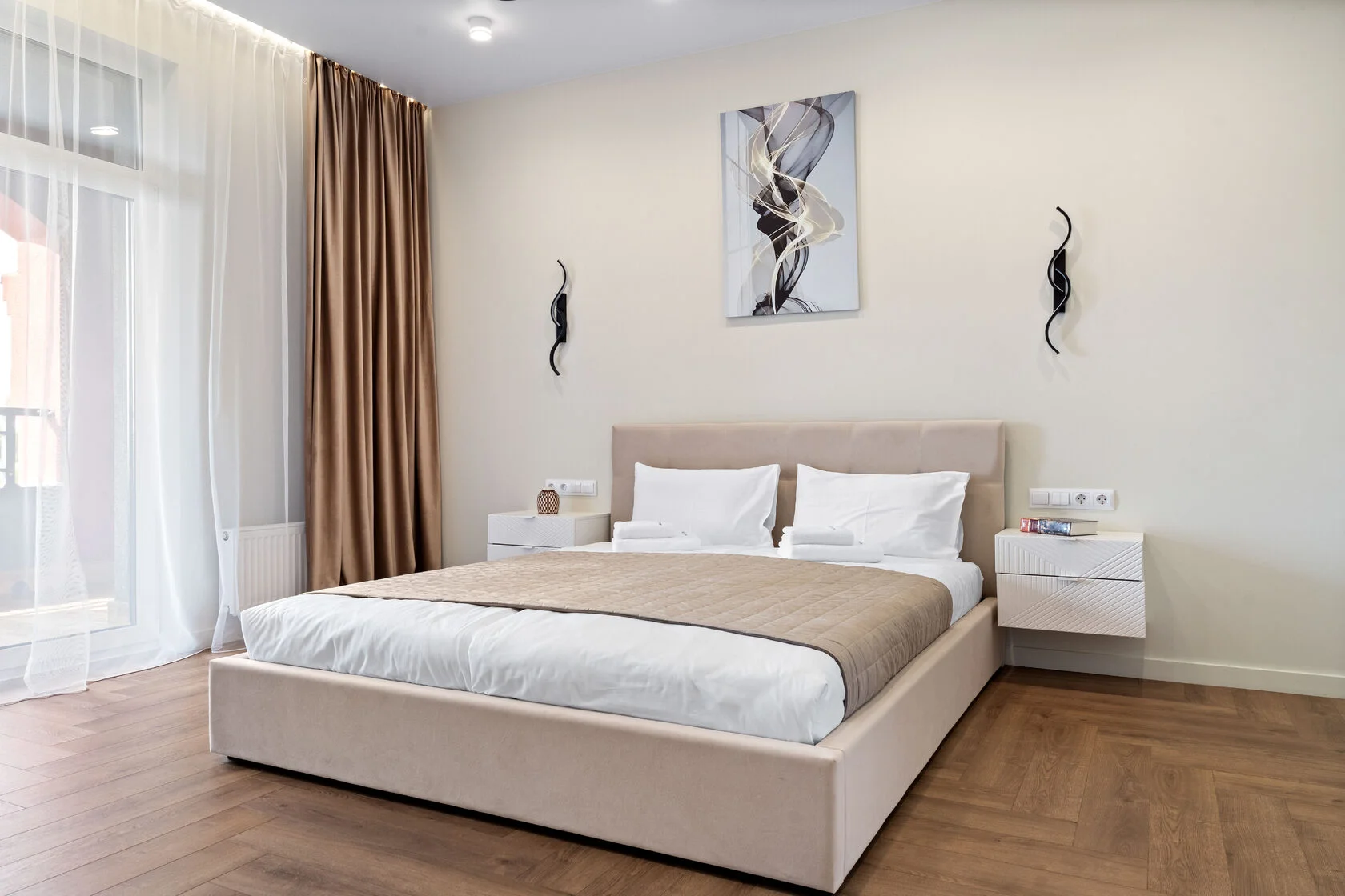 В номере: вешалка, диван, зеркало, кровать двуспальная, прикроватные тумбочки, стол, стулья, шкаф, кондиционер, микроволновая печь, набор посуды, плита электрическая, стиральная машина, телевизор ЖК, утюг, холодильник, чайный набор посуды, электрочайник