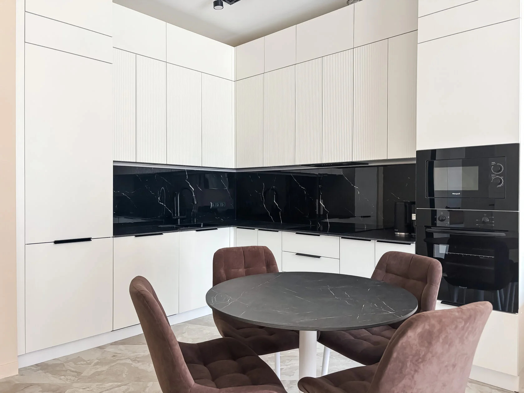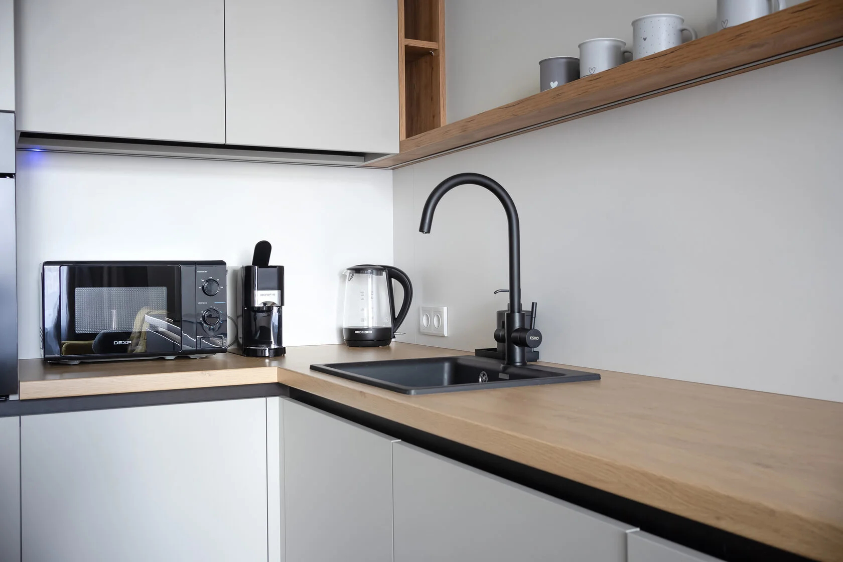 В номере: диван, кровать двуспальная, прикроватные тумбочки, стол, стулья, шкаф, гладильная доска, духовой шкаф, микроволновая печь, набор посуды, плита электрическая, стиральная машина, сушилка для белья, телевизор ЖК, утюг, холодильник, чайный набор посуды, электрочайник