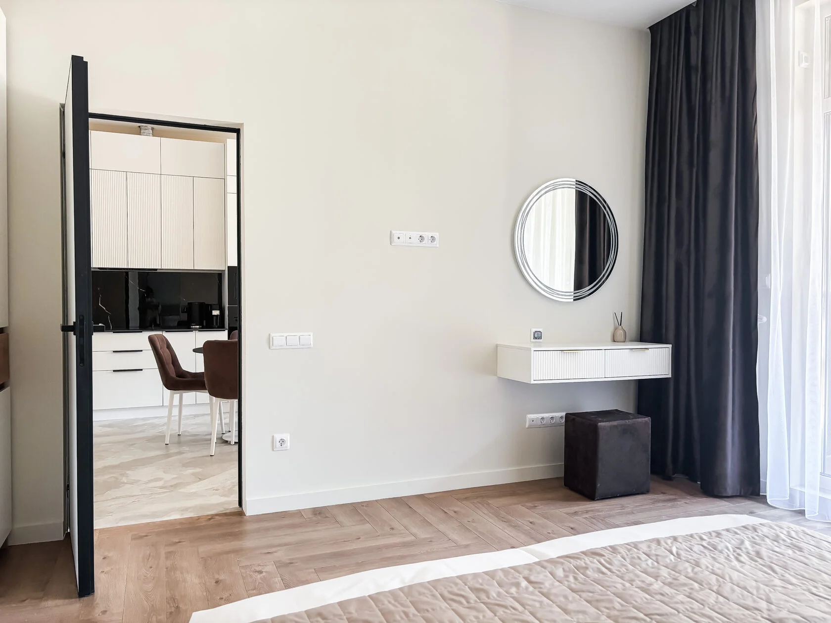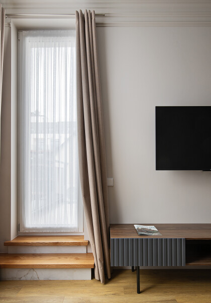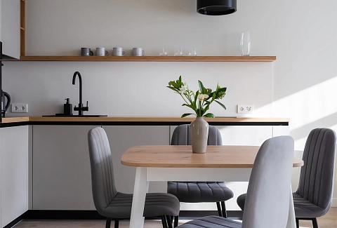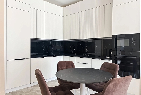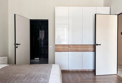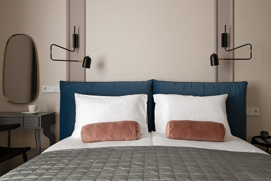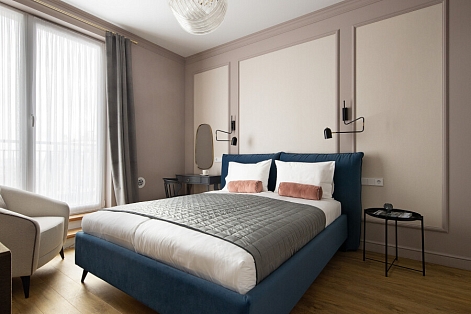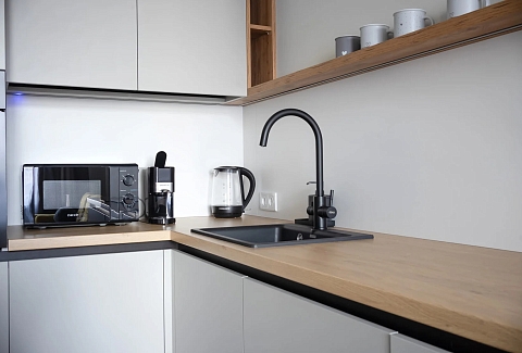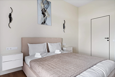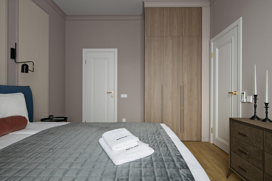 В номере: диван, зеркало, кровать двуспальная, стол, стулья, шкаф, гладильная доска, духовой шкаф, кондиционер, микроволновая печь, набор посуды, плита электрическая, стиральная машина, сушилка для белья, телевизор ЖК, утюг, холодильник, чайный набор посуды, электрочайник