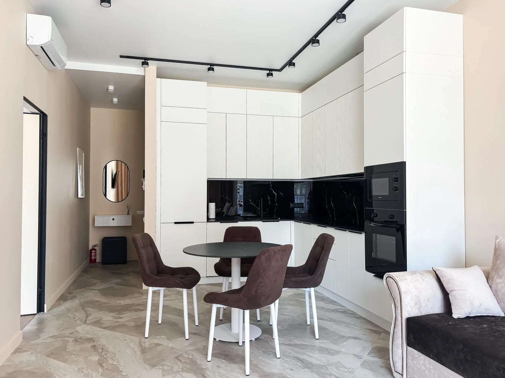 В номере: диван, зеркало, кровать двуспальная, стол, стулья, шкаф, кондиционер, микроволновая печь, набор посуды, плита электрическая, стиральная машина, сушилка для белья, телевизор ЖК, утюг, холодильник, чайный набор посуды, электрочайник