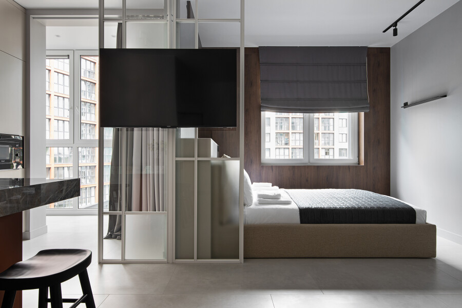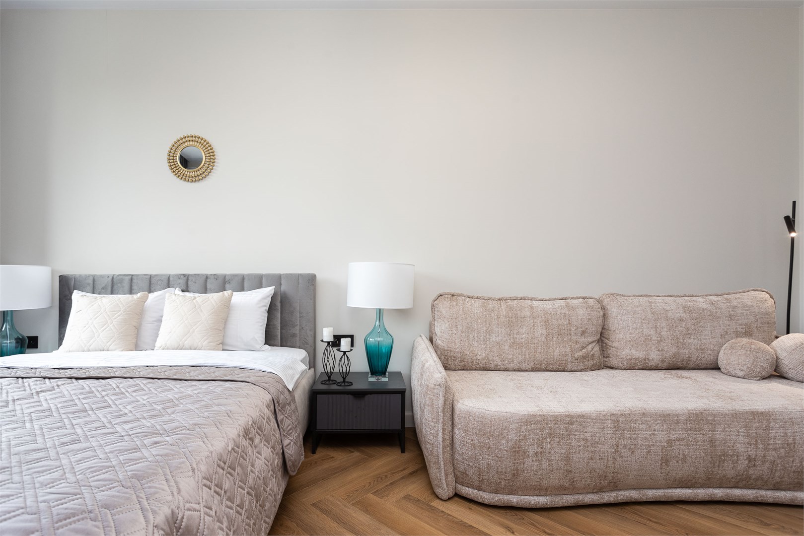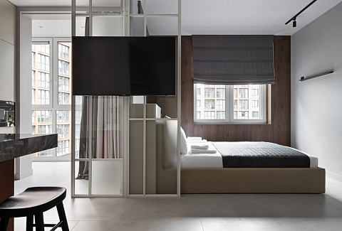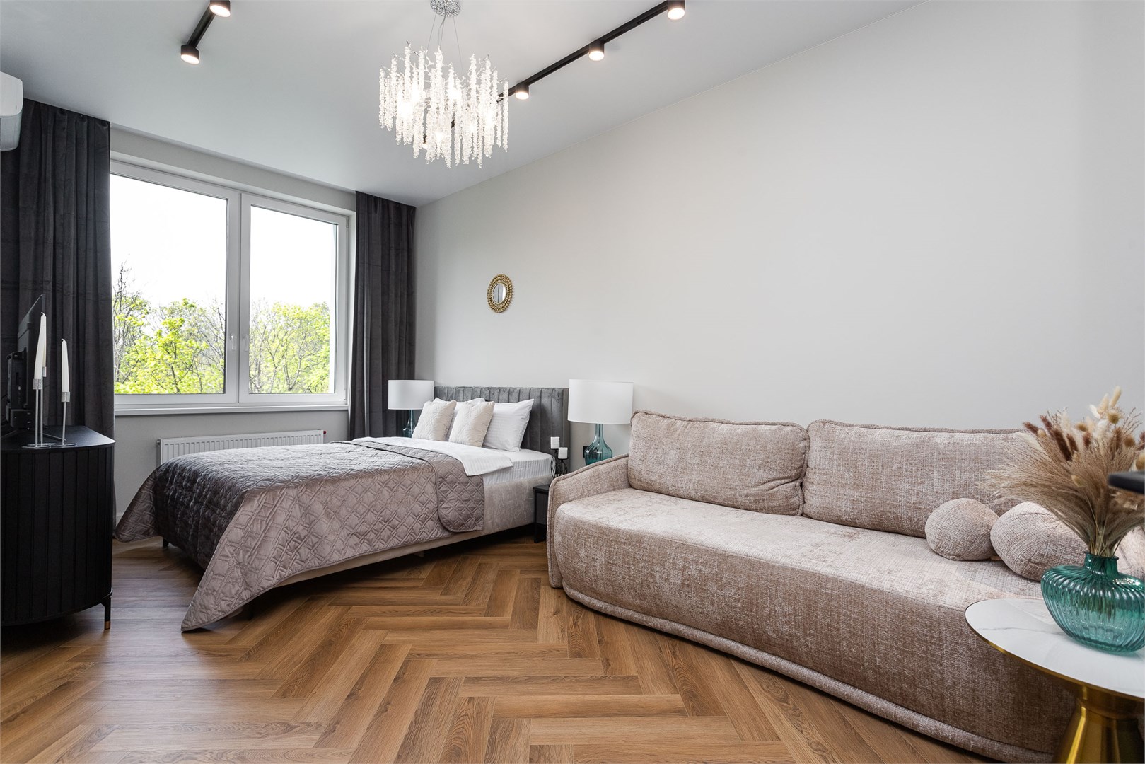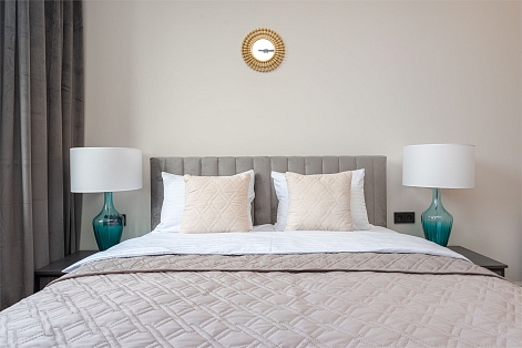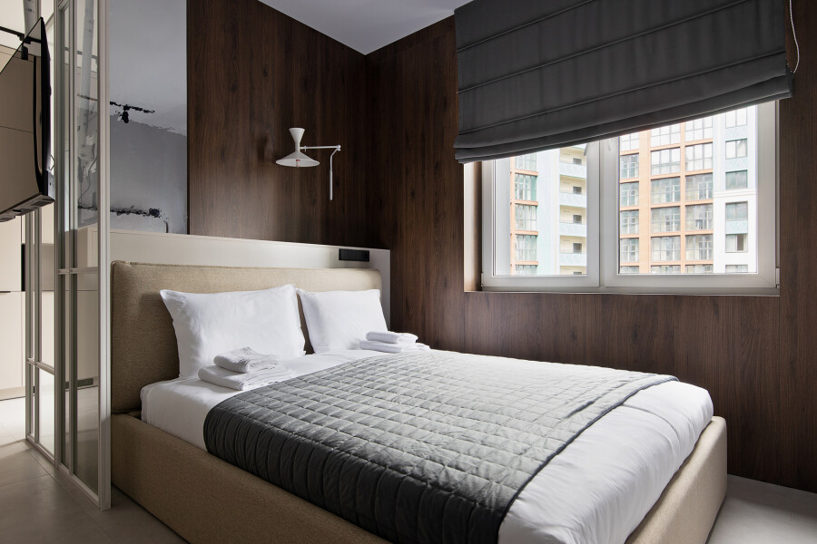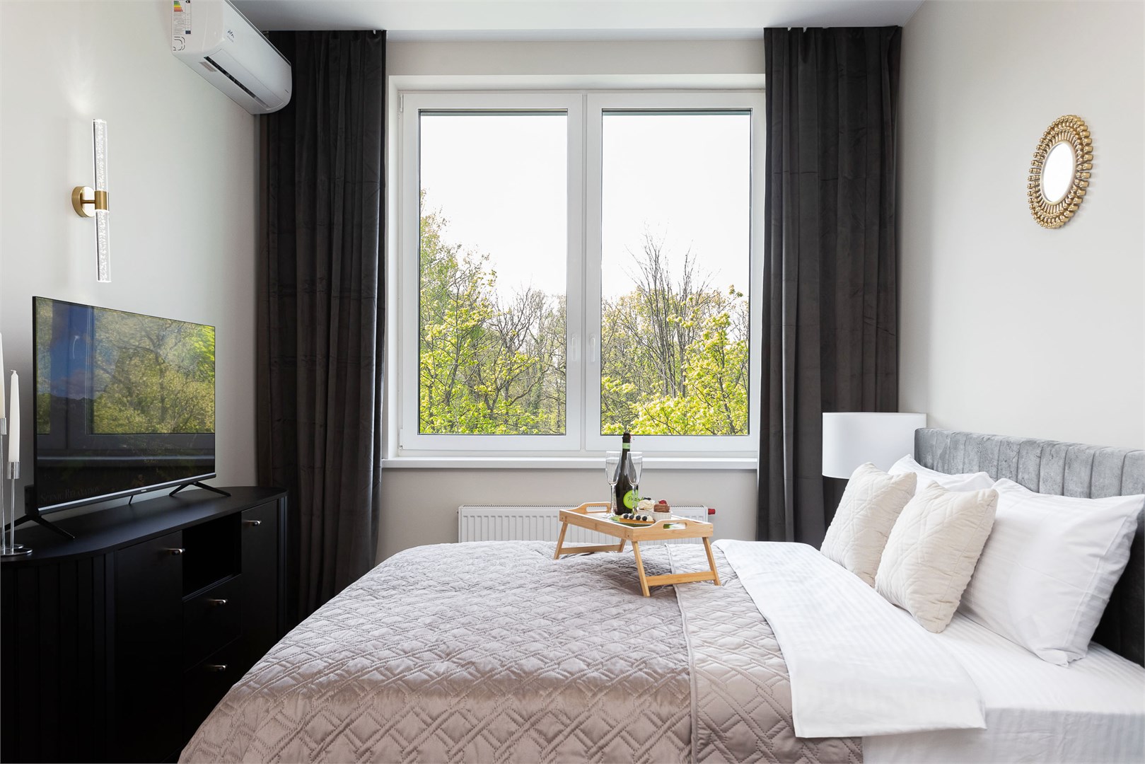 В номере: вешалка, диван, зеркало, кровать двуспальная, прикроватные тумбочки, стол, стулья, шкаф, кондиционер, кофемашина, микроволновая печь, набор посуды, плита электрическая, посудомоечная машина, стиральная машина, телевизор, холодильник, электрочайник