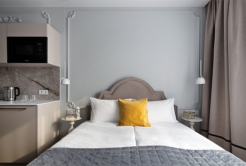 В номере: диван, зеркало, кровать двуспальная, стол, стулья, шкаф, гладильная доска, кондиционер, микроволновая печь, набор посуды, плита, телевизор ЖК, утюг, холодильник, чайный набор посуды, электрочайник