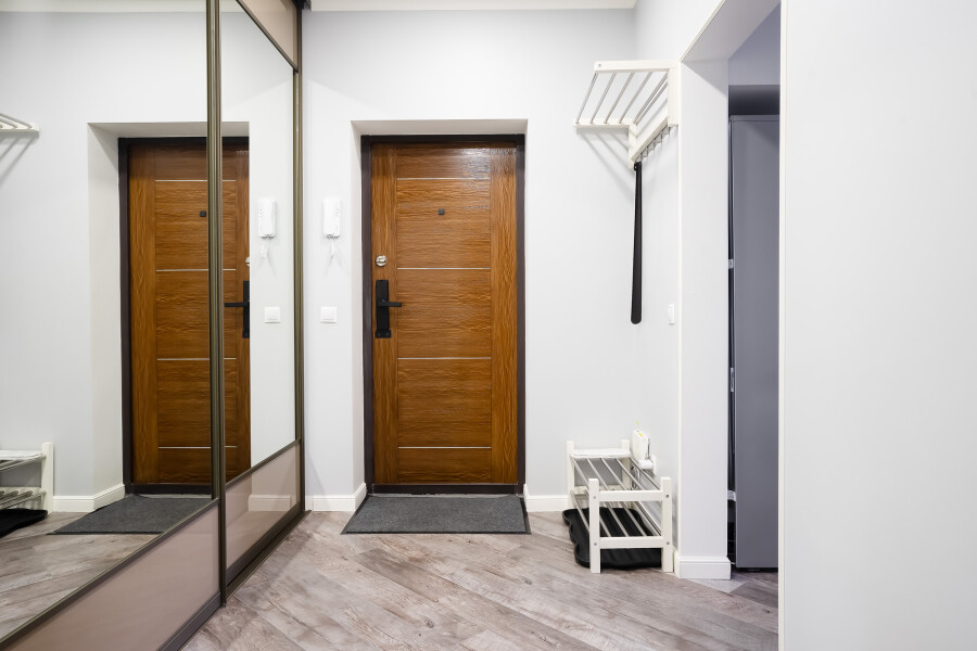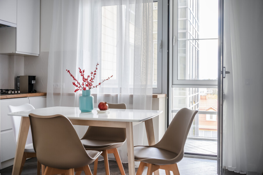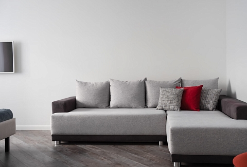 В номере: диван, зеркало, кровать двуспальная, стол, стулья, шкаф, гладильная доска, микроволновая печь, набор посуды, плита электрическая, стиральная машина, сушилка для белья, телевизор ЖК, утюг, холодильник, чайный набор посуды, электрочайник