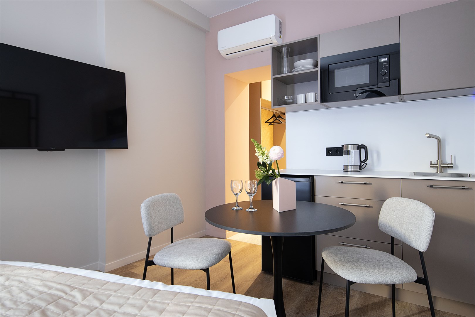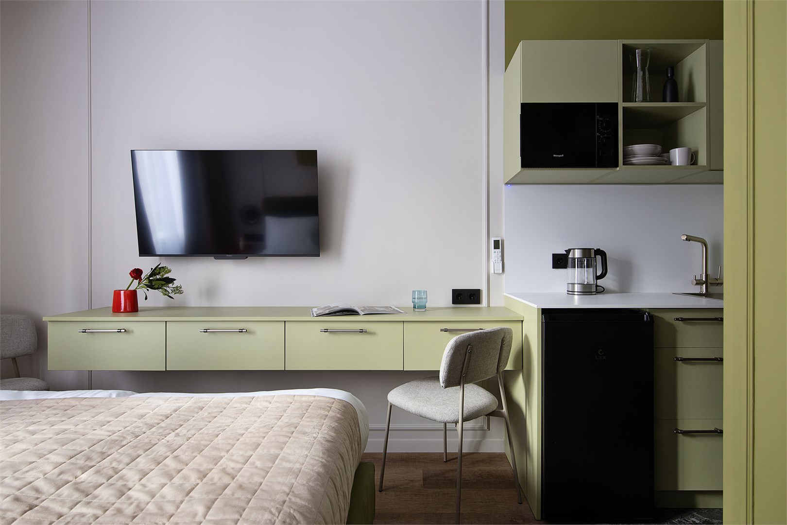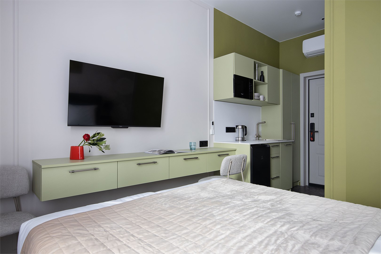 В номере: зеркало, кровать двуспальная, стол, стулья, шкаф, кондиционер, микроволновая печь, мини-холодильник, набор посуды, плита электрическая, стиральная машина, сушилка для белья, телевизор ЖК, утюг, чайный набор посуды, электрочайник