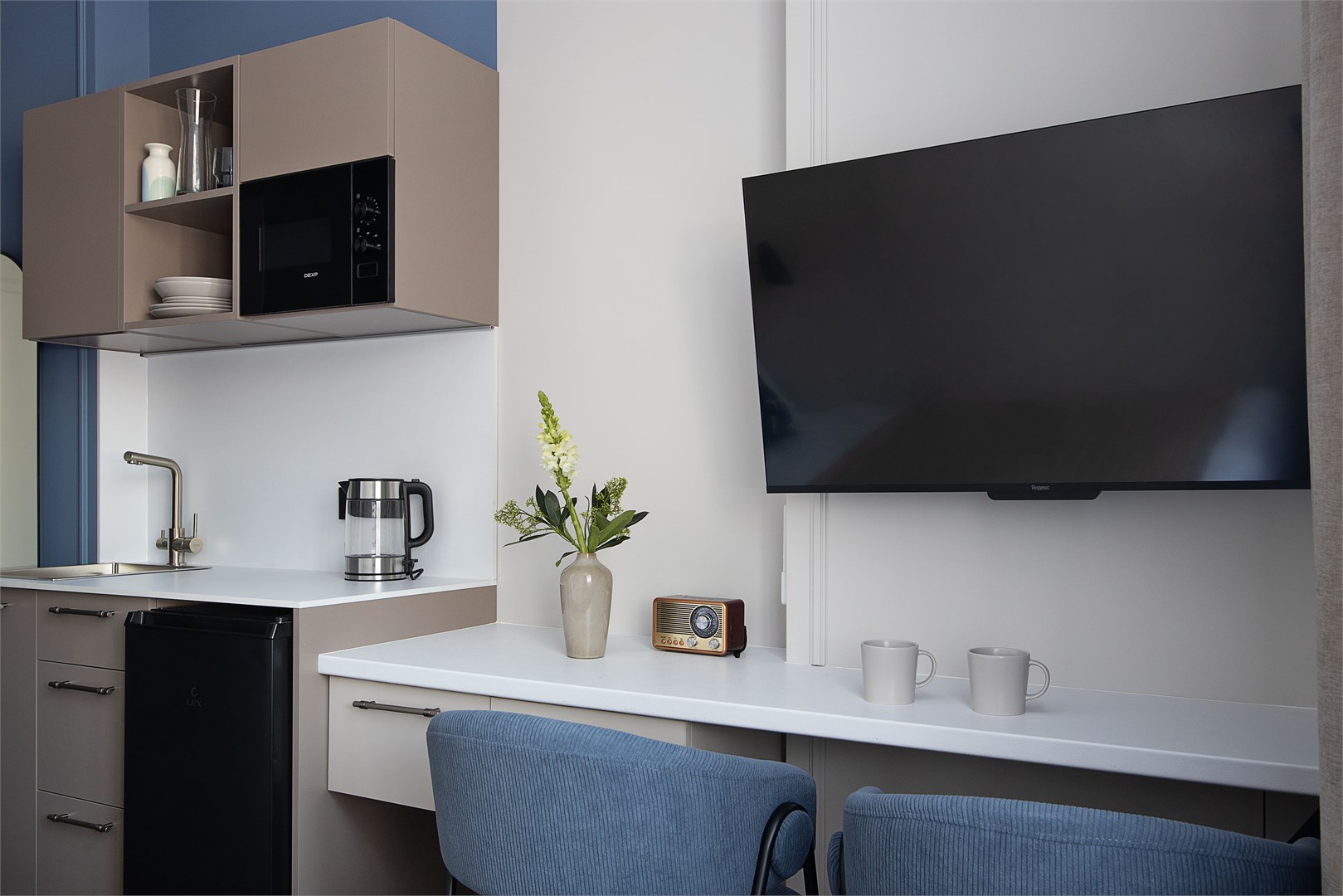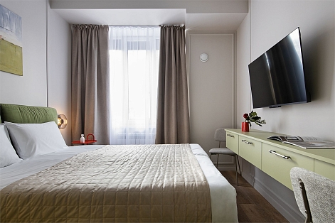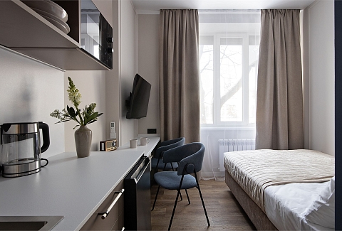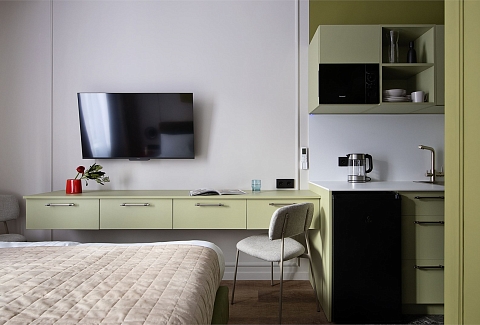В номере: зеркало, кровать полутороспальная, стол, стулья, шкаф, гладильная доска, кондиционер, микроволновая печь, мини-холодильник, набор посуды, плита электрическая, стиральная машина, телевизор ЖК, утюг, чайный набор посуды, электрочайник