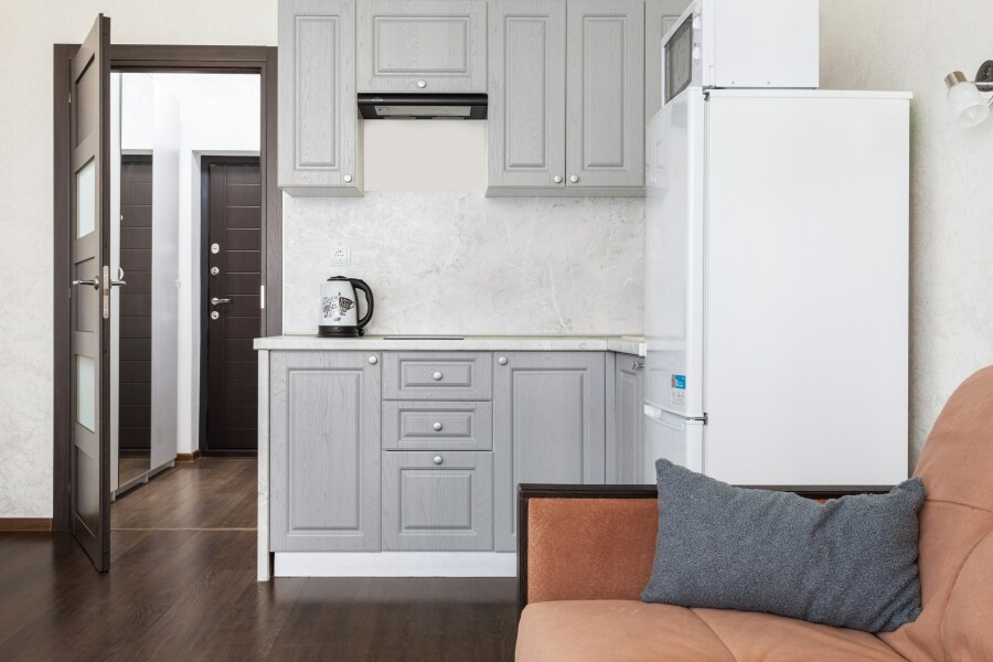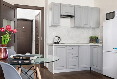 В номере: диван, зеркало, стол, стулья, шкаф, гладильная доска, микроволновая печь, набор посуды, плита электрическая, стиральная машина, сушилка для белья, телевизор ЖК, утюг, холодильник, чайный набор посуды, электрочайник