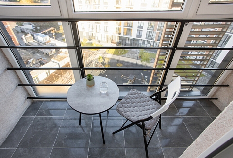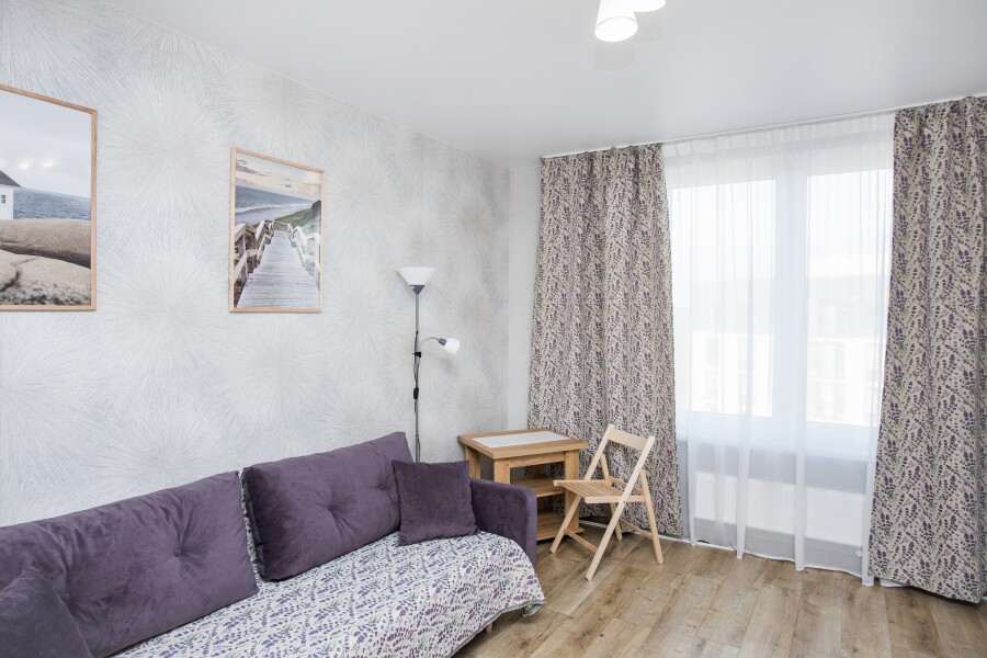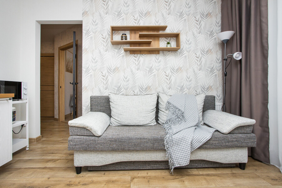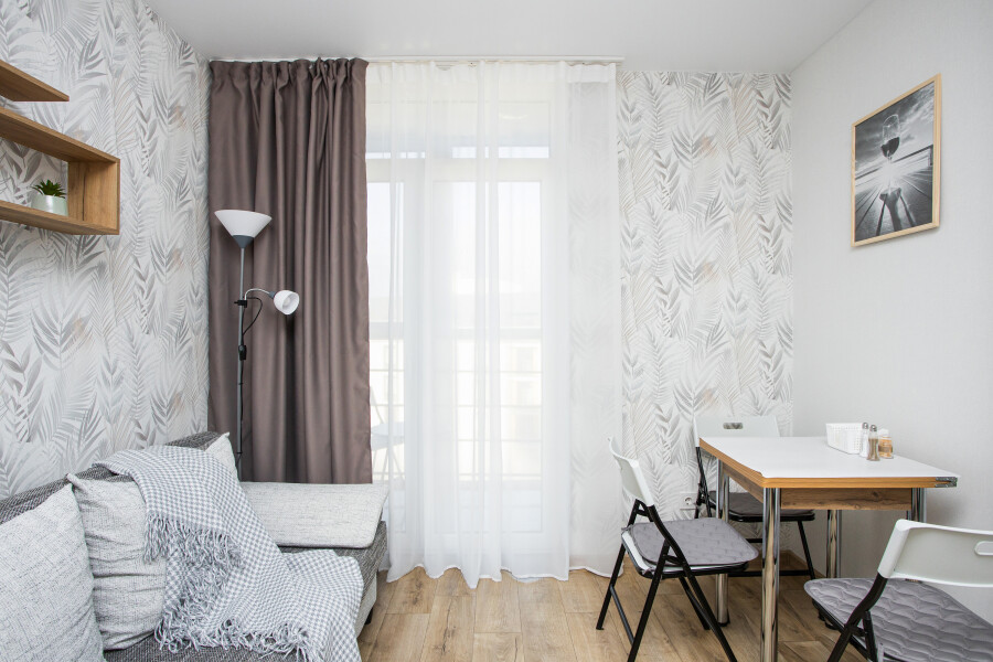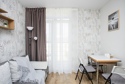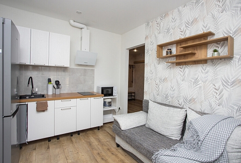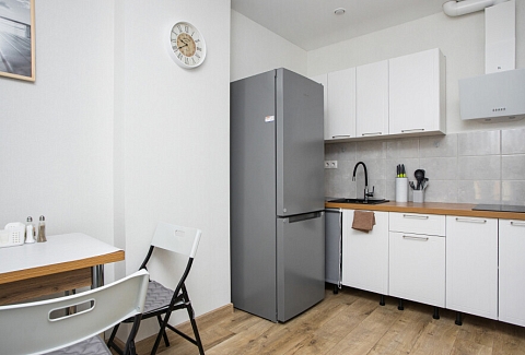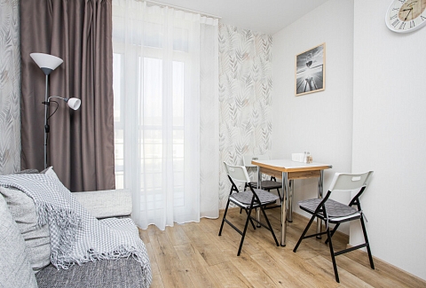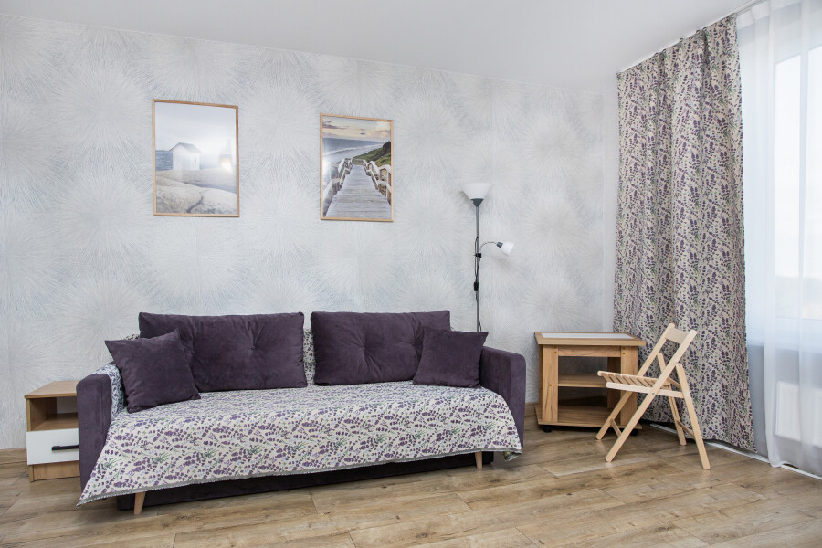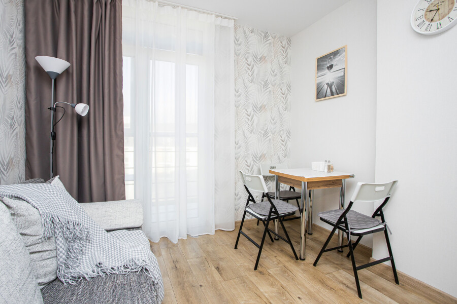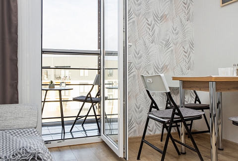 В номере: диван раскладной, зеркало, стол, стулья, шкаф, гладильная доска, кондиционер, микроволновая печь, набор посуды, плита электрическая, стиральная машина, сушилка для белья, телевизор ЖК, утюг, холодильник, чайный набор посуды, электрочайник