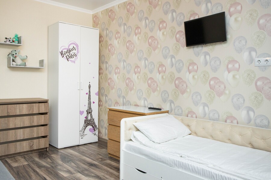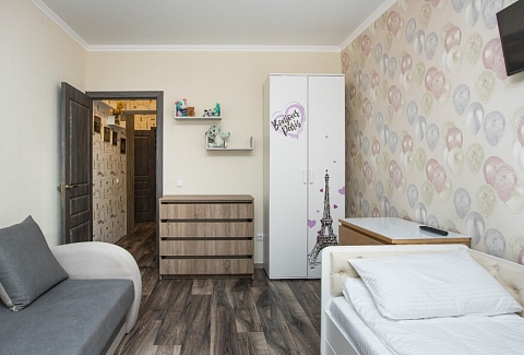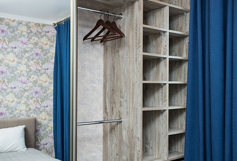 В номере: вешалка, диван, зеркало, кровать двуспальная, стол, стулья, шкаф, гладильная доска, духовой шкаф, микроволновая печь, набор посуды, плита электрическая, посудомоечная машина, стиральная машина, сушилка для белья, телевизор ЖК, утюг, холодильник, чайный набор посуды, электрочайник