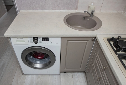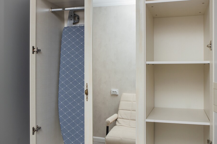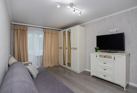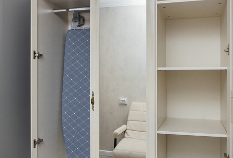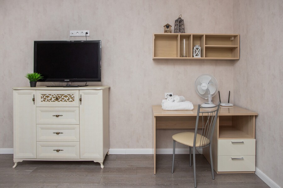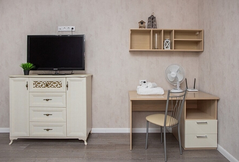 В номере: вешалка, диван раскладной, кресло, стол, стулья, шкаф, гладильная доска, духовой шкаф, микроволновая печь, набор посуды, плита газовая, стиральная машина, сушилка для белья, телевизор ЖК, утюг, холодильник, чайный набор посуды, электрочайник