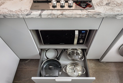 В номере: диван, зеркало, кровать двуспальная, прикроватные тумбочки, стол, стулья, шкаф, гладильная доска, микроволновая печь, мини-холодильник, набор посуды, стиральная машина, сушилка для белья, телевизор ЖК, утюг, холодильник, чайный набор посуды, электрочайник