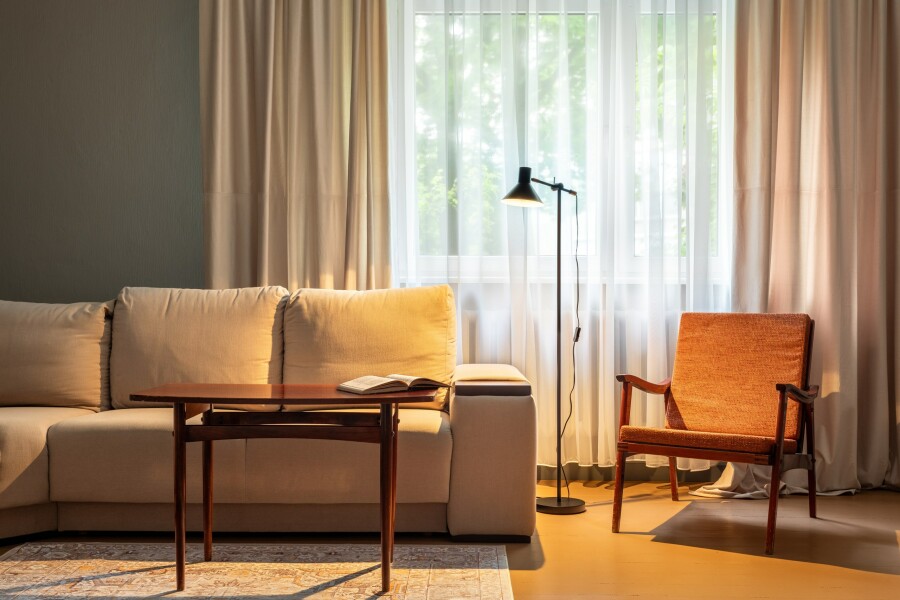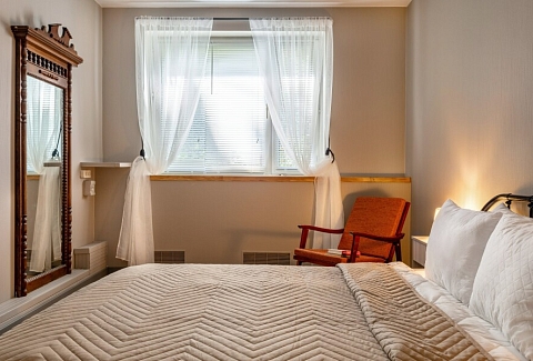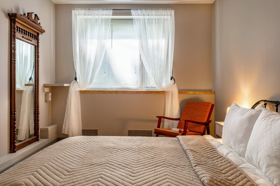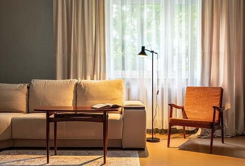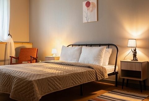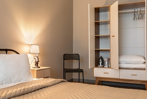 В номере: диван, зеркало, кровать двуспальная, стол, стулья, шкаф, микроволновая печь, мини-холодильник, набор посуды, плита газовая, стиральная машина, сушилка для белья, телевизор ЖК, утюг, холодильник, чайный набор посуды, электрочайник