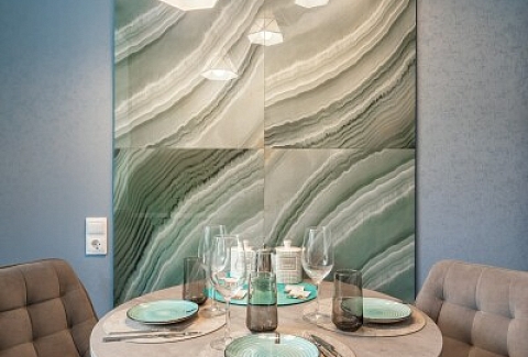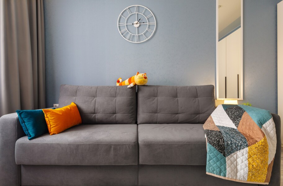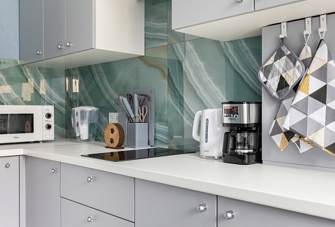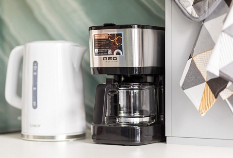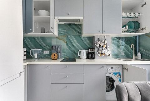В номере: диван, зеркало, стол, стулья, шкаф, микроволновая печь, набор посуды, плита электрическая, стиральная машина, сушилка для белья, телевизор ЖК, утюг, холодильник, чайный набор посуды, электрочайник
