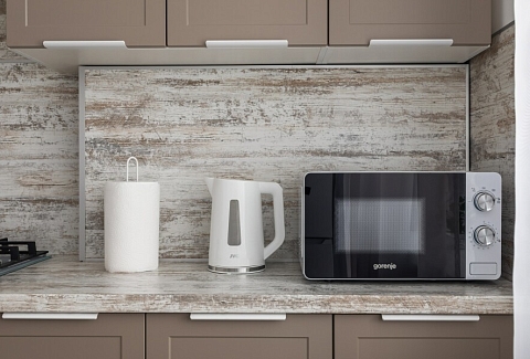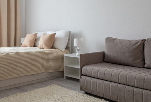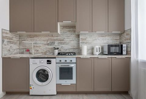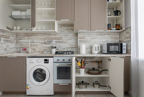В номере: диван, зеркало, кровать двуспальная, стол, стулья, шкаф, кондиционер, микроволновая печь, набор посуды, плита электрическая, стиральная машина, сушилка для белья, телевизор ЖК, утюг, холодильник, чайный набор посуды, электрочайник