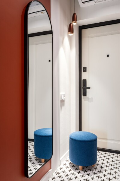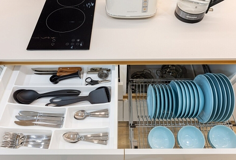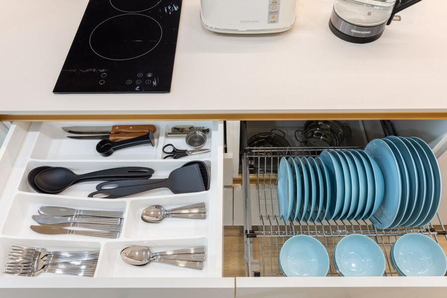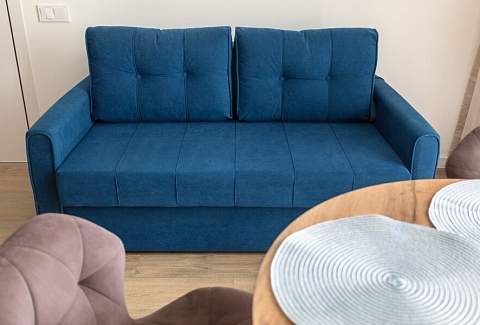 В номере: вешалка, диван, зеркало, кровать двуспальная, стол, стулья, шкаф, гладильная доска, духовой шкаф, кондиционер, микроволновая печь, набор посуды, плита электрическая, стиральная машина, сушилка для белья, телевизор ЖК, утюг, холодильник, чайный набор посуды, электрочайник