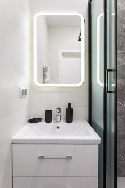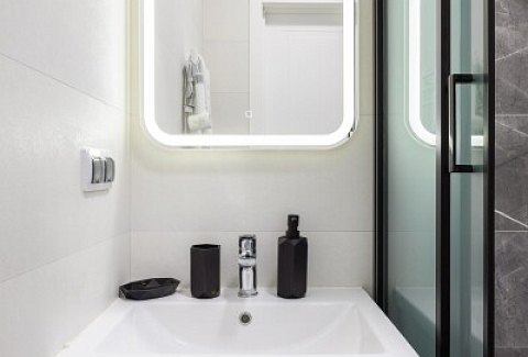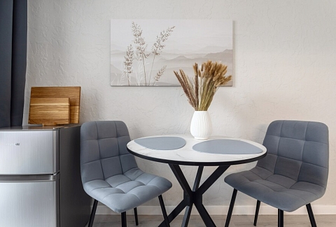 В номере: зеркало, кровать двуспальная, стол, стулья, шкаф, кондиционер, микроволновая печь, набор посуды, плита электрическая, стиральная машина, сушилка для белья, телевизор ЖК, утюг, холодильник, чайный набор посуды, электрочайник