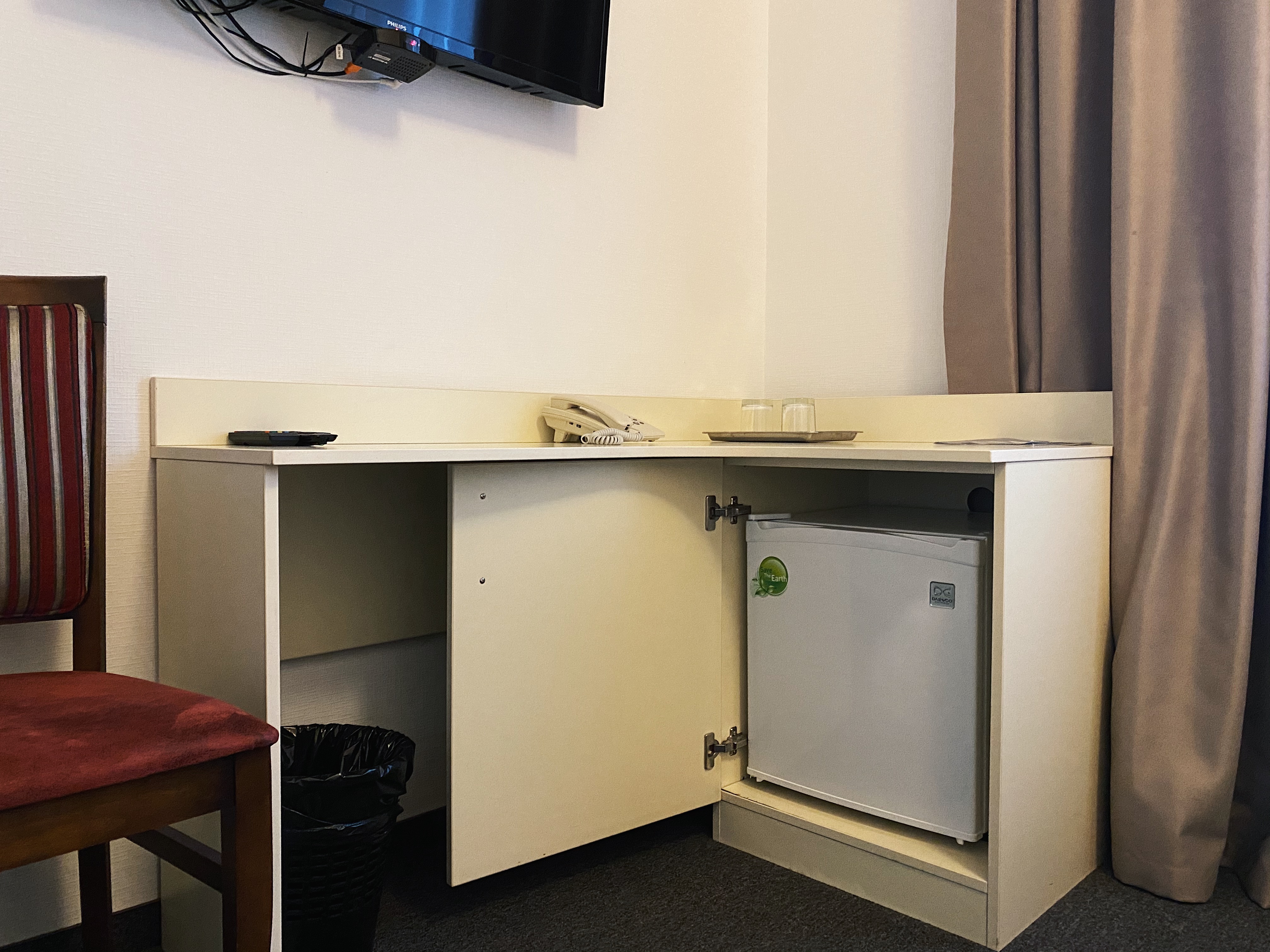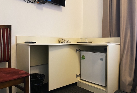 В номере: вешалка, зеркало, ковровое покрытие, кровати односпальные /одна двуспальная кровать, прикроватные тумбочки, стол, стул, шкаф, телевизор ЖК, холодильник