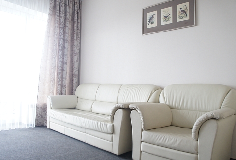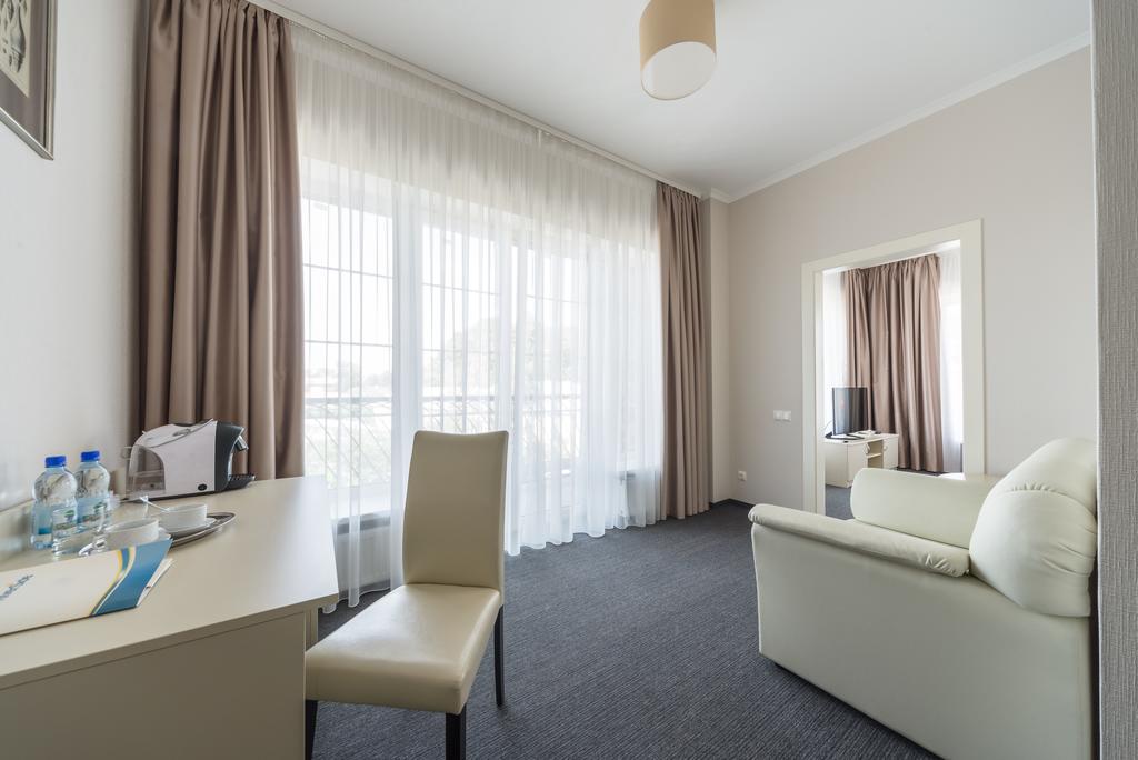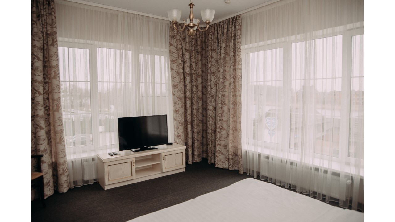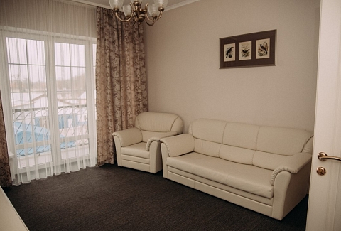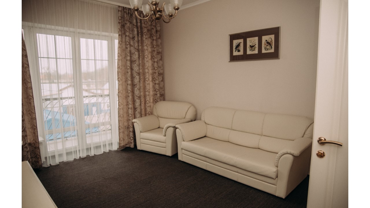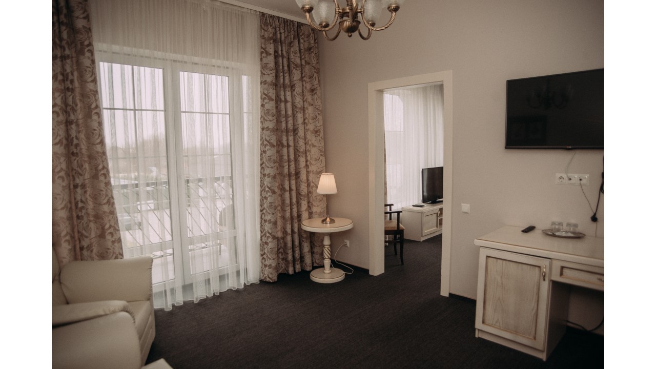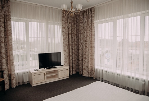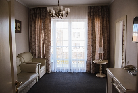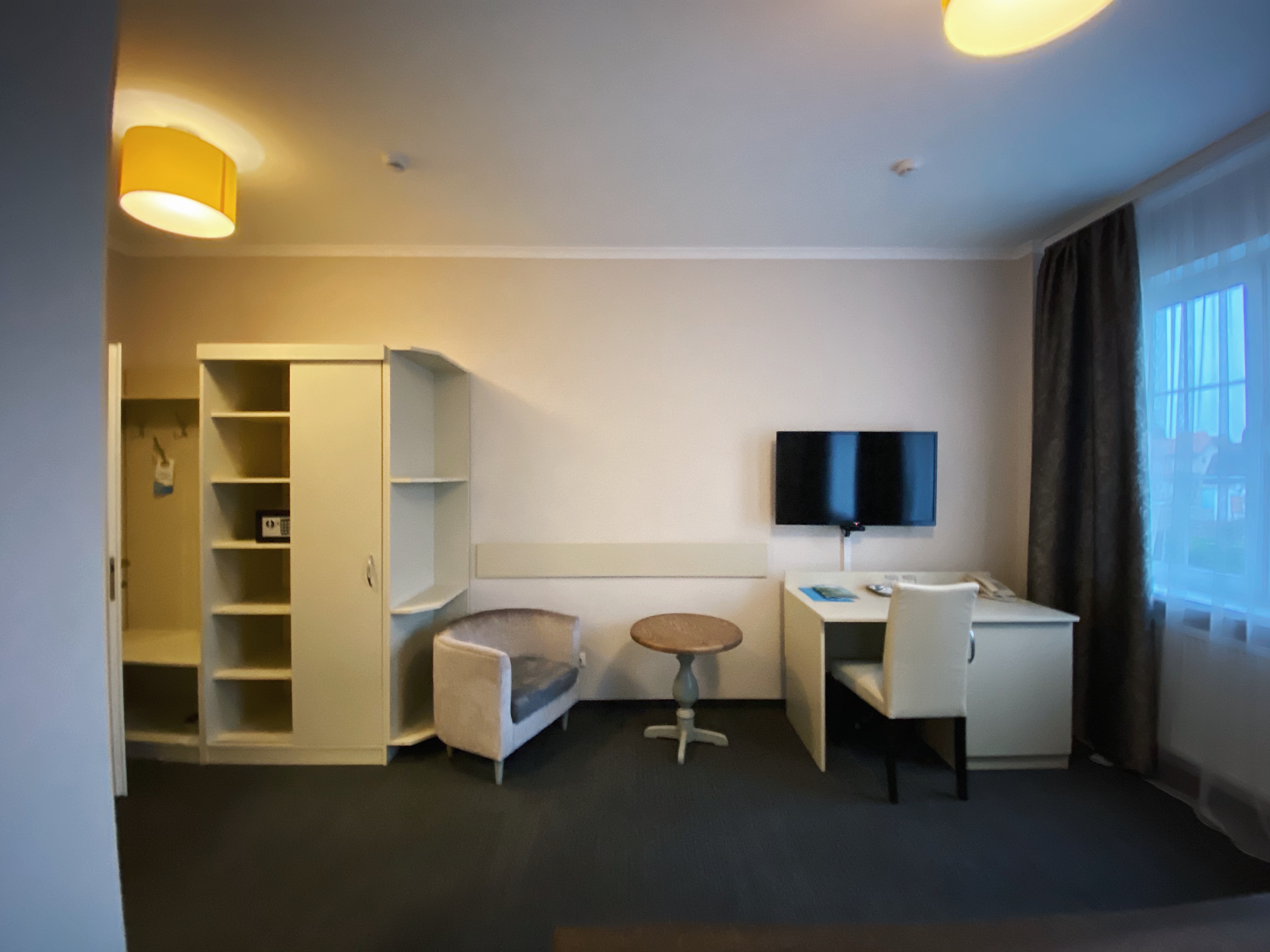 В номере: диван раскладной, зеркало, ковровое покрытие, кресла, кровать двуспальная, прикроватные тумбочки, стол, столик журнальный, стул, шкаф, телевизор, холодильник, чайный набор посуды, электрочайник